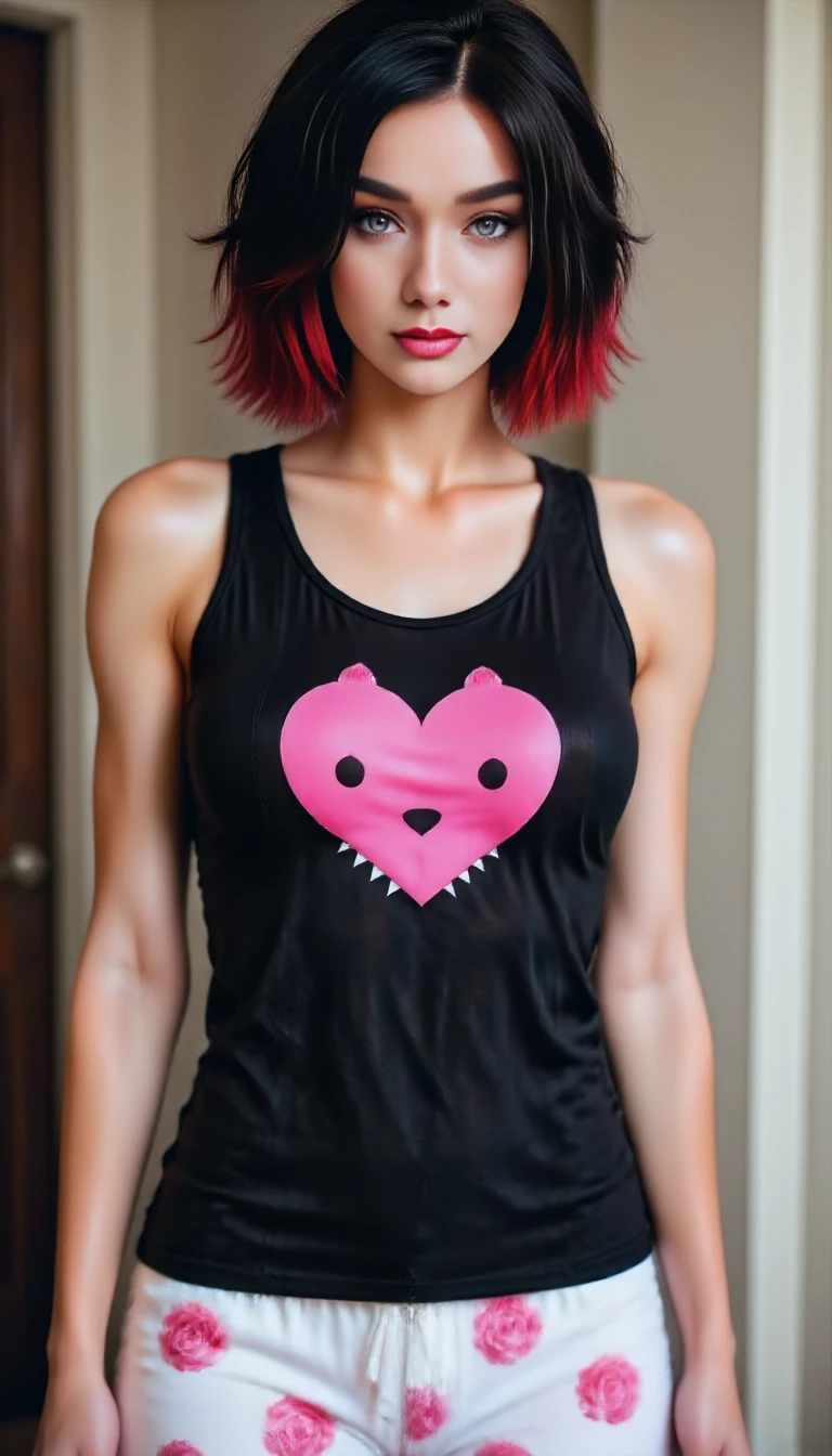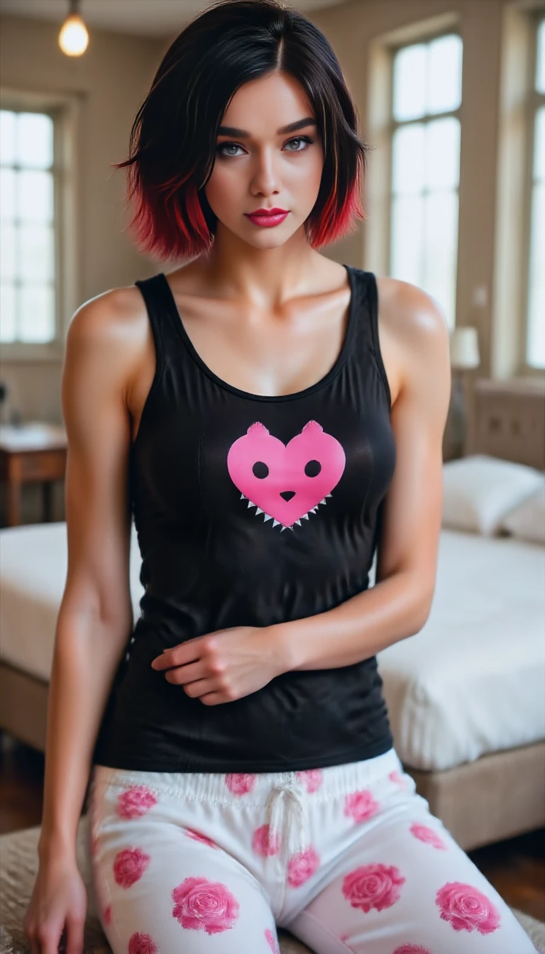 To create the pajama set, try: A photo of Ruby Rose (RWBY). She is wearing her Beacon pajama set. It is comprised of a black tank top with a pink logo and white pants with printed pink roses.