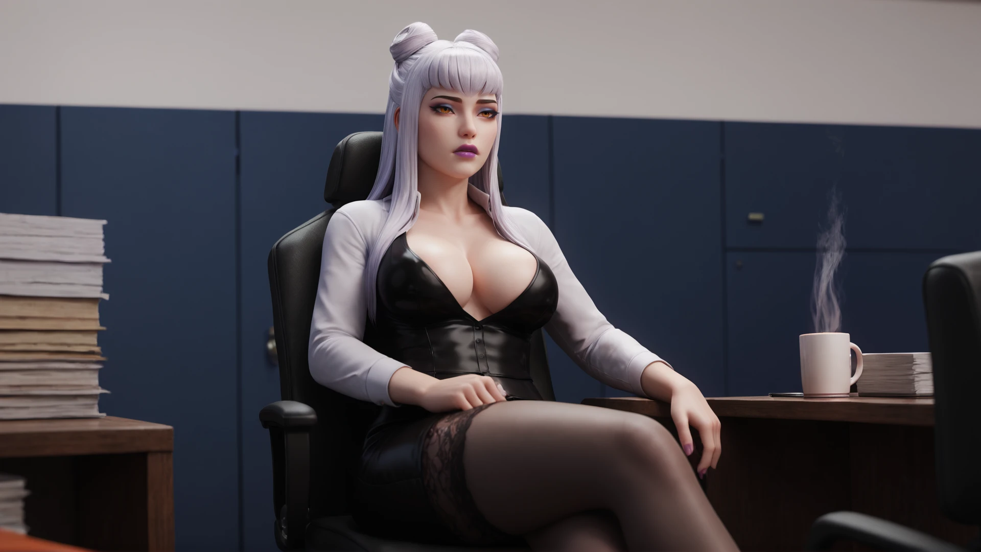 Tags for look : long hair, makeup, purple lips, white hair, grey hair, eyeshadow, lipstick, hair bun, orange eyes, mascara, bangs, hoop earrings