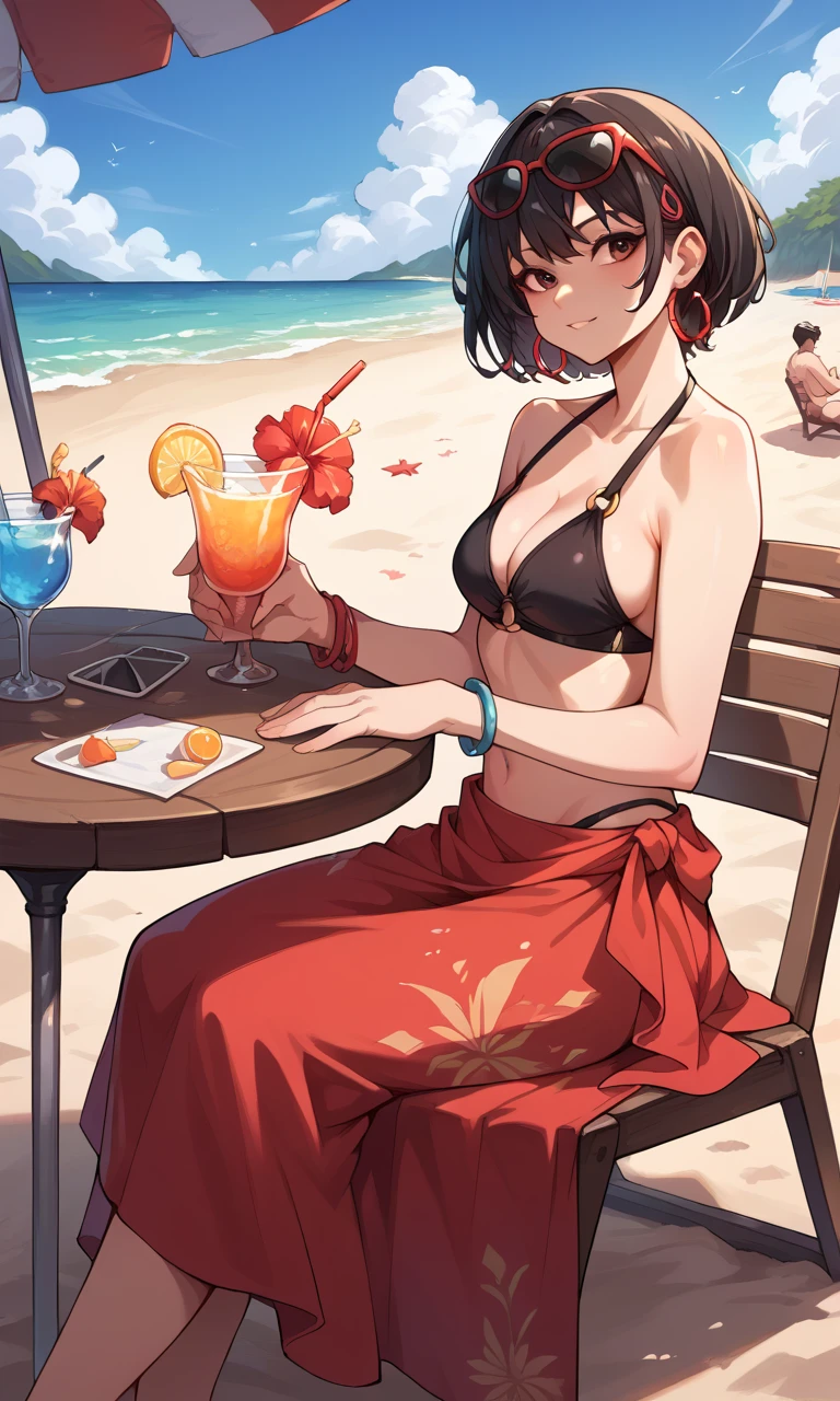 Use "eyewear on head, brown eyes" to remove her sunglasses. DO NOT use "brown eyes" alongisde, "sunglasses".