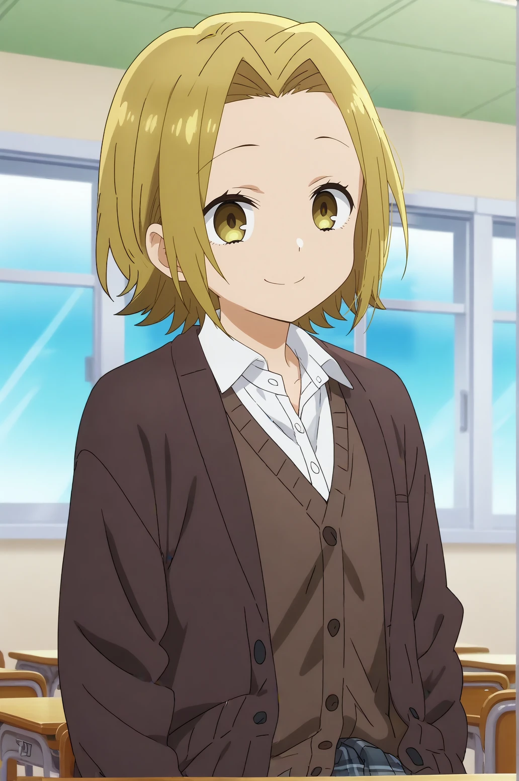 Triggers : yuki yoshikawa,short hair,brown hair,brown eyes,cardigan, school uniform