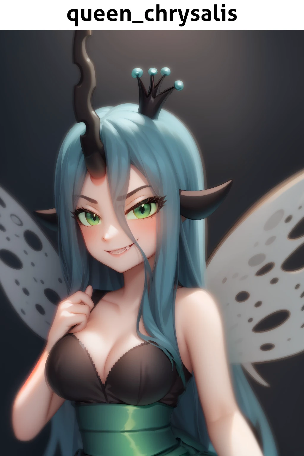 Queen Chrysalis has been trained on vest amount of various tags. Main trigger is queen_chrysalis, with additional chrysalis crown, chrysalis horn, and chrysalis ears. Beside these there are also other tags that were fined tuned to give a specific look for Chrysalis. Continue reading to learn more.
