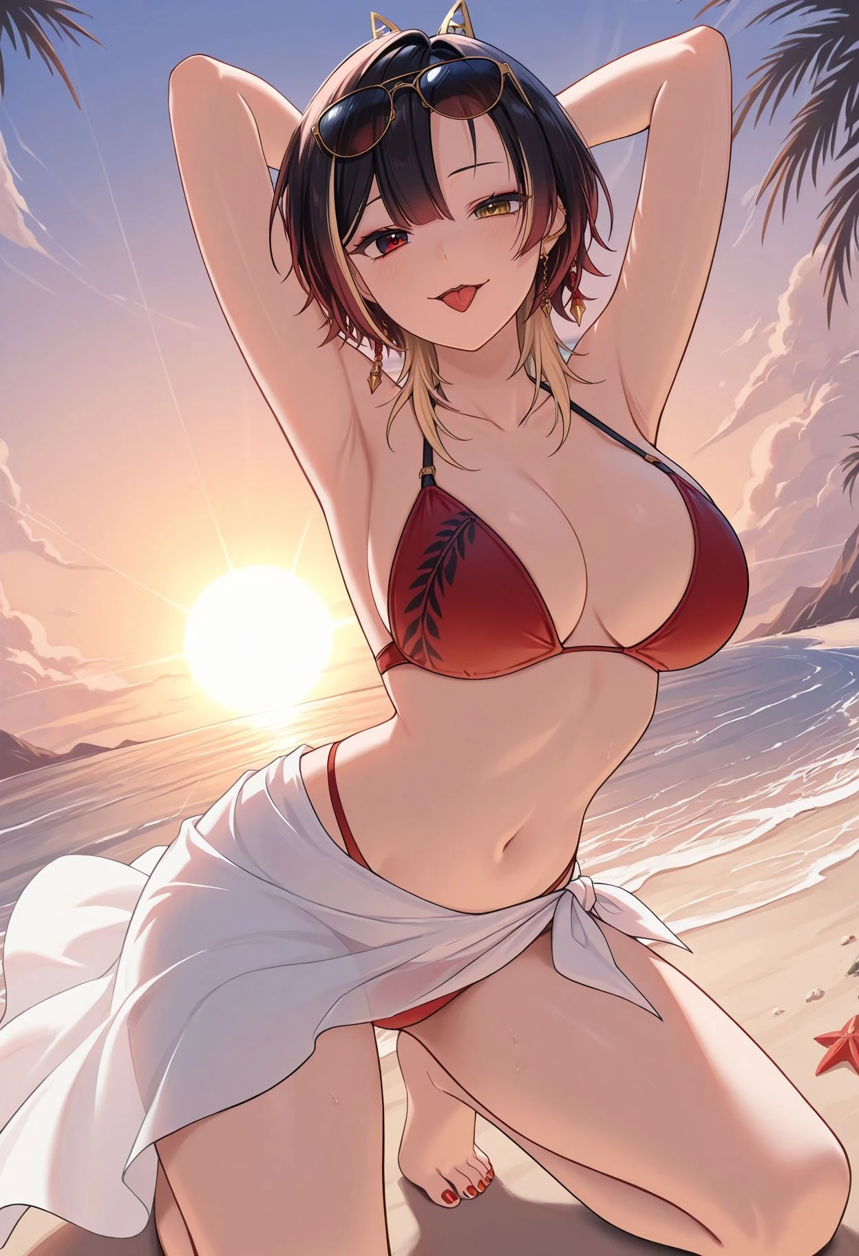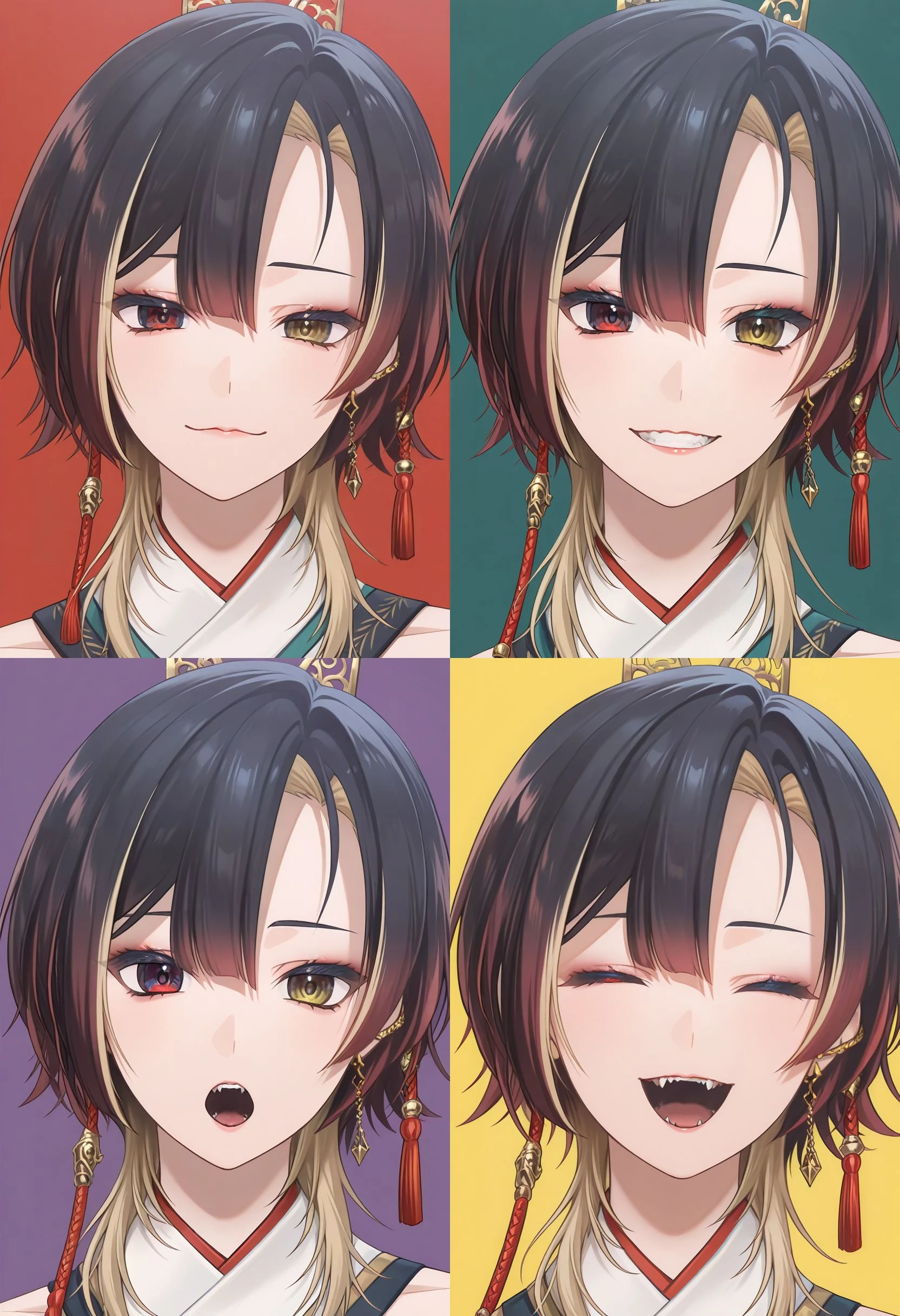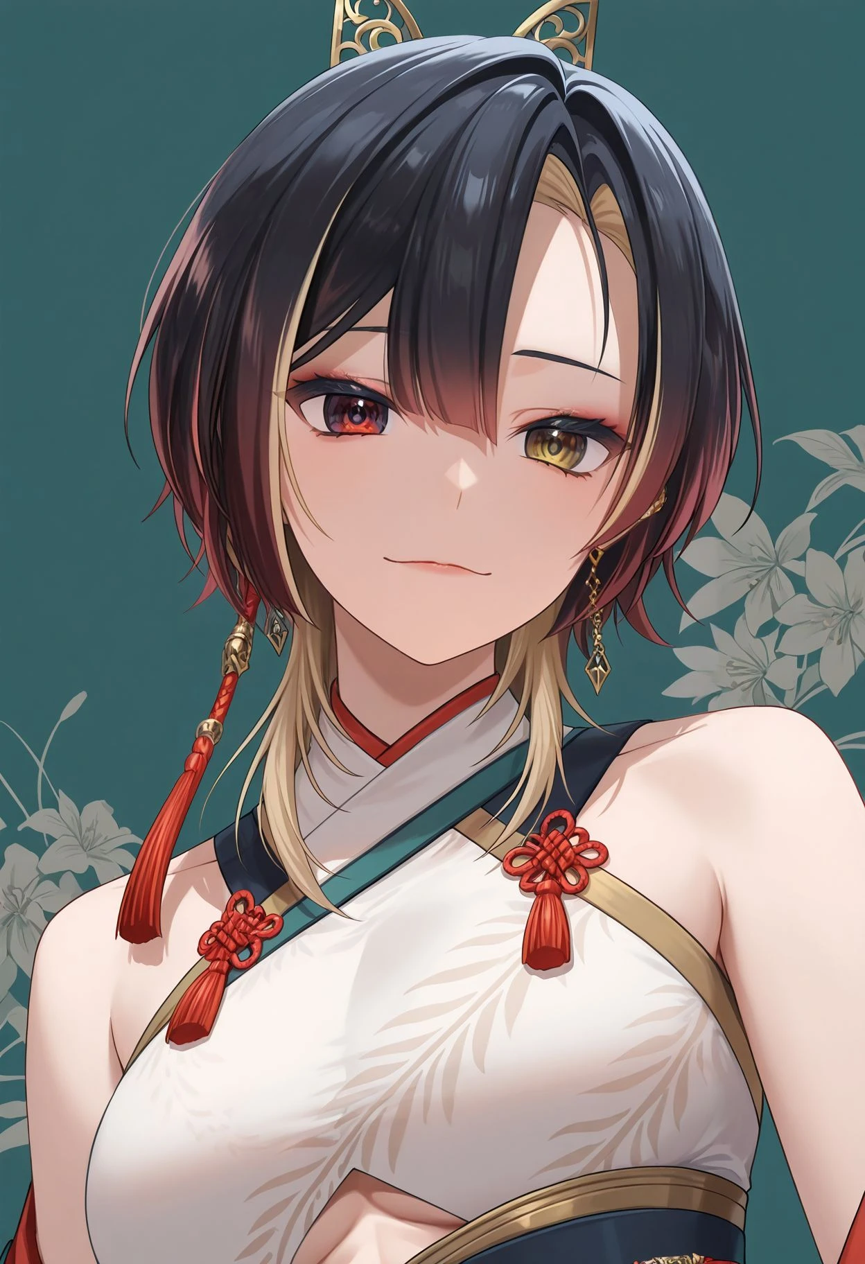 kannagiloki, heterochromia, earrings, hairband, red nails