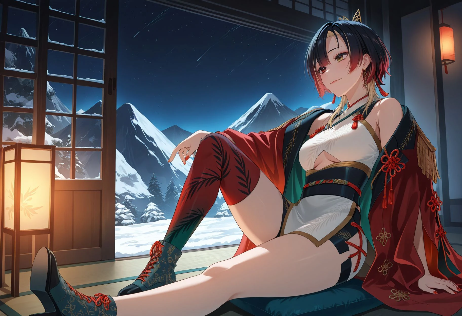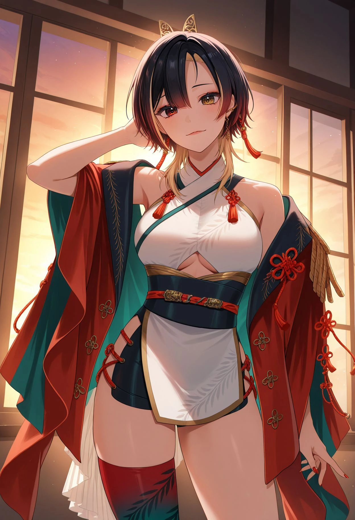 white dress, underboob cutout, sleeveless dress, red robe, open robe, off shoulder, epaulettes, white frill, black microskirt, side slit, single thighhigh, two-tone legwear, gradient legwear, high heel boots