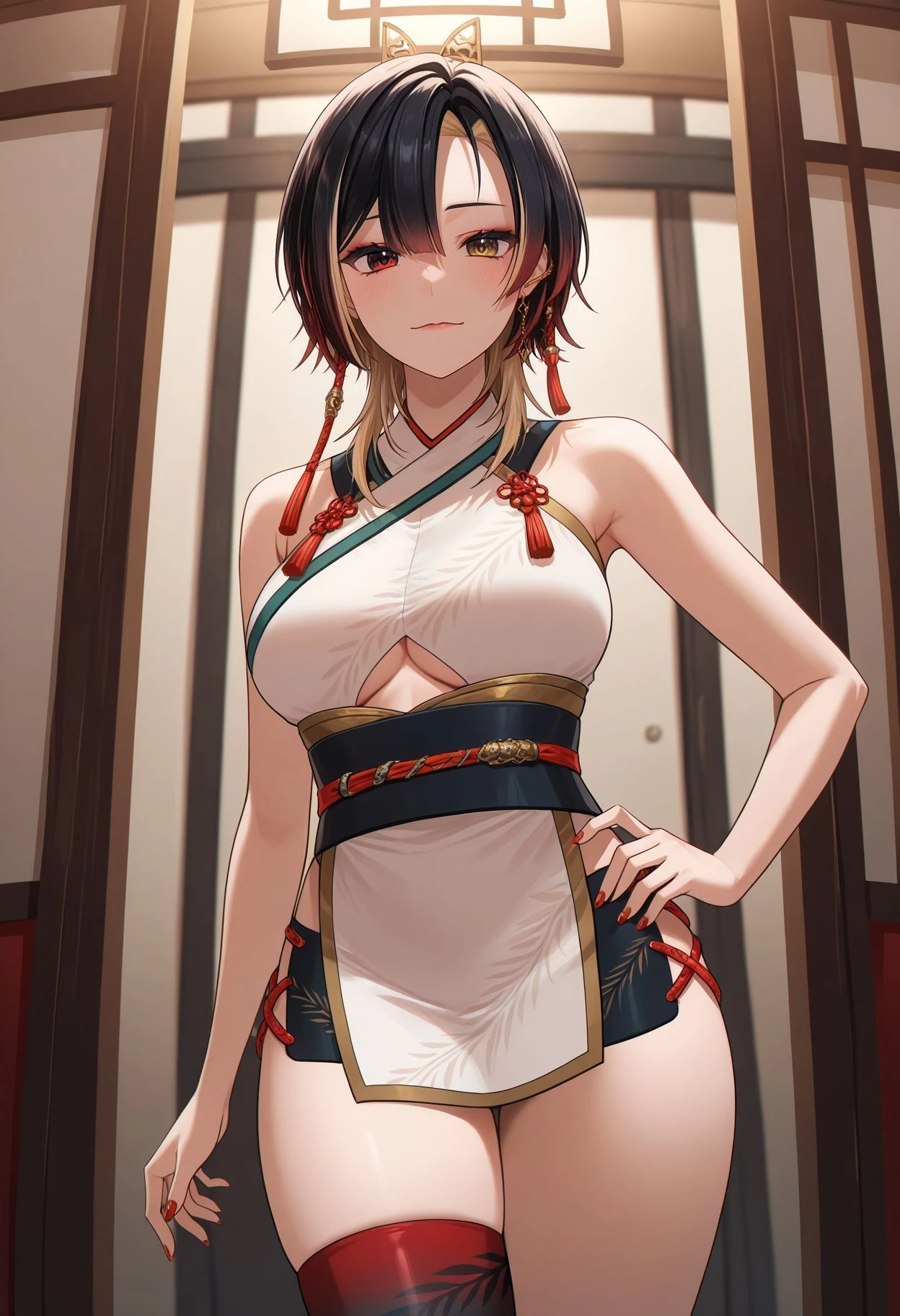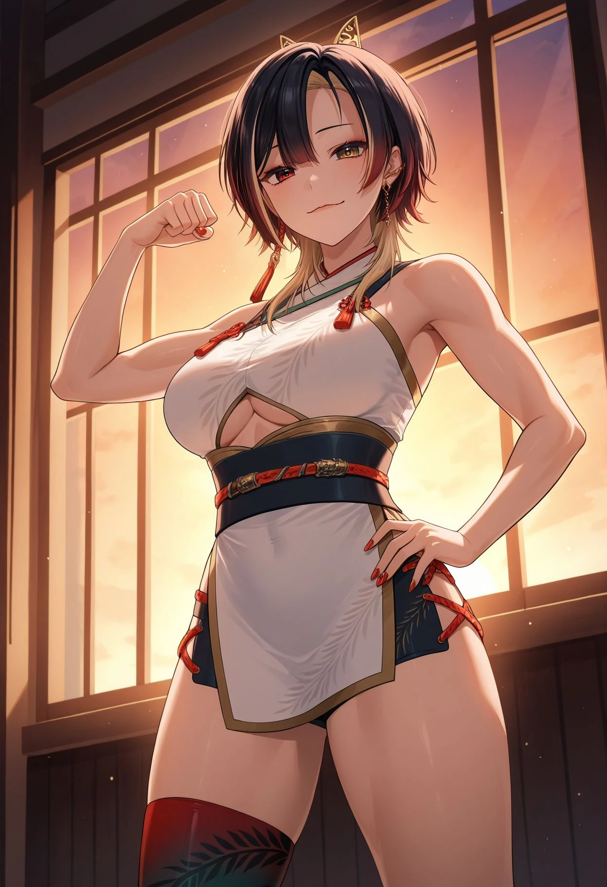 white dress, underboob cutout, sleeveless dress, bare arms, black microskirt, side slit, single thighhigh, two-tone legwear, gradient legwear, high heel boots