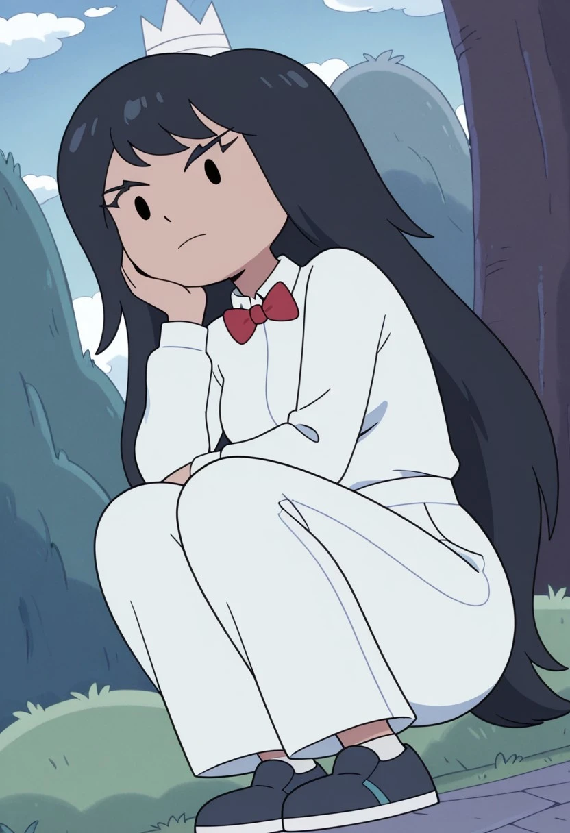 IceCreamQueen,olive skin,long hair,black hair,black eyes,white clothes,collared shirt,pants,red bowtie,white crown