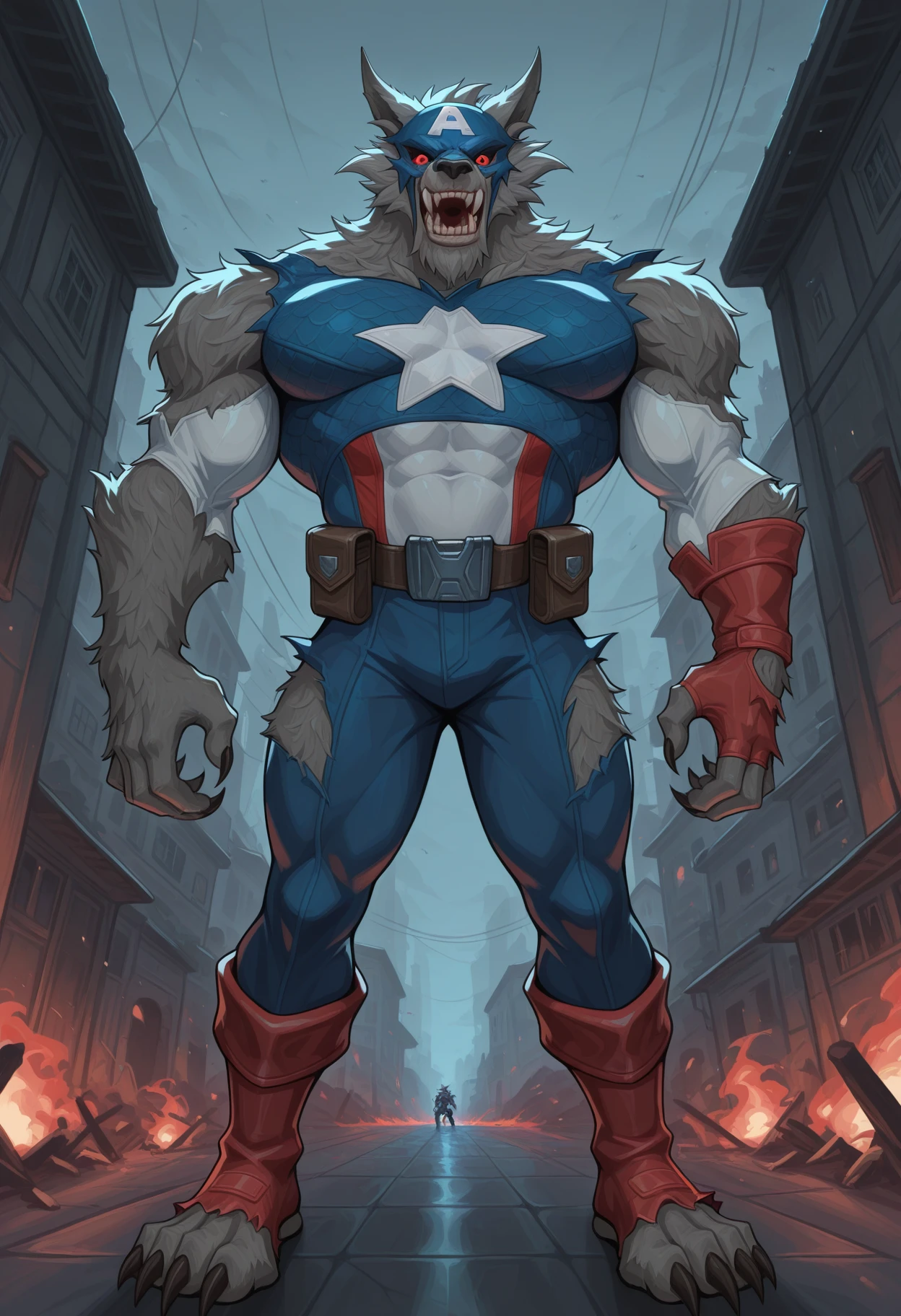 Trigger words: c4pw0lf, werewolf, grey fur, red sclera, captain's mask, captain's outfit, captain's fingerless gloves, captain's boots, captain's utility belt,