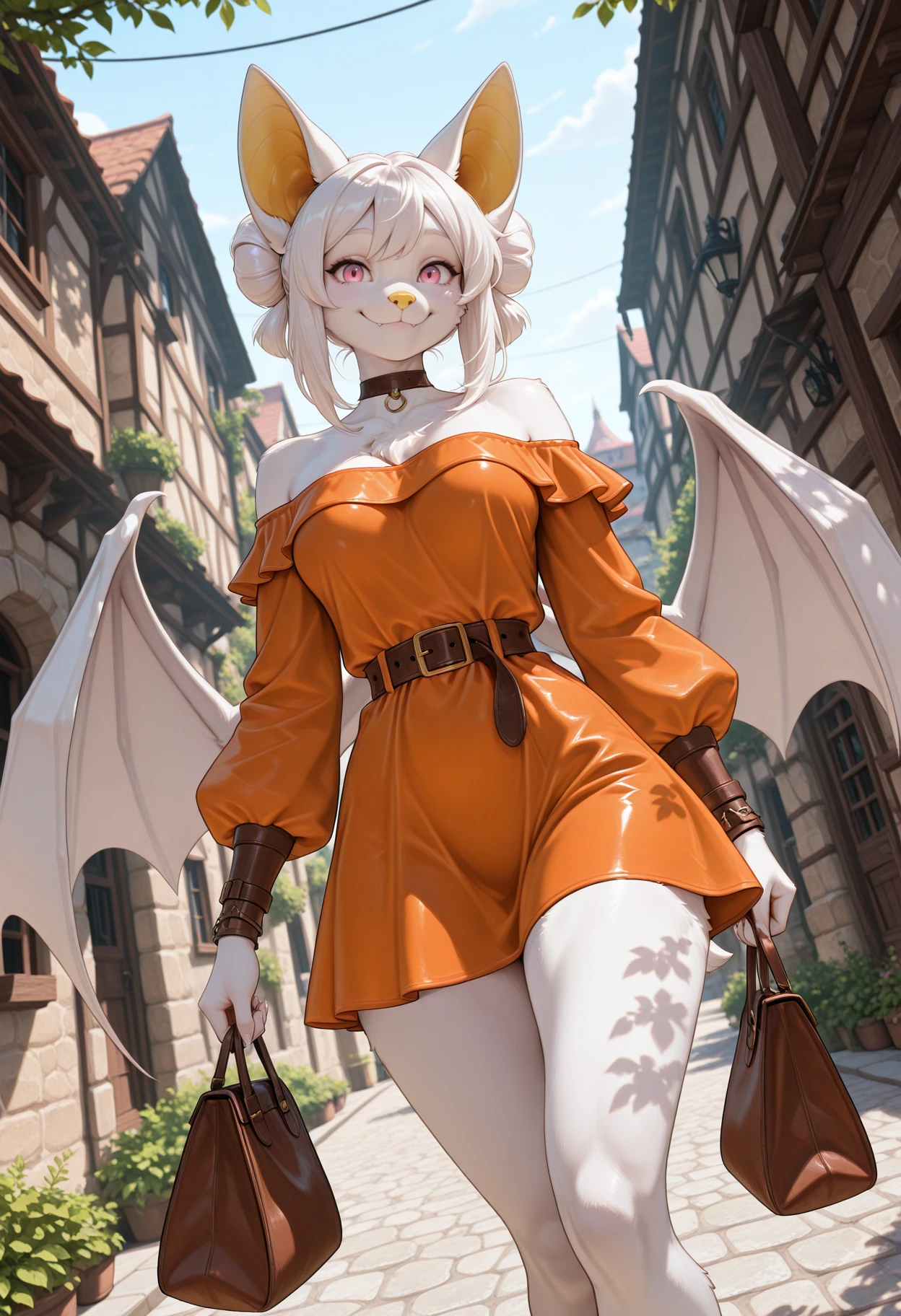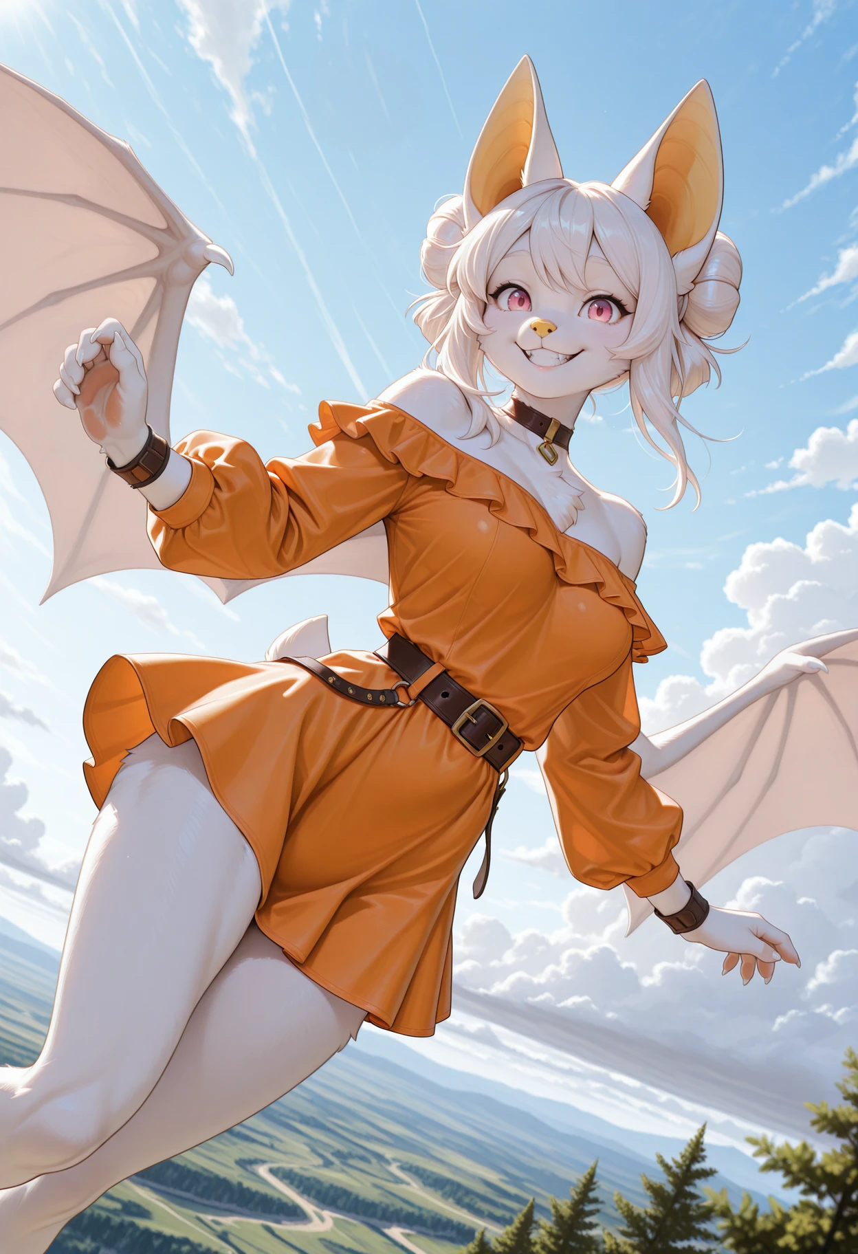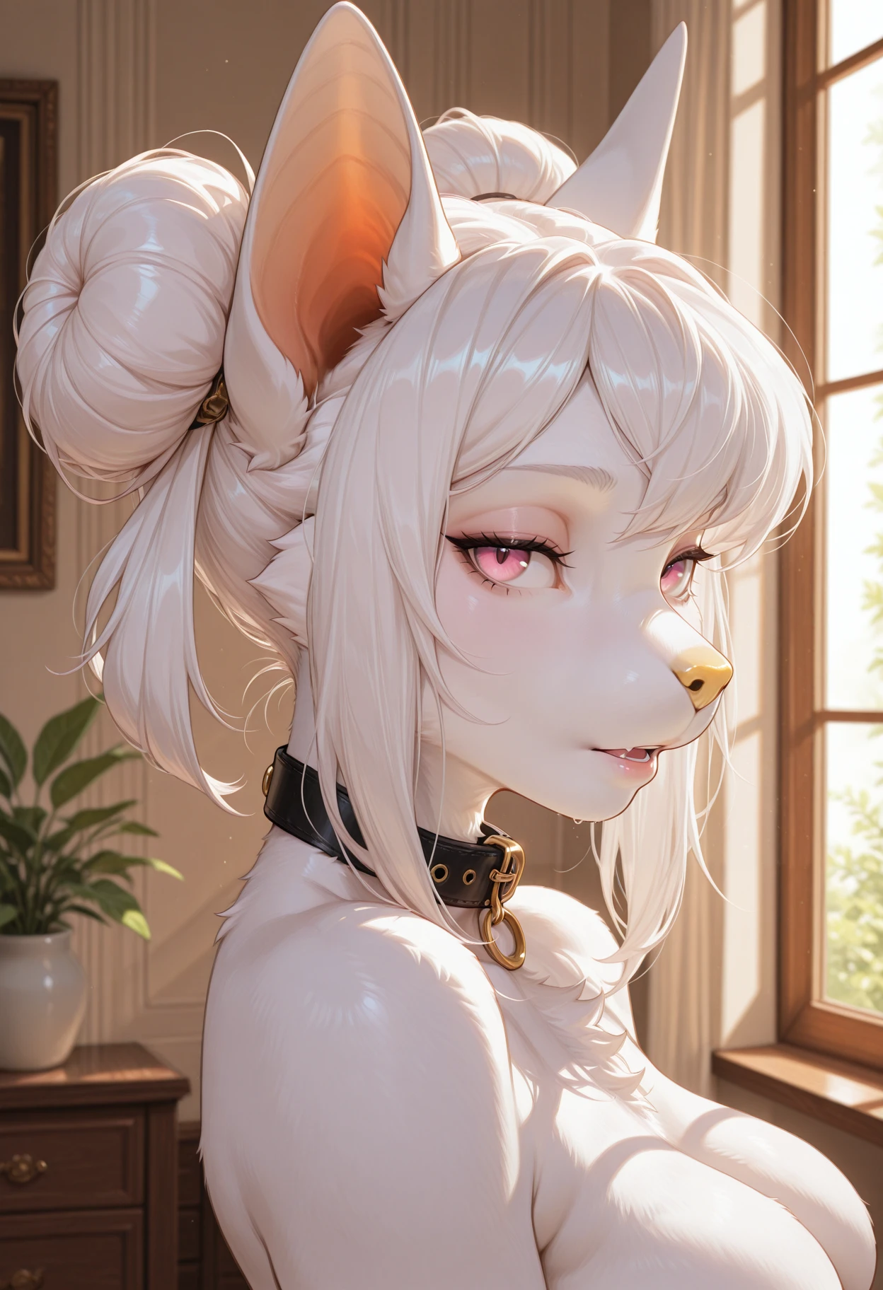 Bethany - furry, bat anthro, white fur, pink eyes, yellow nose, white hair, hair buns, slim body, medium breasts, White bat ears, white claws, White bat wings, short tail, Naked, Pussy,