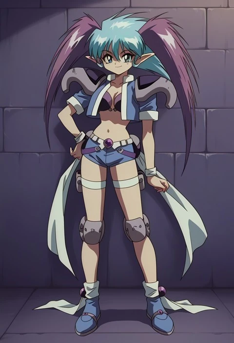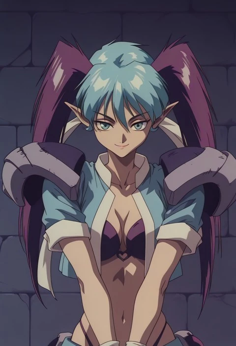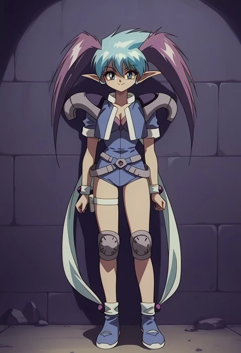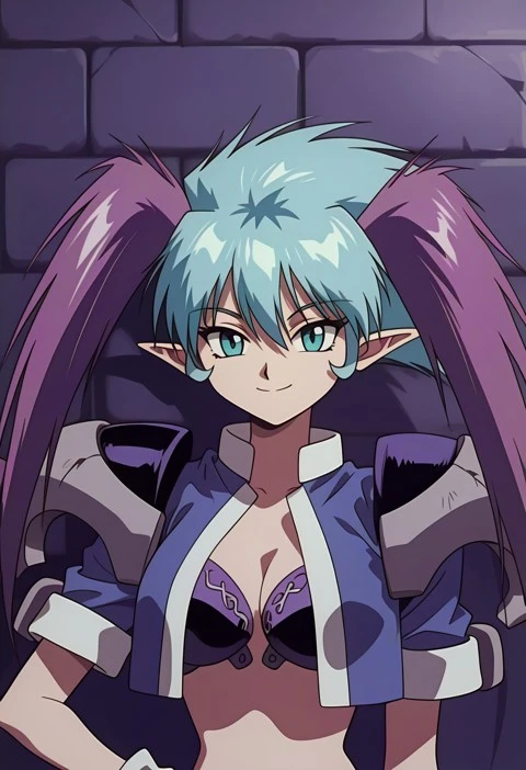 Aqua eyes, aqua hair, purple twintails, bangs, Long hair, long aqua hair, multicolored hair, two-tone hair, hair between eyes, spiked hair, pointy ears, long pointy ears, elf,