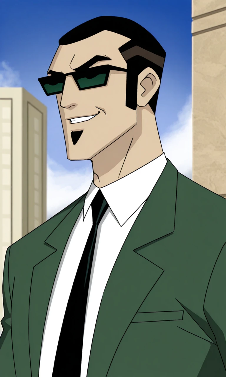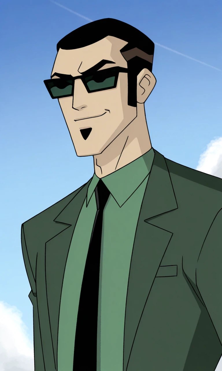 GrAgentS,1boy,solo,male focus,black hair,short hair,sunglasses, goatee, formal,green jacked,open jacket,black necktie,belt,green pants