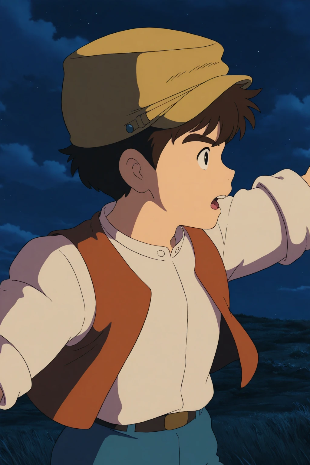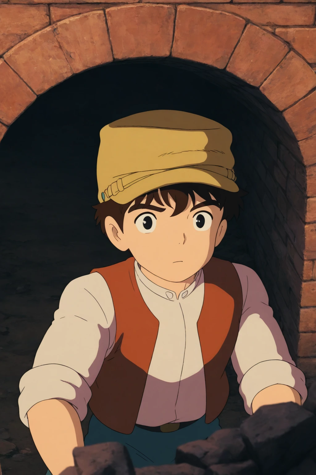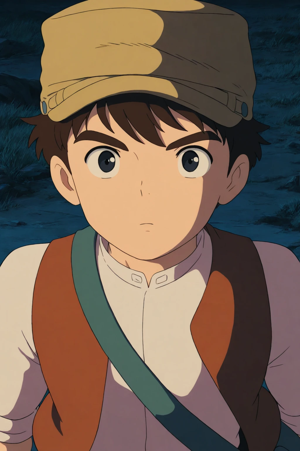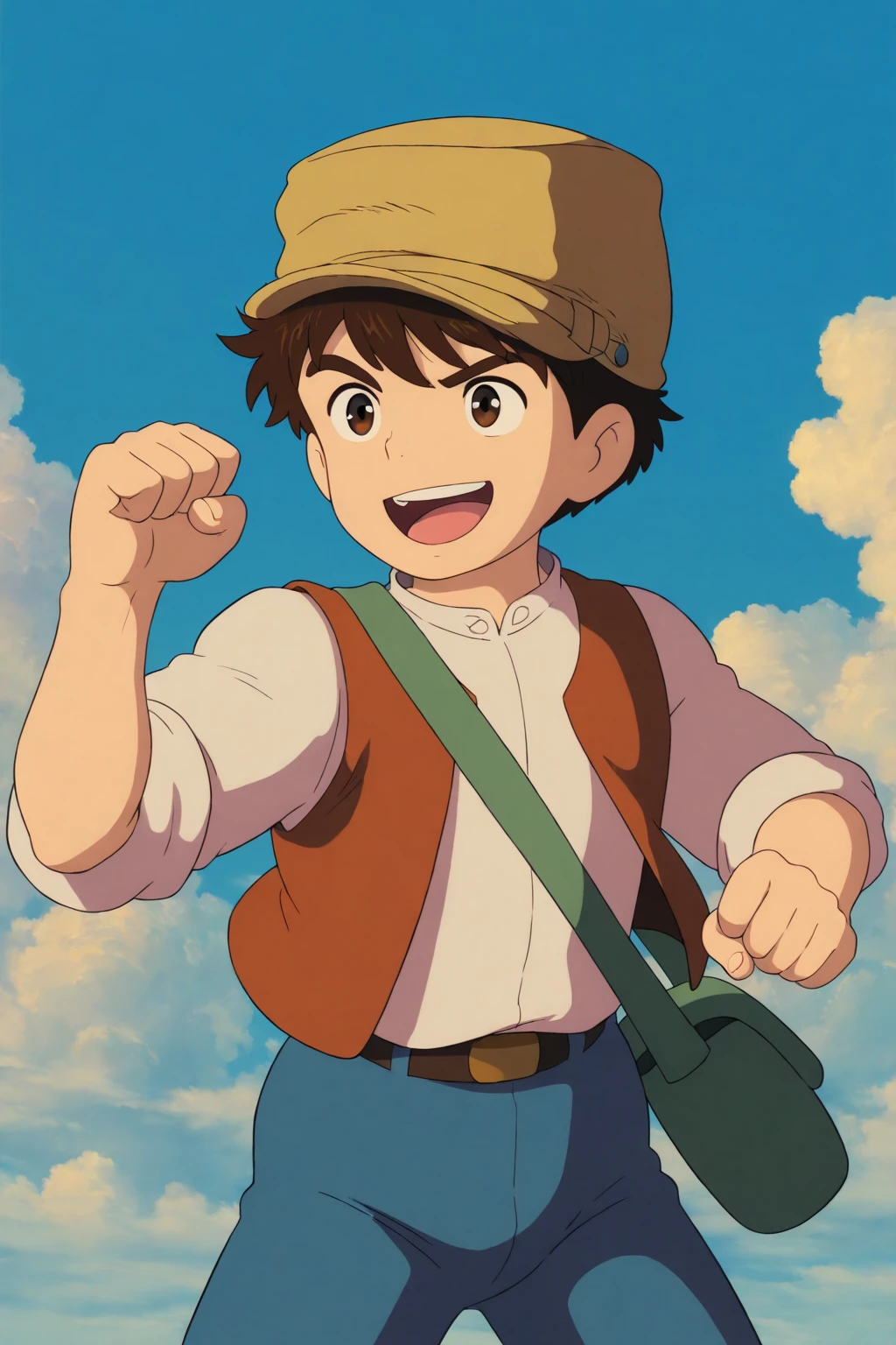 basi,black eyes,brown hair,short hair,spike hair,White long sleeves,rolled up sleeves,vest,1boy,hat,shirt,short sleeves,solo,upper body,white shirt,blue pants,belt,shoulder bag,