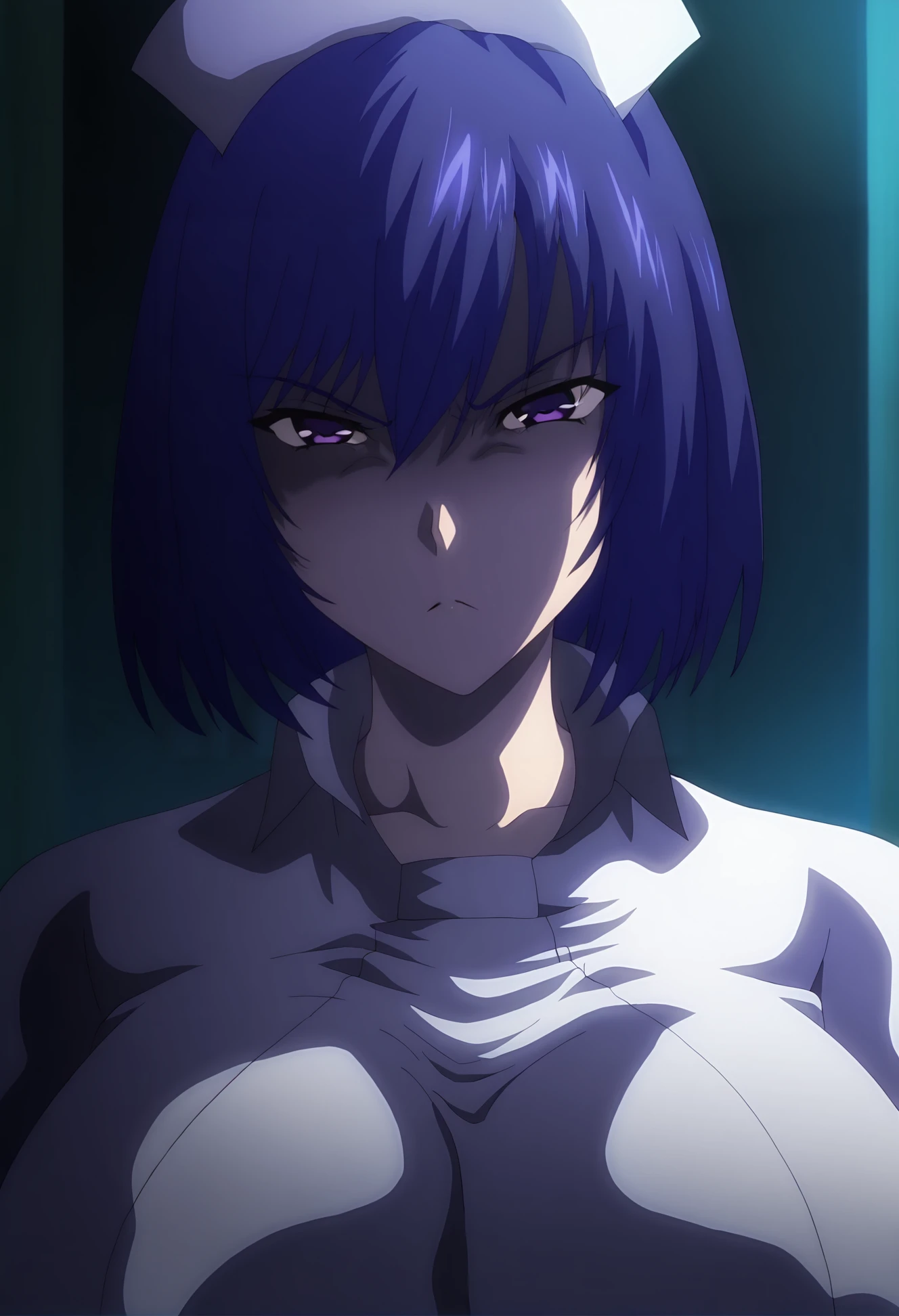 Tachibana,1girl,solo,nurse cap,nurse,huge breasts,short hair,purple eyes,blue hair,gloves,