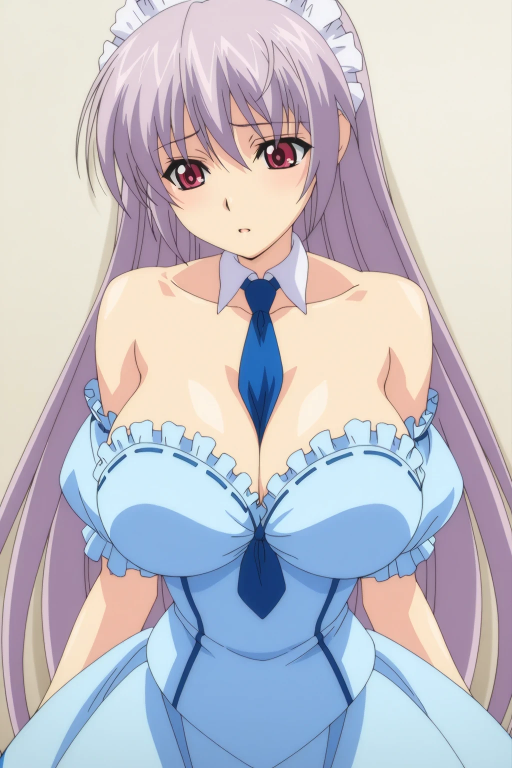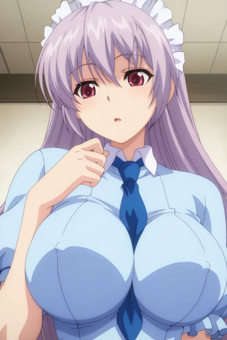 1girl, Aya, long hair, large breasts, light_purple_hair, pink eyes, necktie, blue dress, maidheaddress,