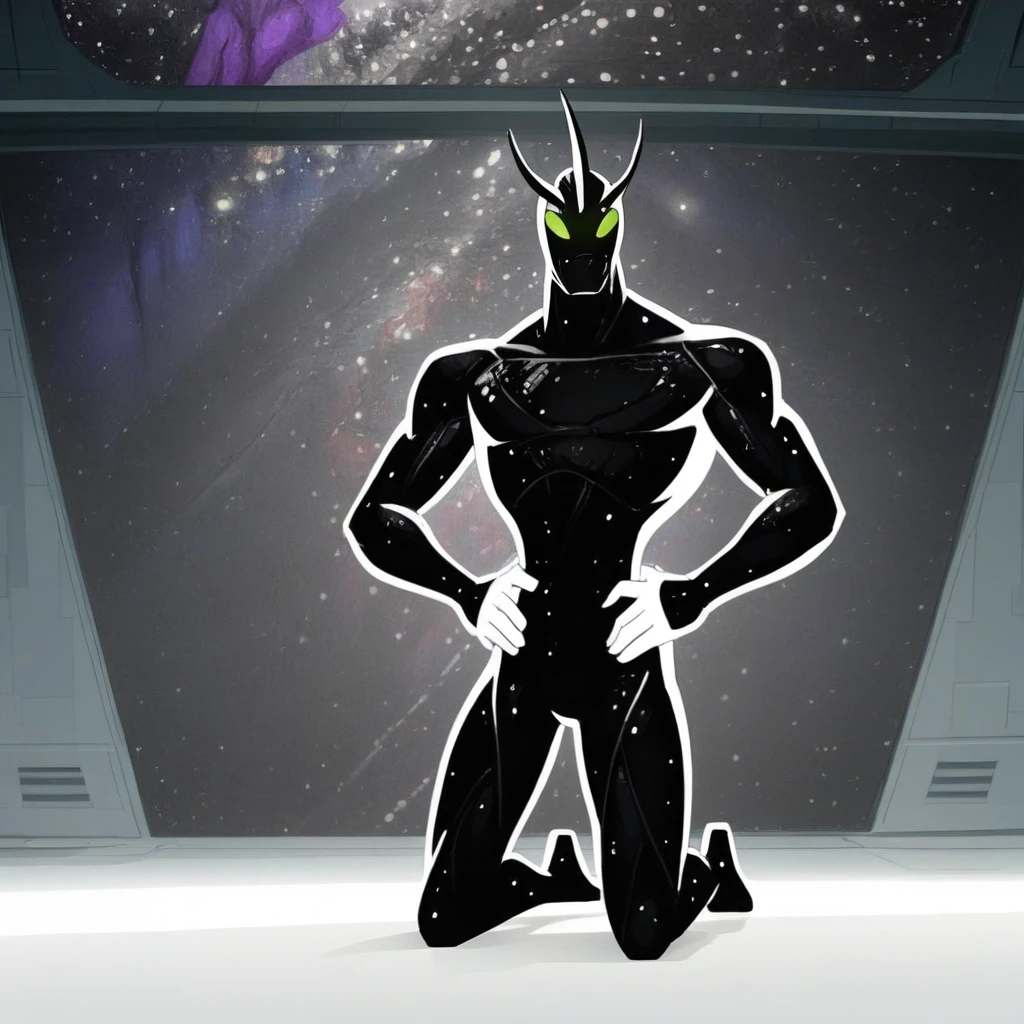 alien X, alien, black body, no mouth, no nose, no pupils, green eyes, antennae,