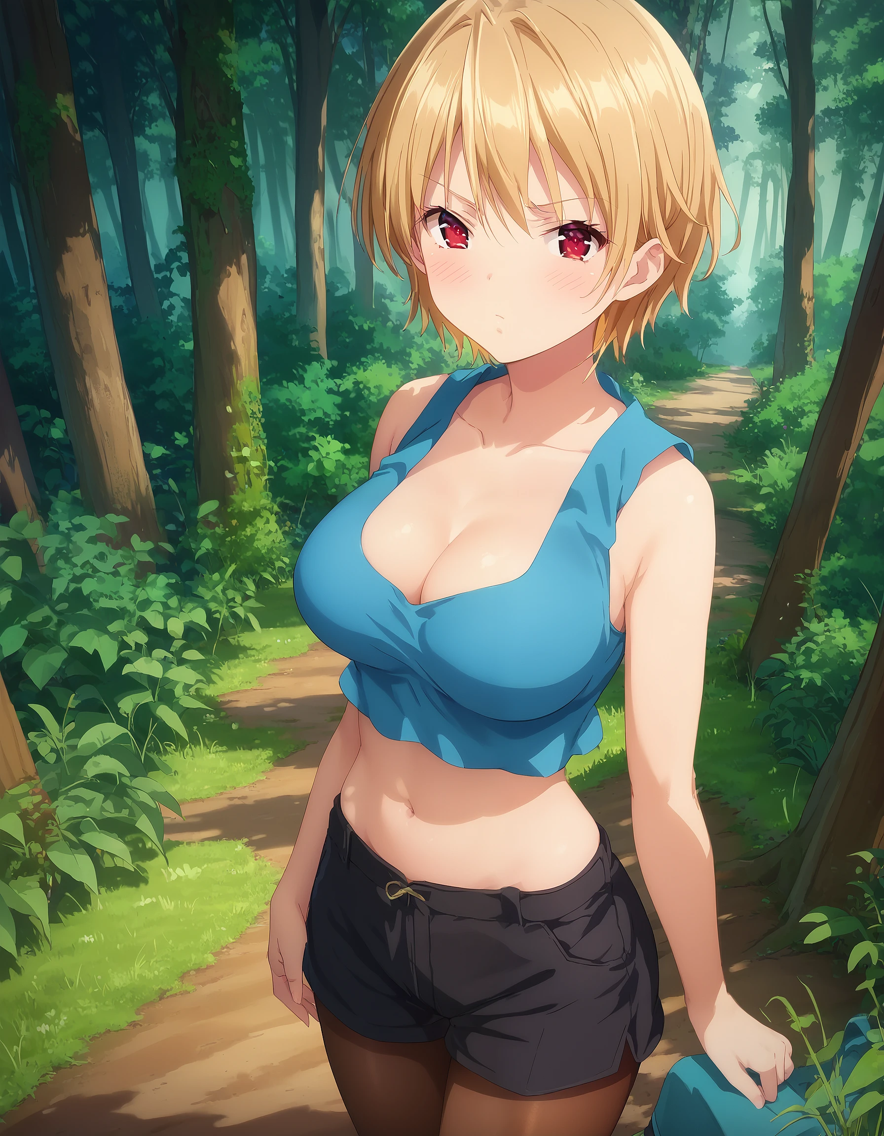 blue blouse, cleavage, collarbone, sleeveless, navel, black shorts, pantyhose,