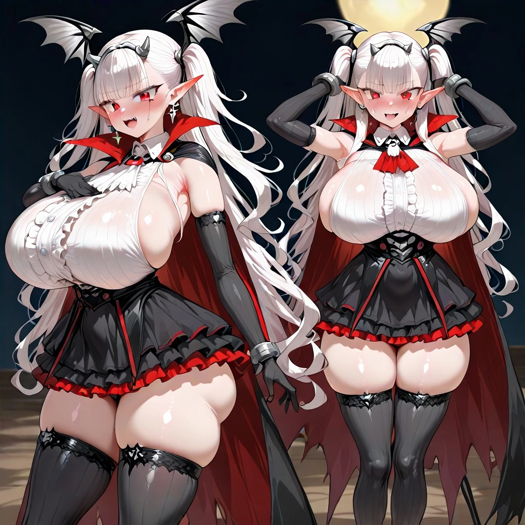 Red eyes, twin tails, white hair,Dracula, huge breasts, red frilly skirt, elf ears, long socks, cape, long black gloves, horns, bat wings on her head, tank top