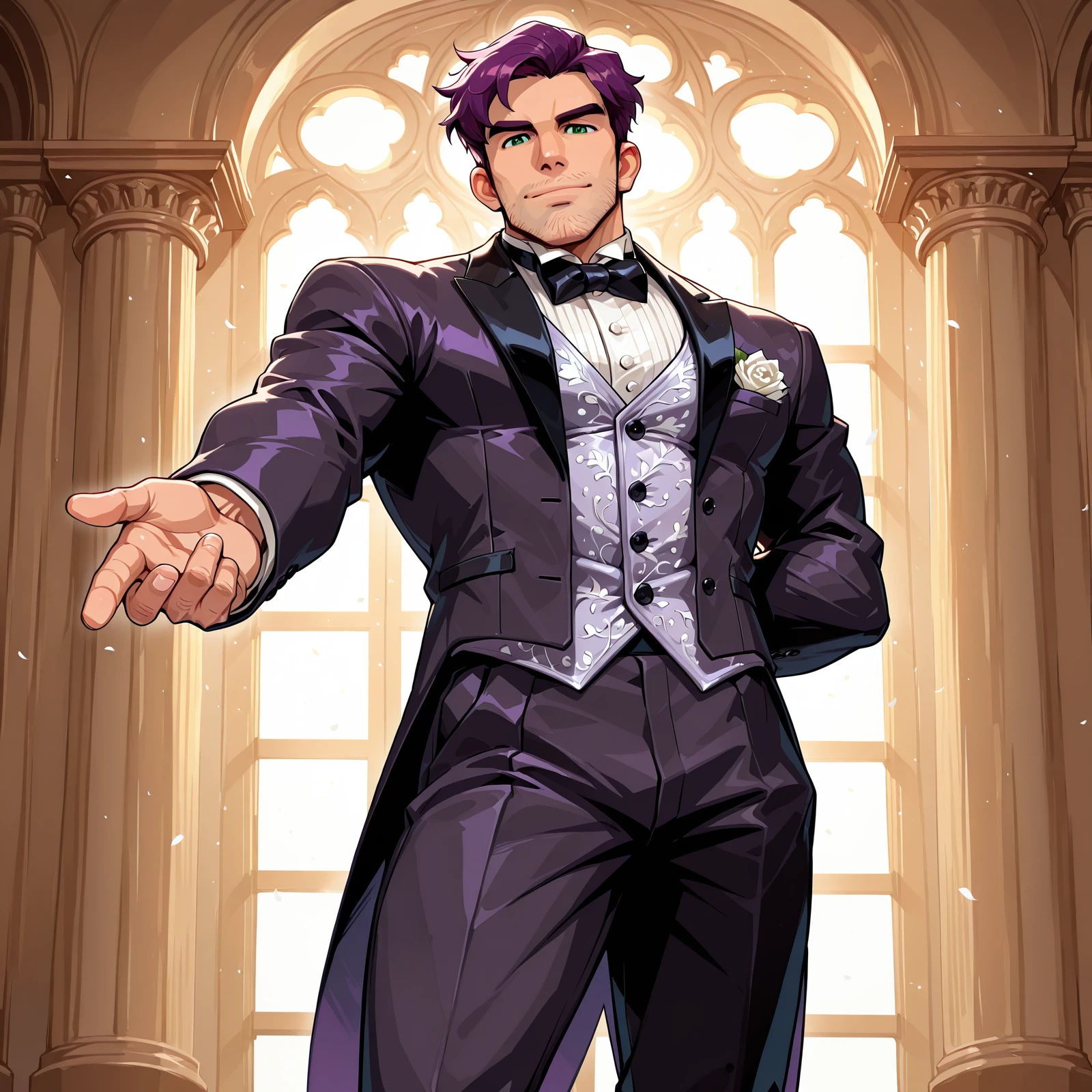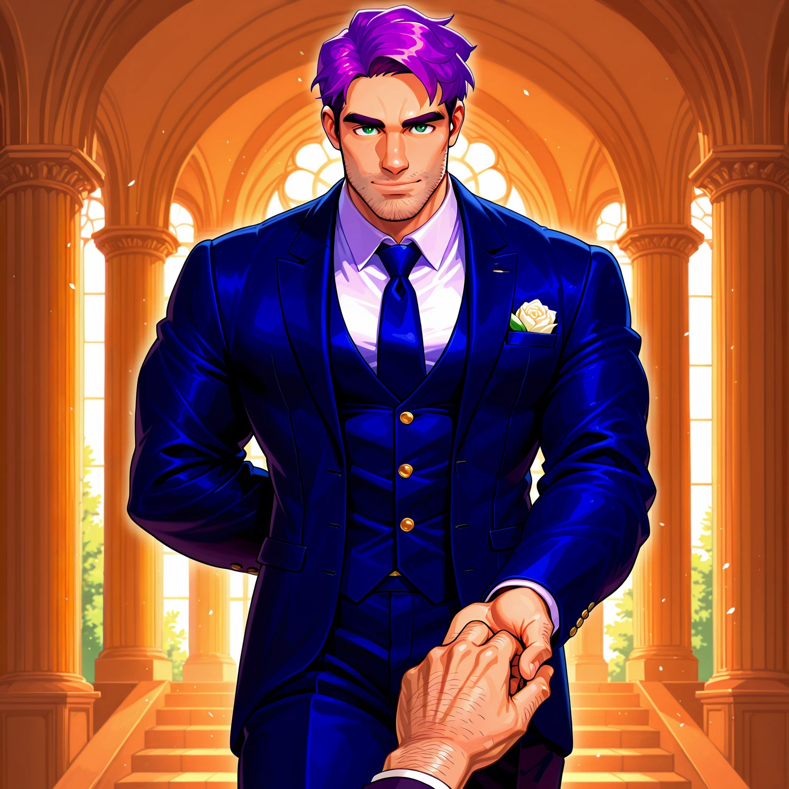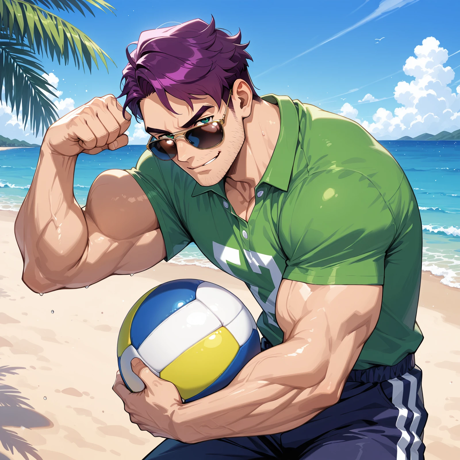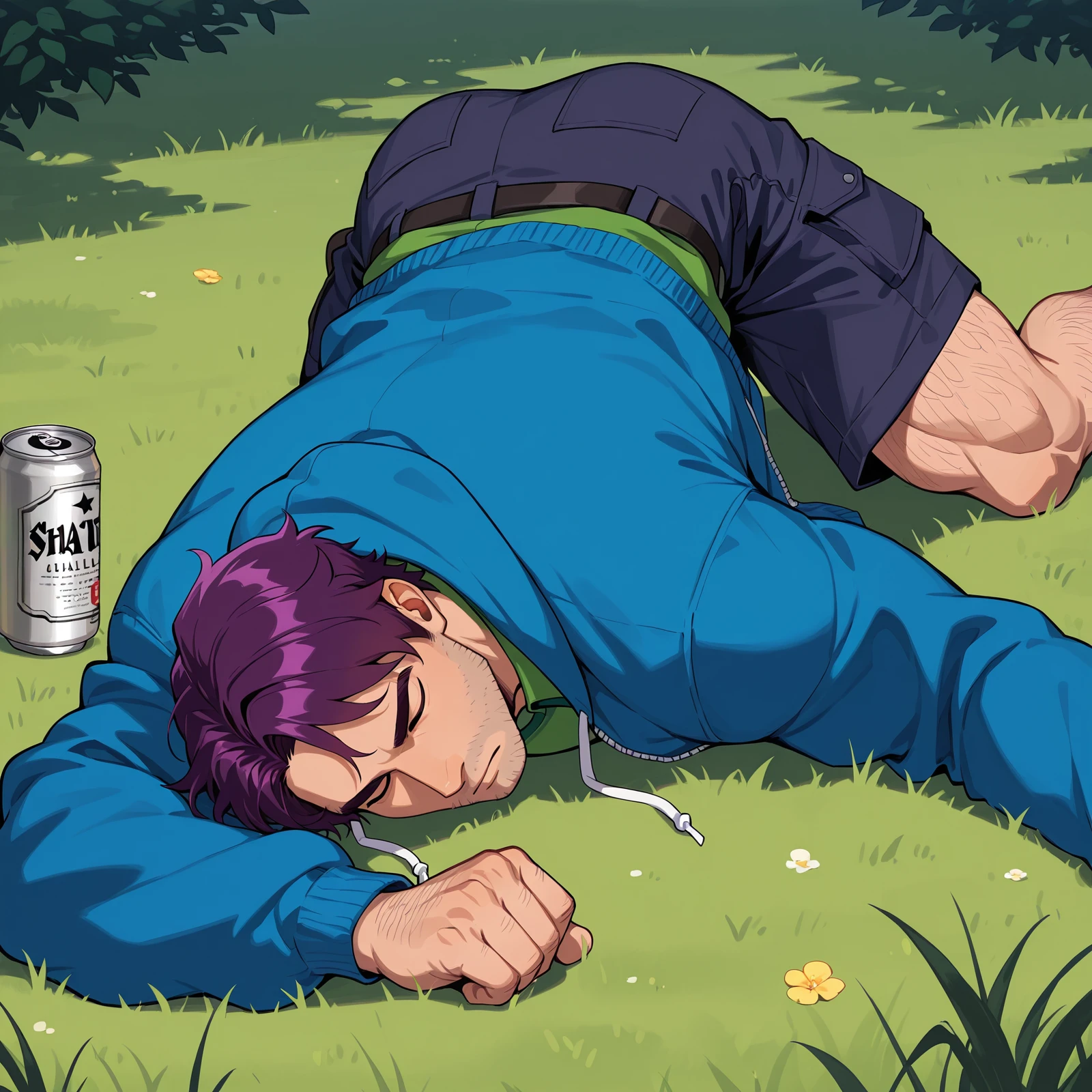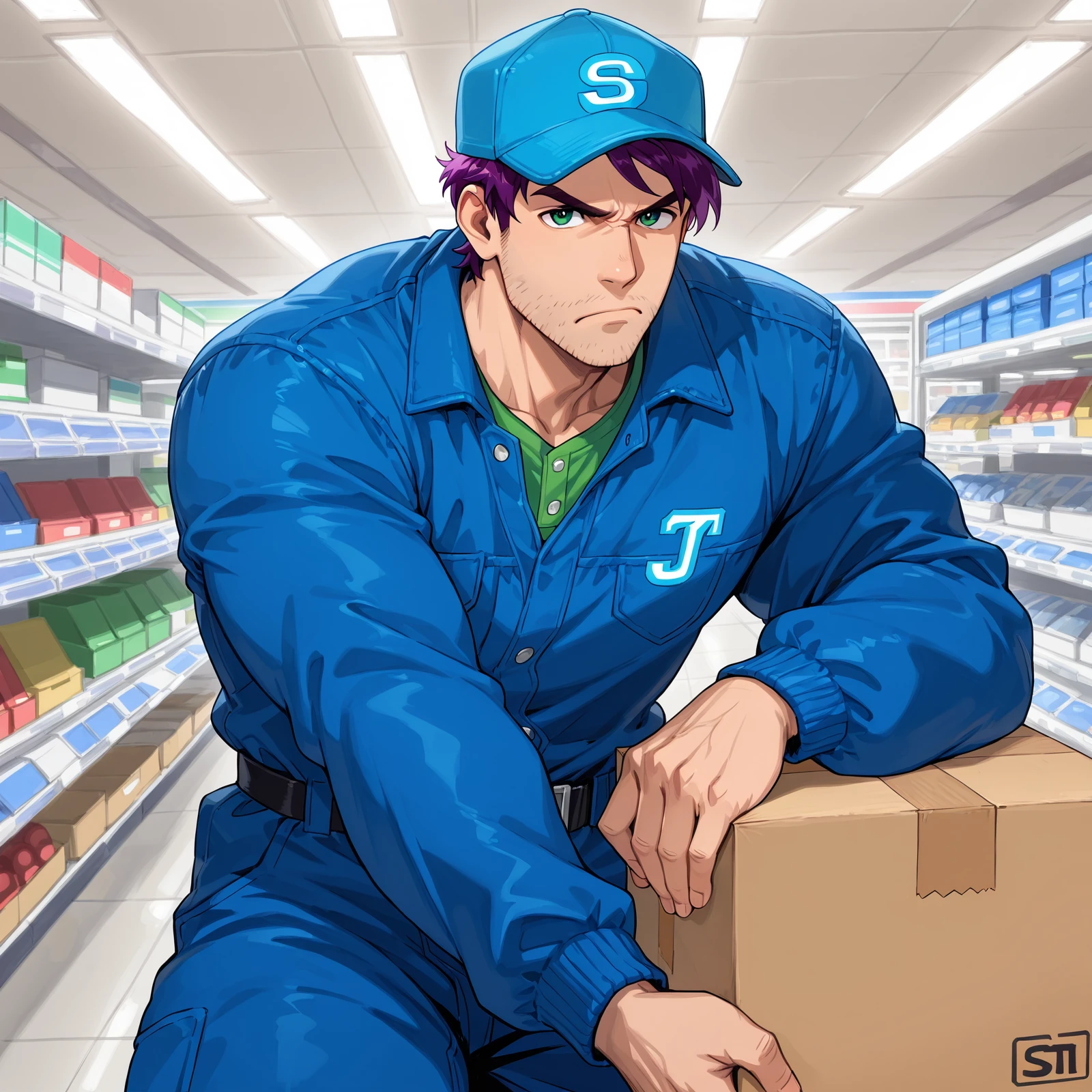 Main Prompts: ((1boy)), Sh@n£_(Stardew_Valley), masculine, muscular, manly, purple hair, short hair, green eyes, stubble,
