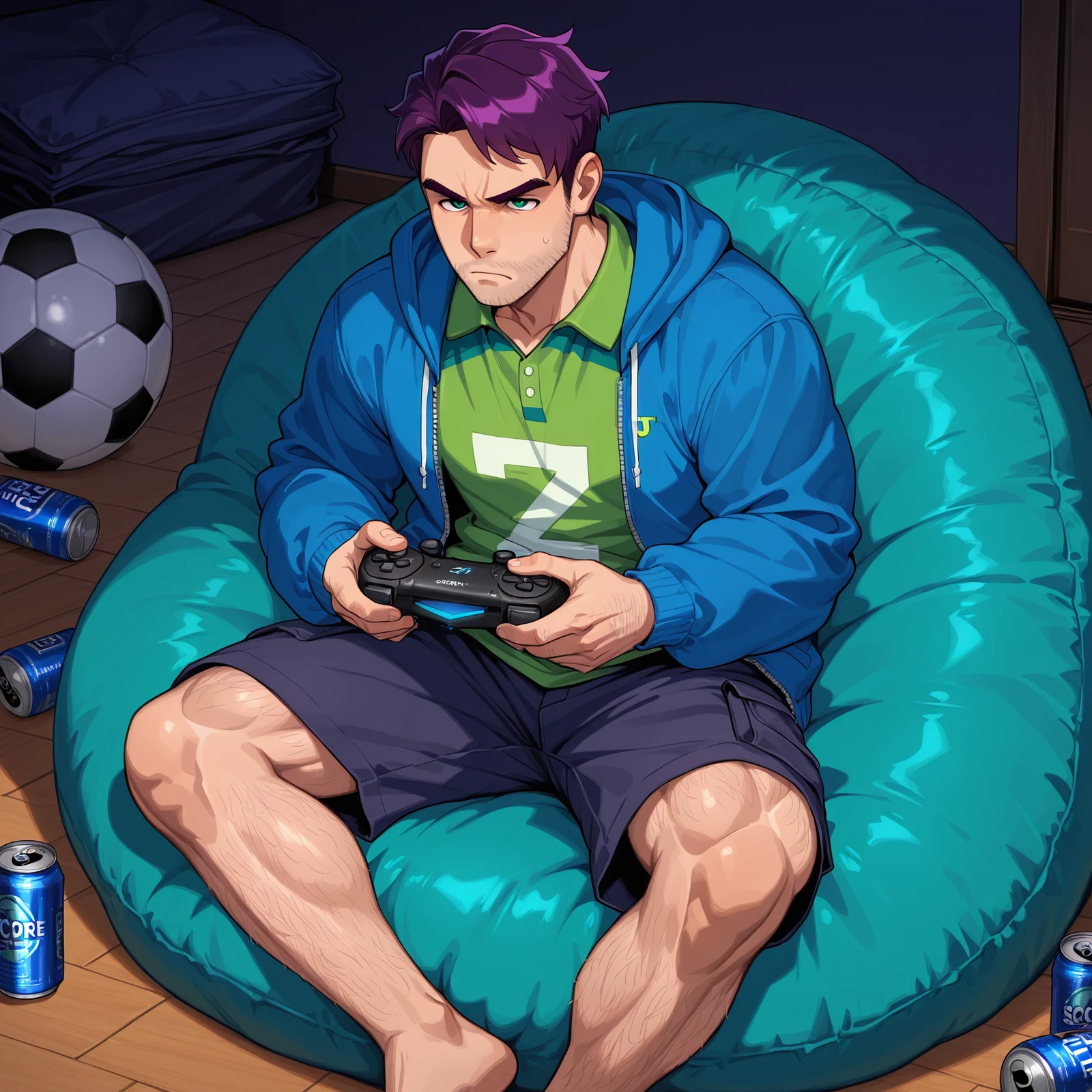 Clothing Prompts: wearing dark blue cargo shorts, wearing green polo shirt, wearing blue hoodie, open hoodie, wearing socks, wearing green sneakers, [or] wearing black sneakers with green shoelaces,