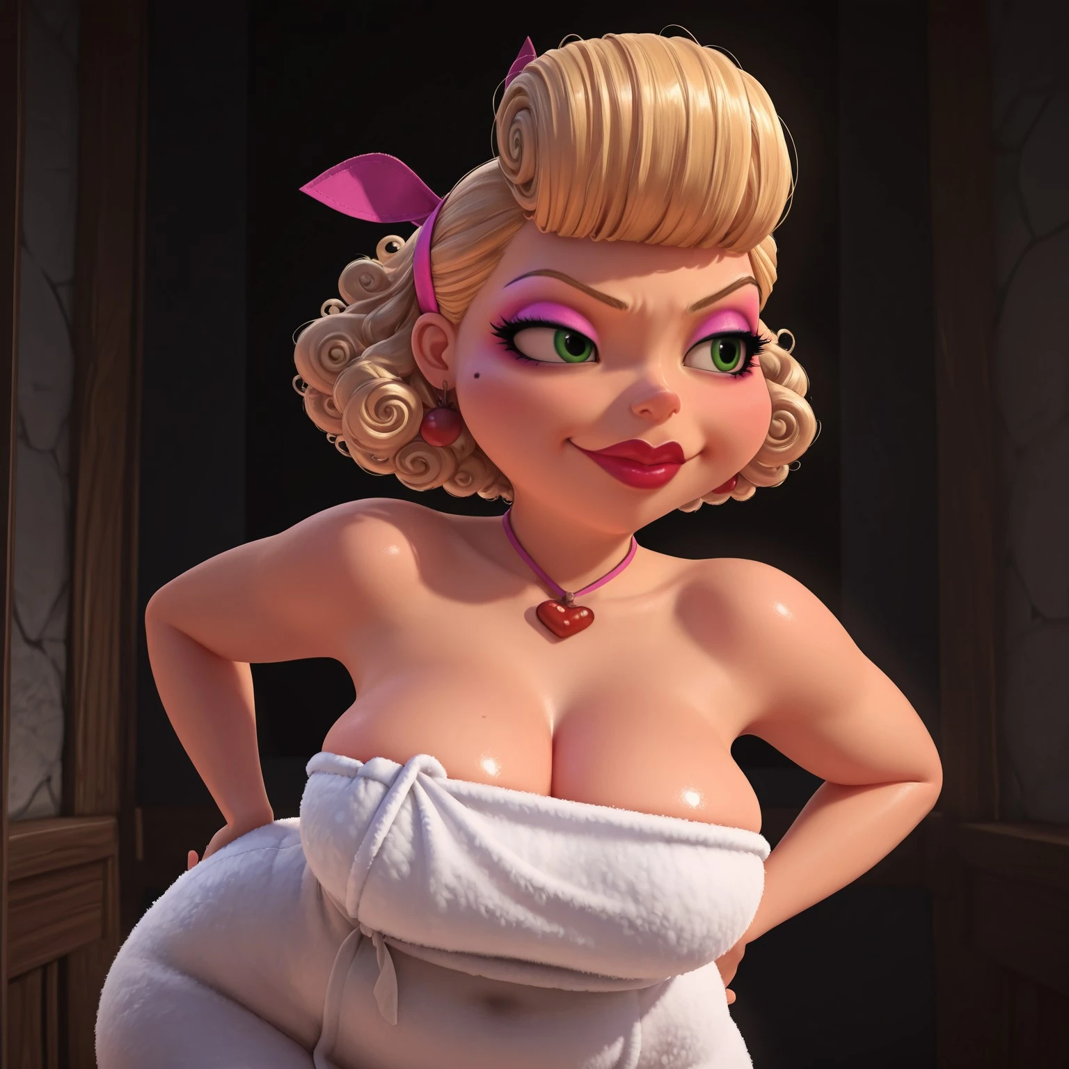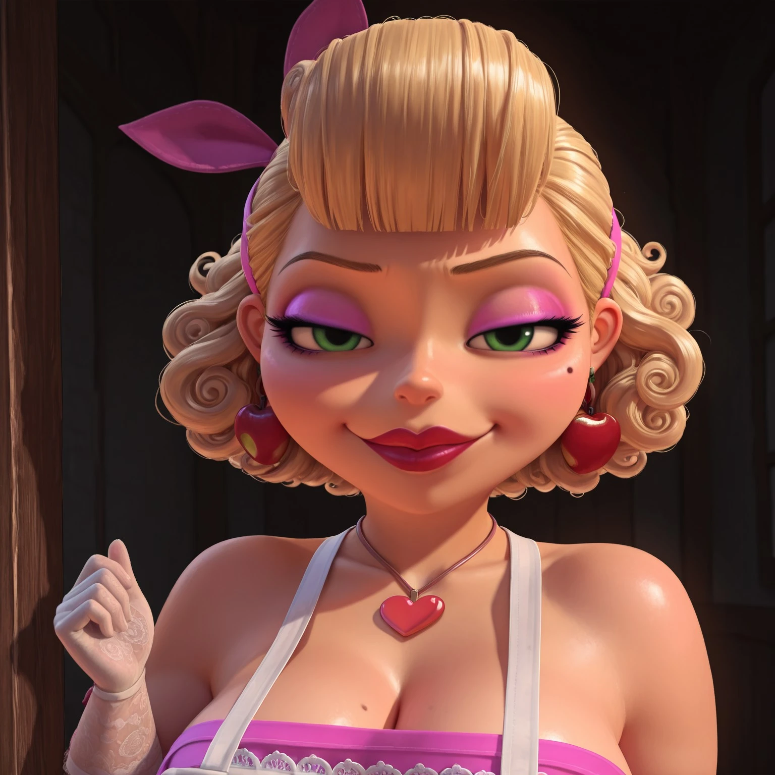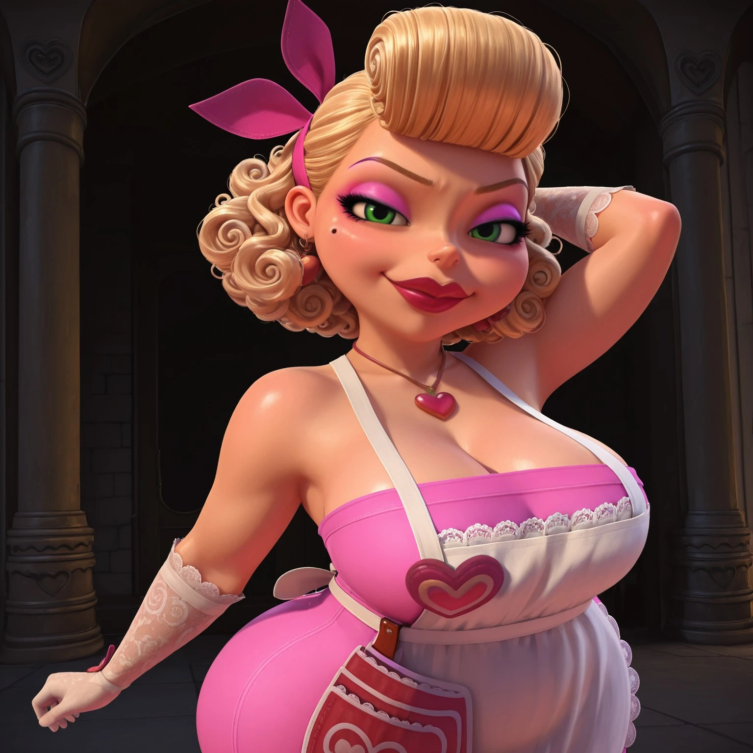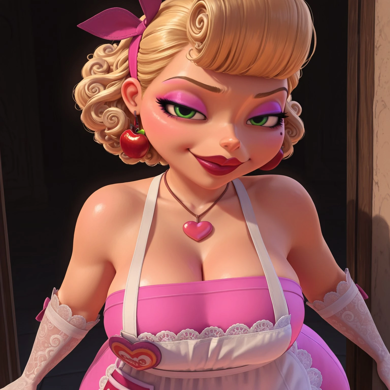 ilviracasu, cartoon mature curvy female, plump female, bumper bangs (blonde curly hair), green eyes, thick lips, mole on cheek, bare shoulders, makeup, light blue and pink eyeshadow, red lipstick, pink headband, red earrings, heart necklace, strapless pink dress, white apron over dress, white lace gloves, wide hips, large ass, small feet, small red high heels