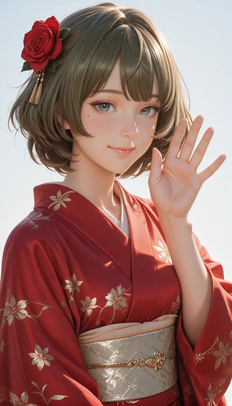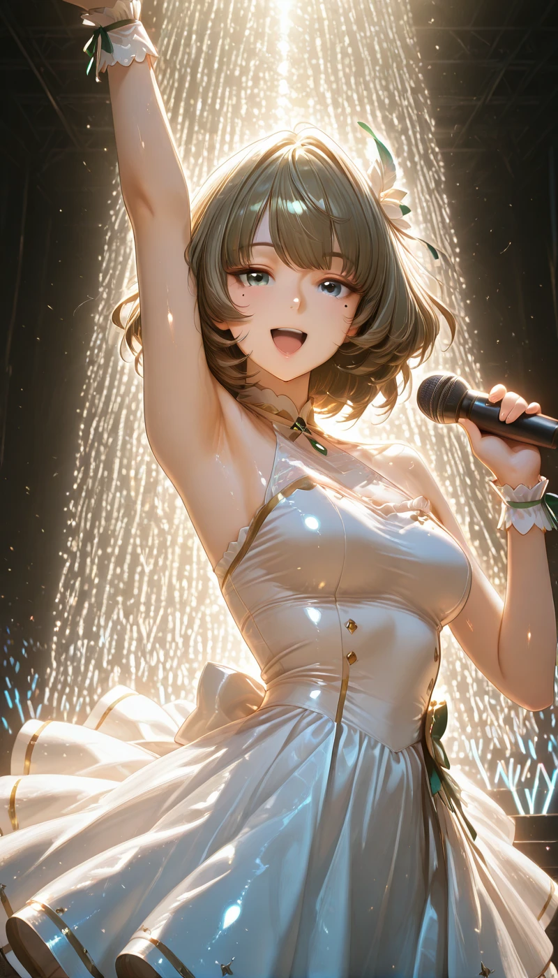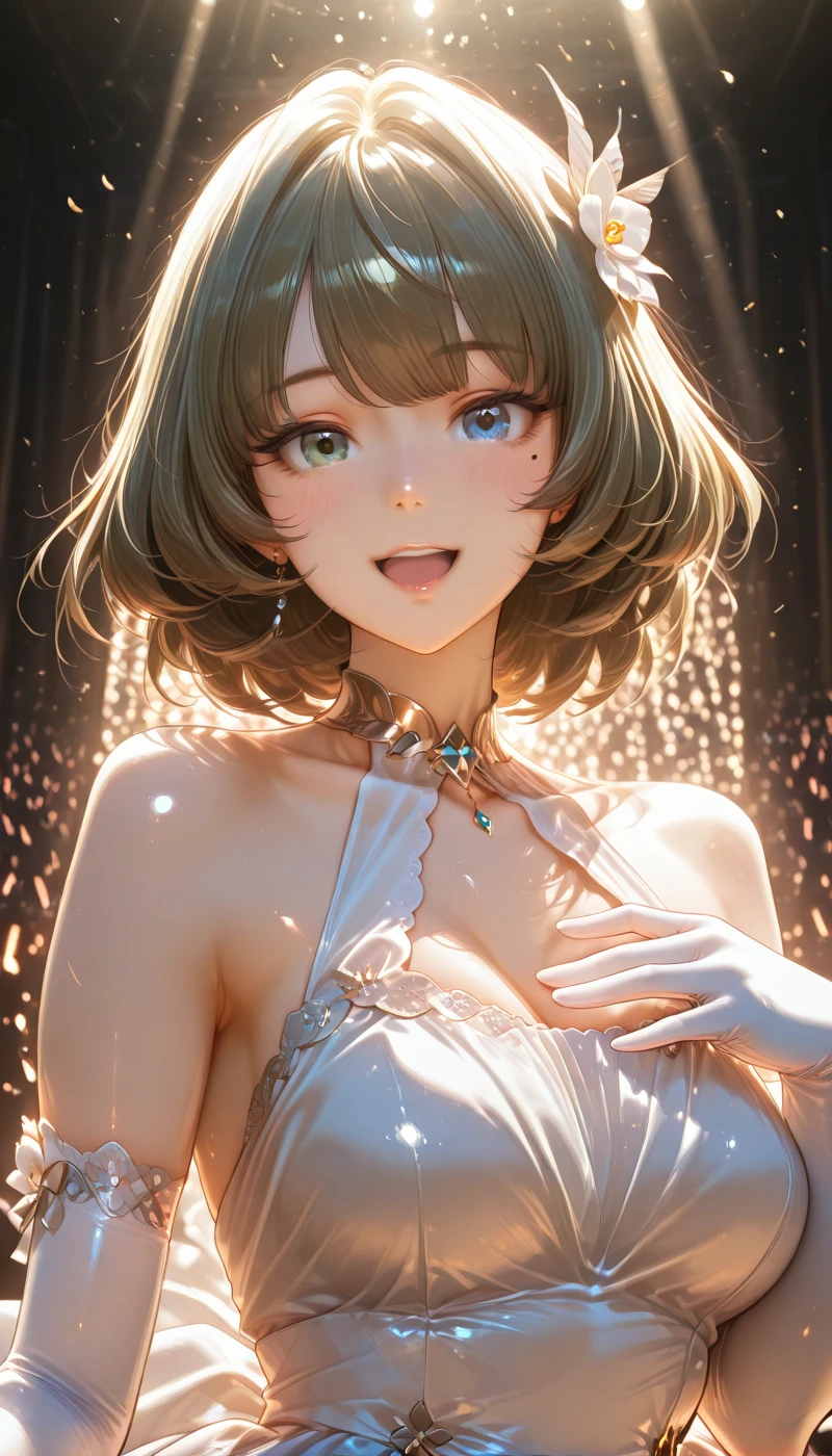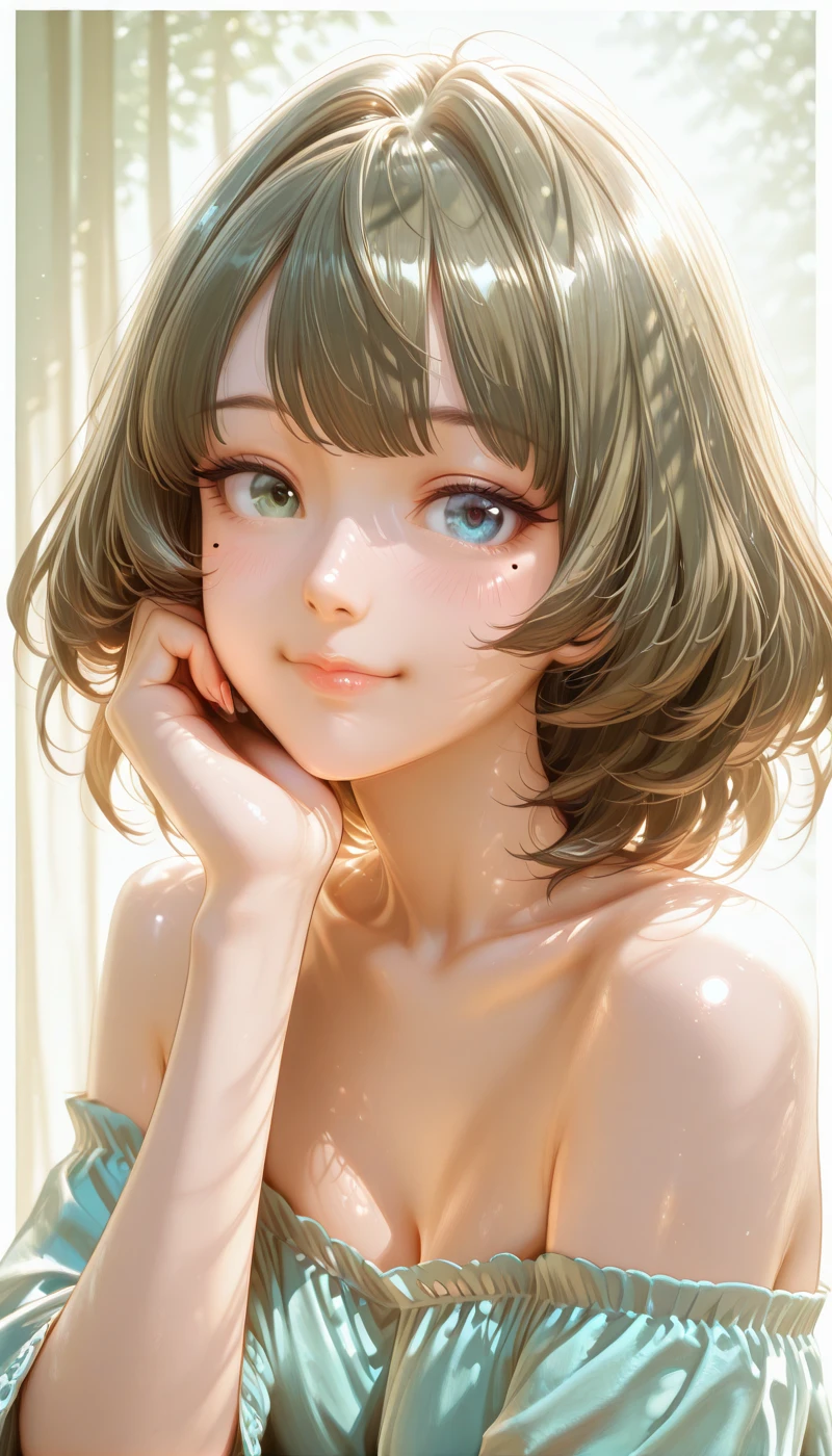 IMTakaKaede, breasts, short hair, blue eyes, large breasts, green eyes, green hair, mole, mole under eye, heterochromia,