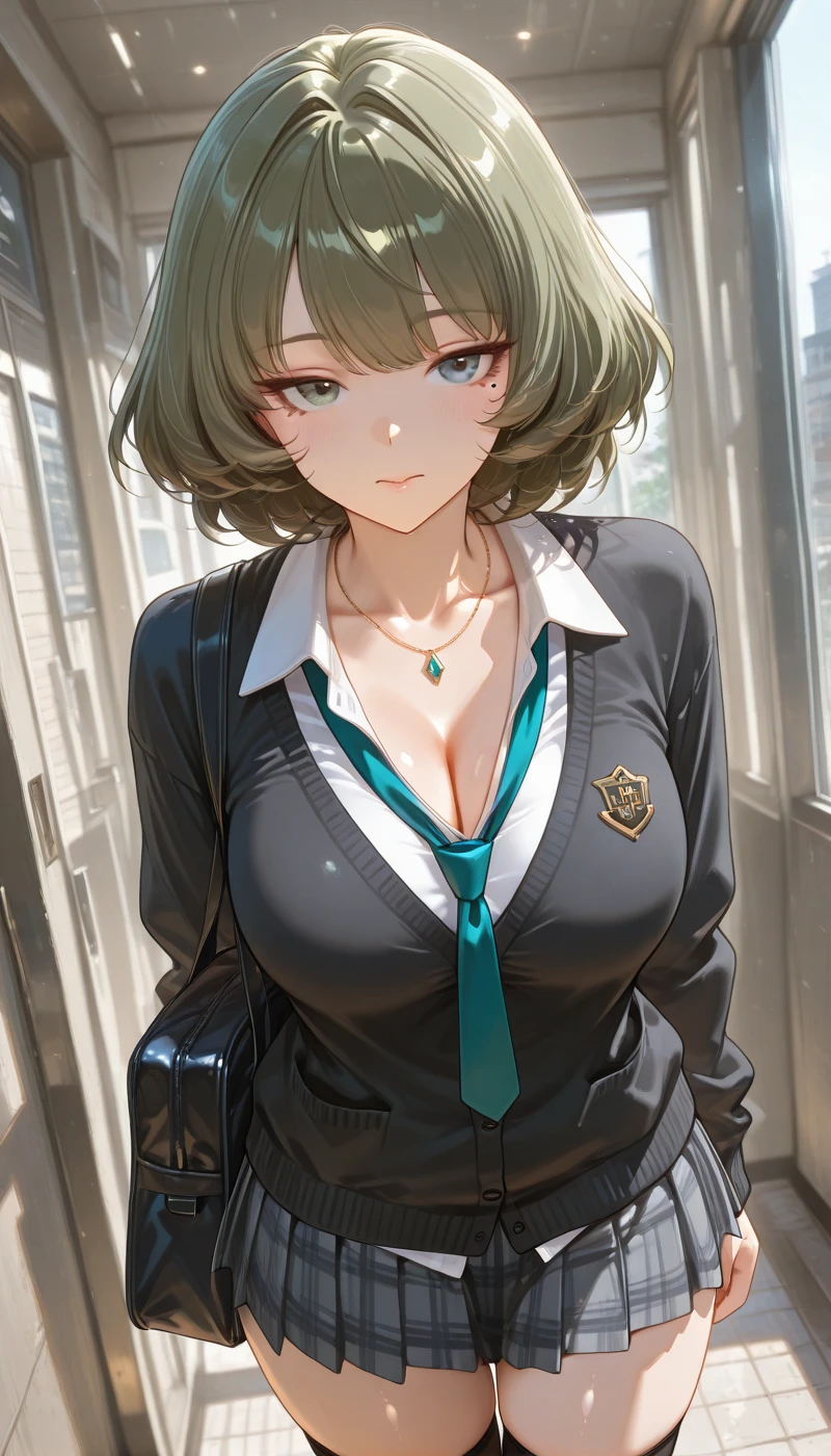 1.shirt, skirt, long sleeves, thighhighs, cleavage, jewelry, school uniform, collarbone, white shirt, thighs, pleated skirt, collared shirt, black thighhighs, miniskirt, necklace, bag, zettai ryouiki, plaid, thigh strap, plaid skirt, cardigan, grey skirt, o-ring, school bag, shoulder bag, black cardigan, loose necktie,