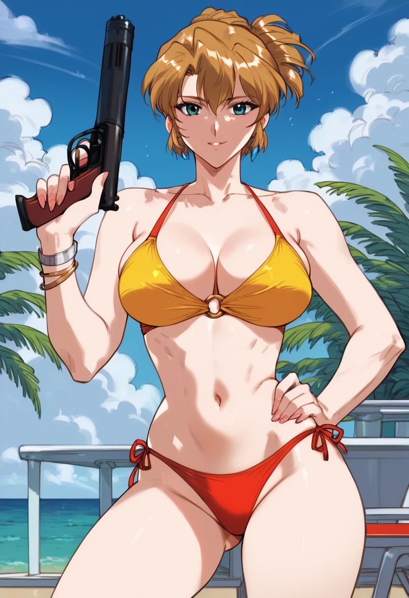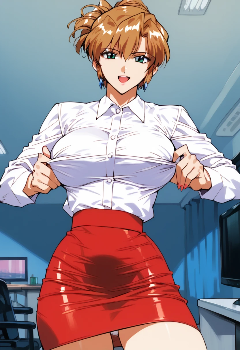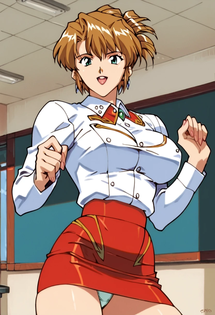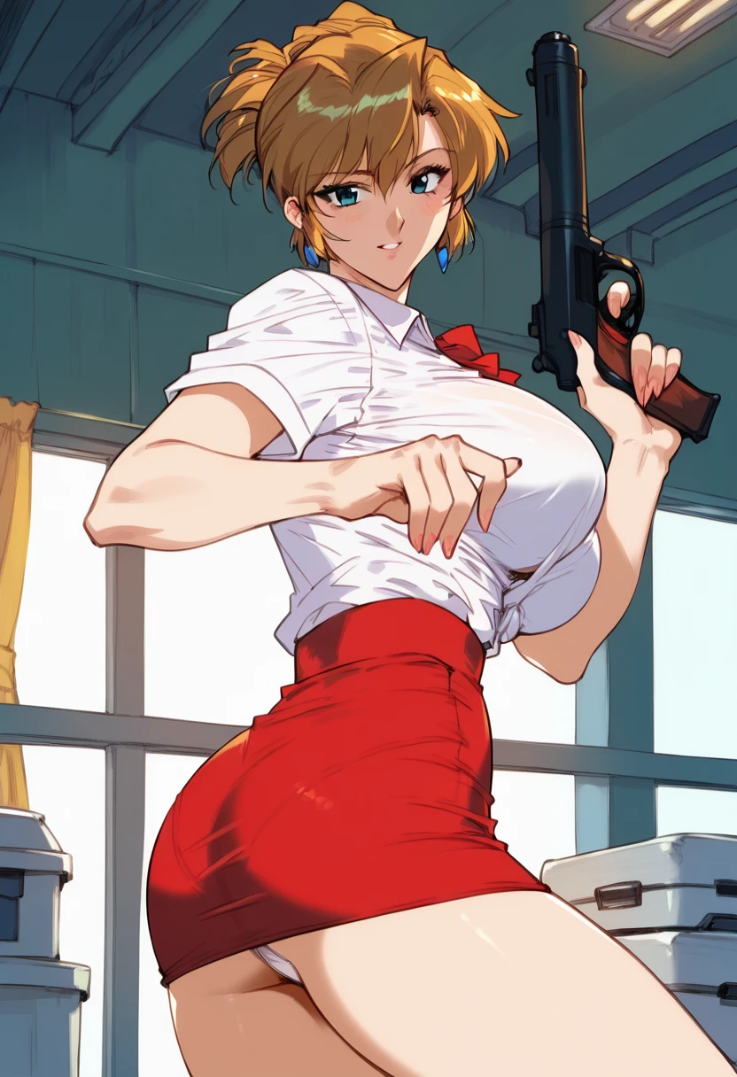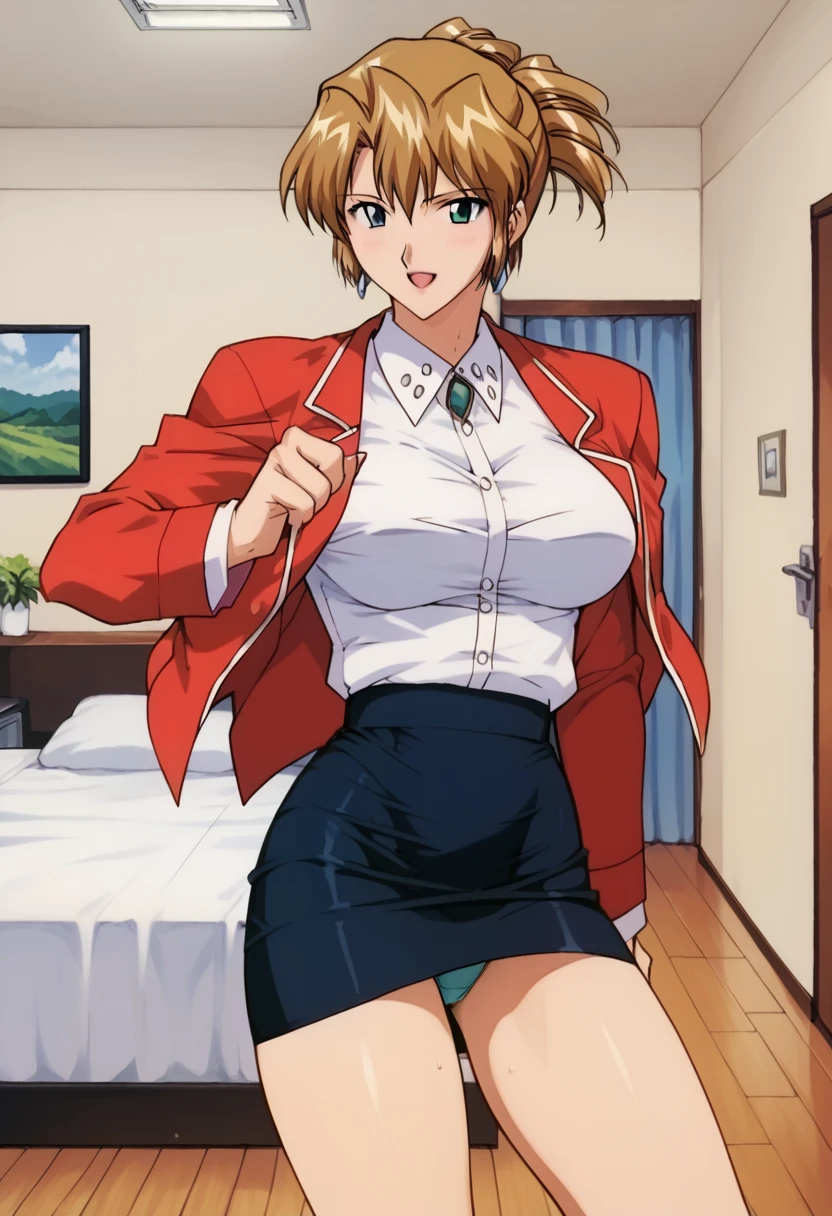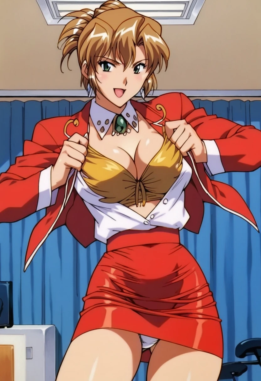 agent aika, red skirt, red jacket, cleavage, panties, large breasts,
