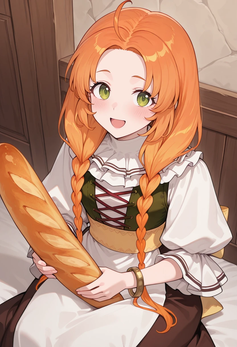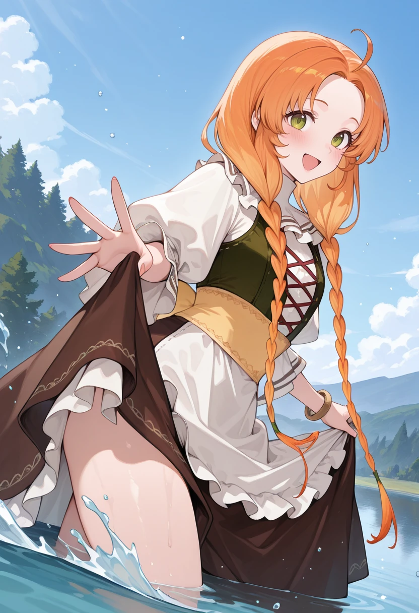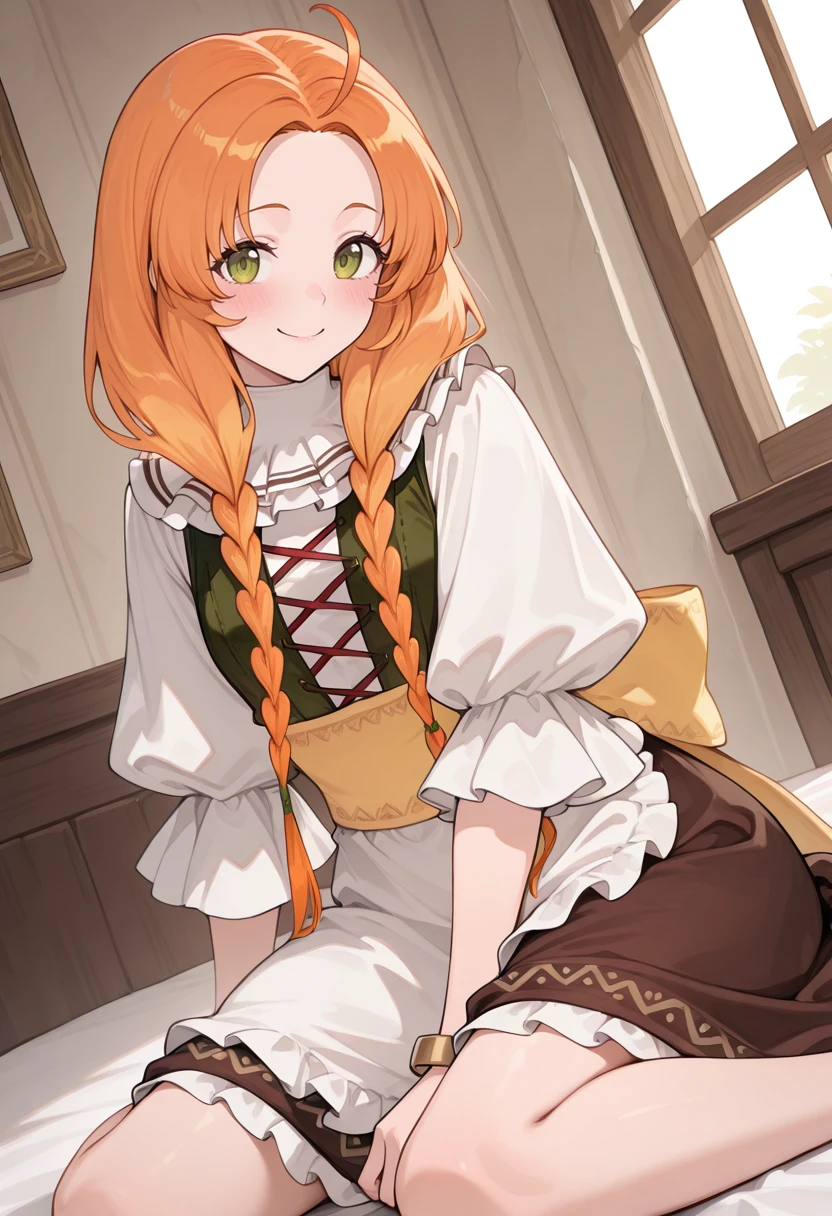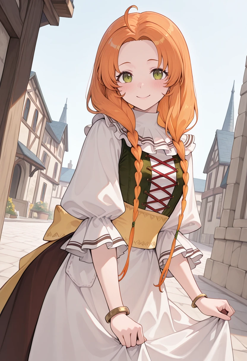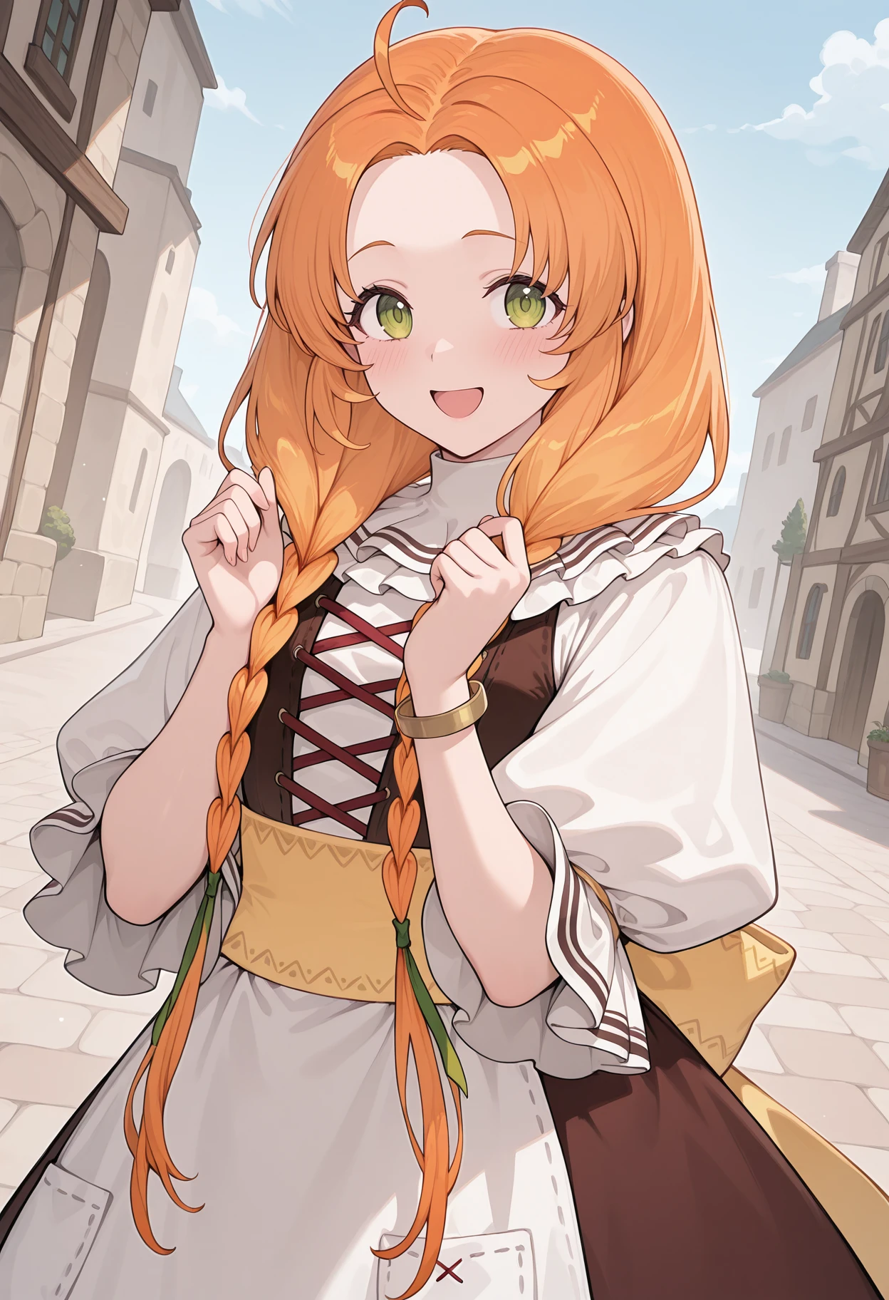 atschia, orange hair, blonde hair, long hair, twin braids, green eyes, ahoge, hair over shoulder,