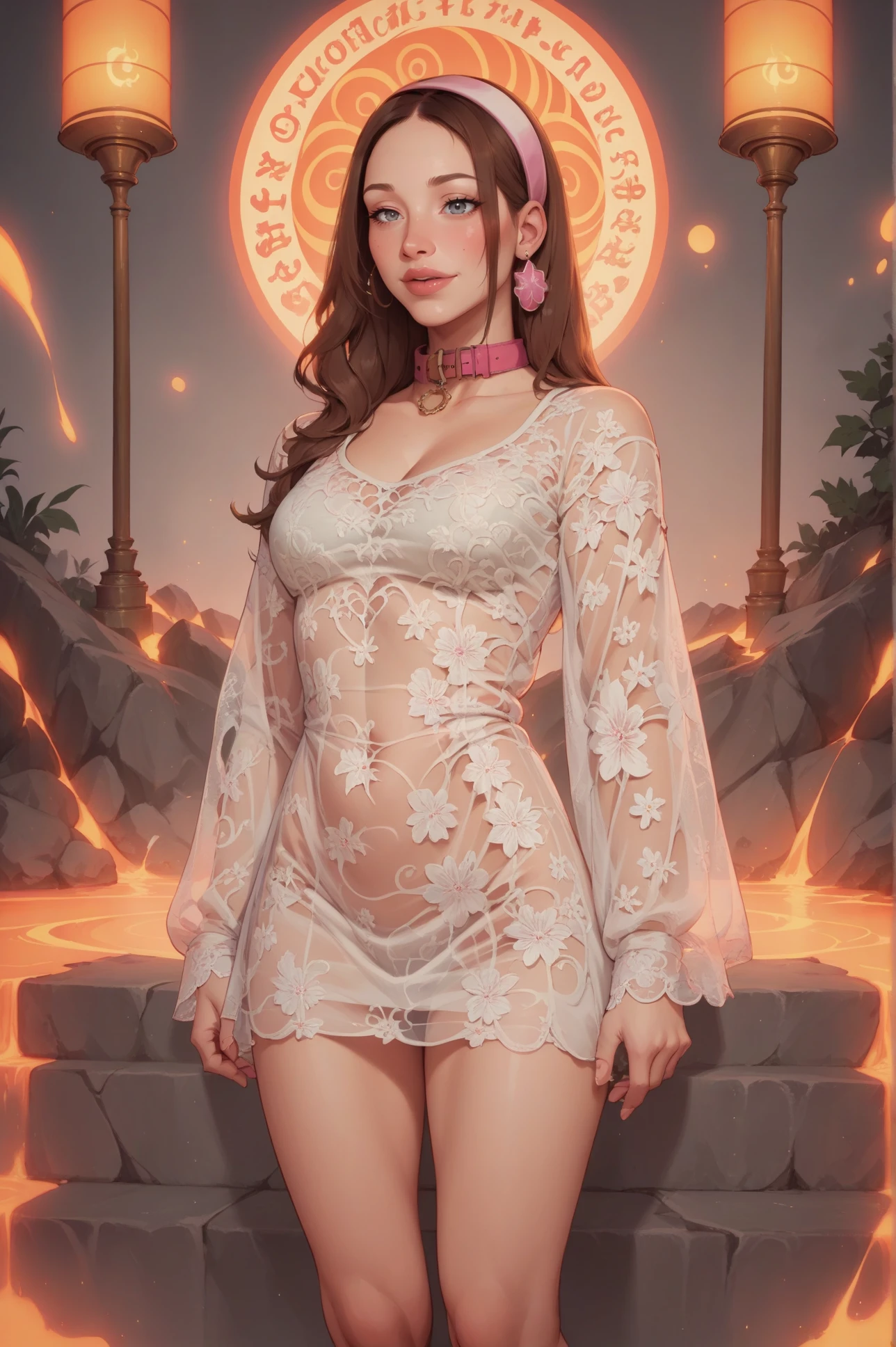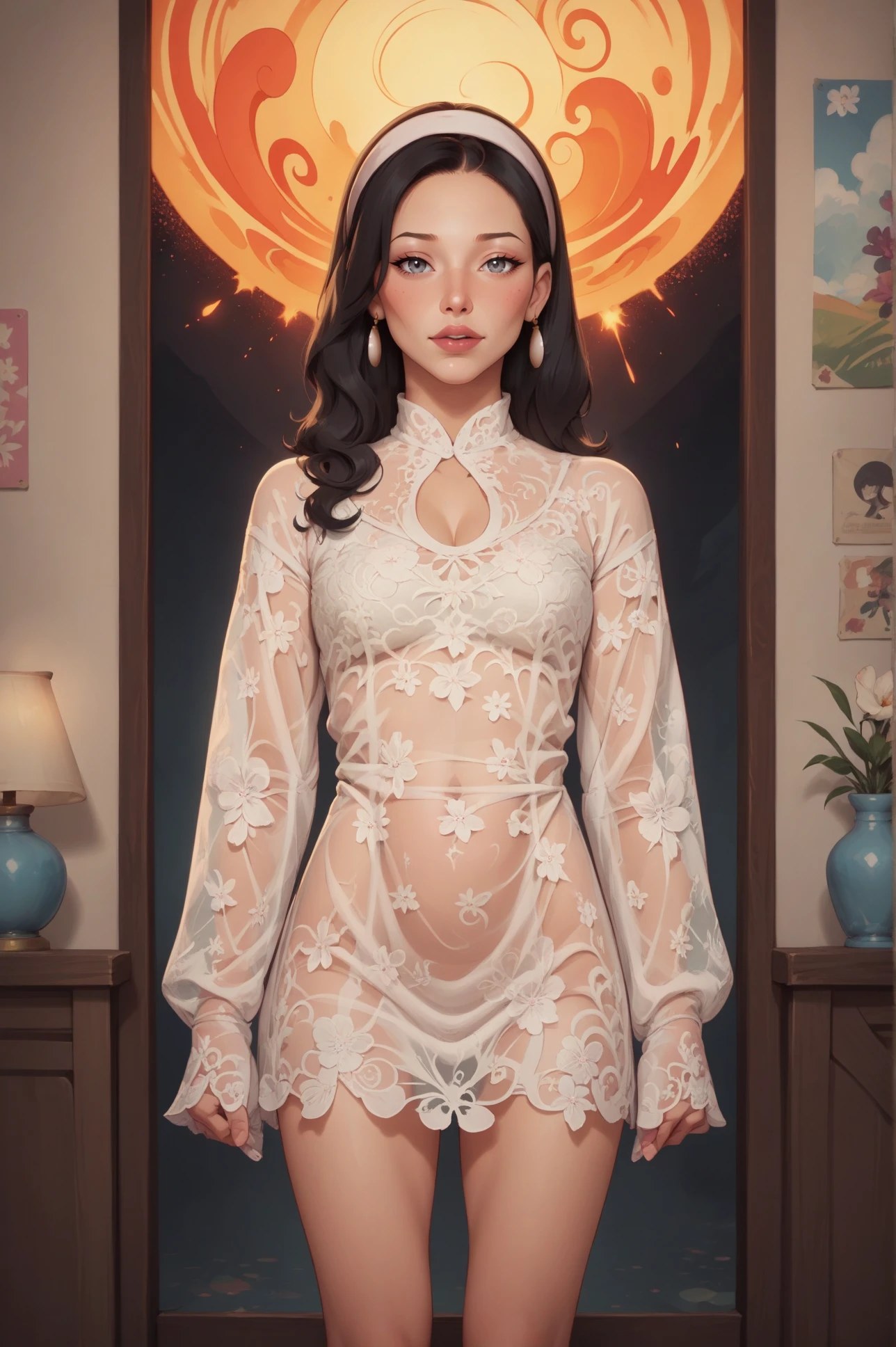 hud_dk_mdress, see-through white loose fit floral lace mod dress, short dress, baggy clothes, long sleeves, white hairband, earrings