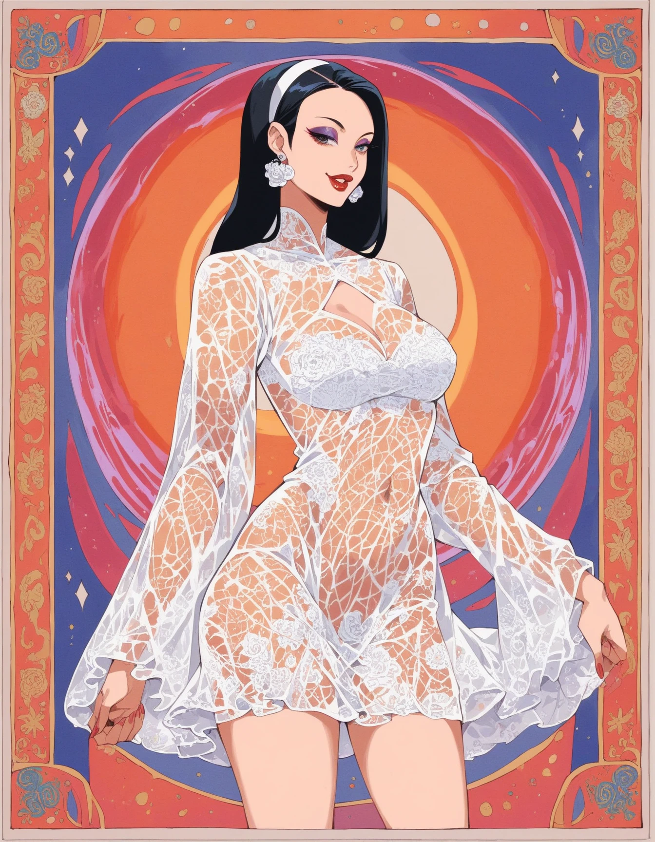 hud_dk_mdress, see-through white loose fit lace mod dress, short dress, baggy clothes, long sleeves, white hairband, earrings