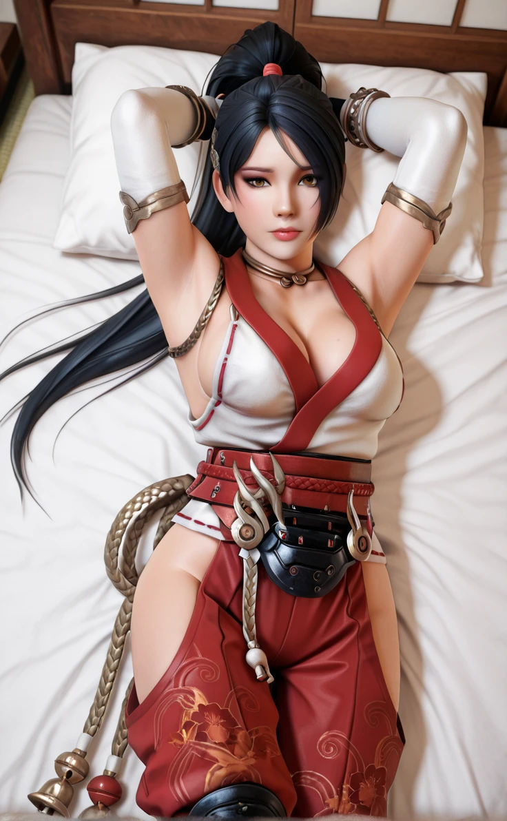 Main_Momiji_ownwaifu, 1girl, 3d, high ponytail, lips, momiji (ninja gaiden), nose, bare shoulders, black hair, brown eyes, large breasts, jewelry, long hair, necklace, japanese clothes, cleavage, detached sleeves, elbow gloves, sash, fingerless gloves, hair ornament, bracelet, hair over one eye, hip vent, makeup, hakama, hakama skirt, red hakama, black gloves, pants, bangs, arm guards, collarbone, obi, asian, no bra, bell, neck ring, armlet, eyeshadow, lipstick, rope belt, swept bangs, knee boots, chain, eyes visible through hair, thighs, cleavage cutout, clothing cutout, hair tie, japanese armor, nontraditional miko, red pants, revealing clothes, eyelashes, downblouse, metal collar,