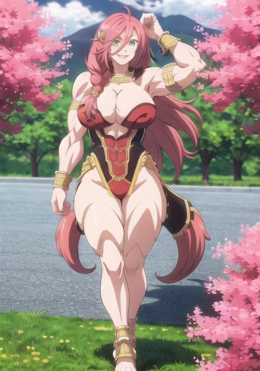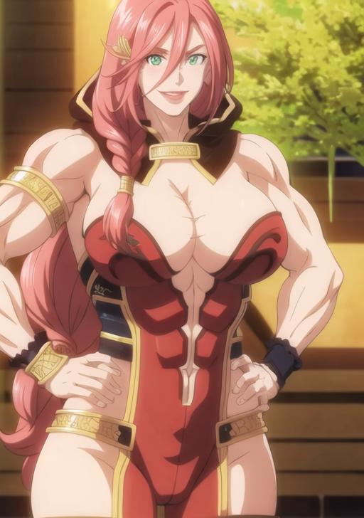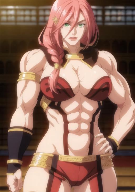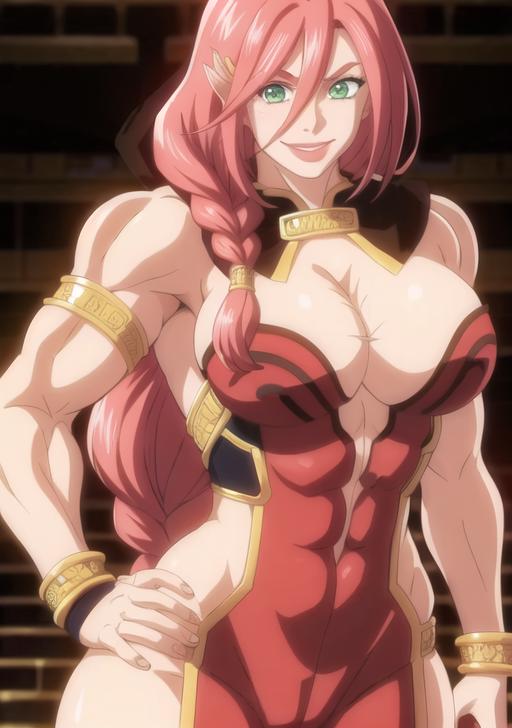 1girl, solo, long hair, breasts, looking at viewer, smile, large breasts, cleavage, green eyes, standing, full body, pink hair, braid, red hair, hand on hip, muscular, abs, armlet, muscular female, bracer, biceps