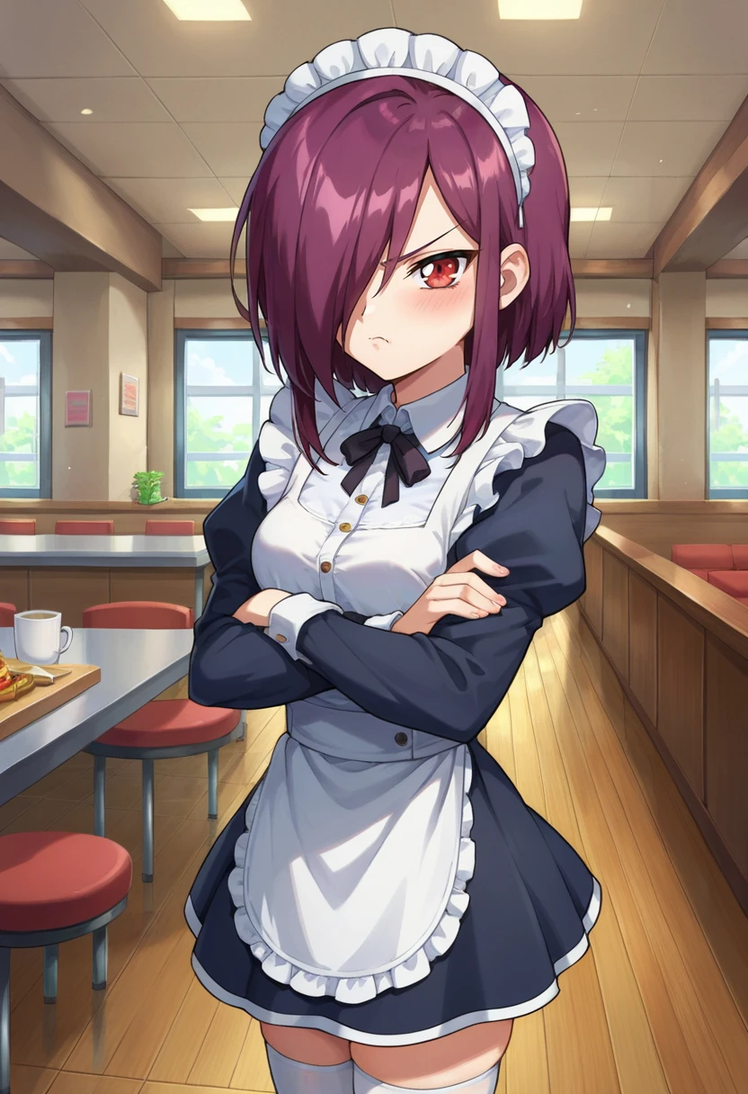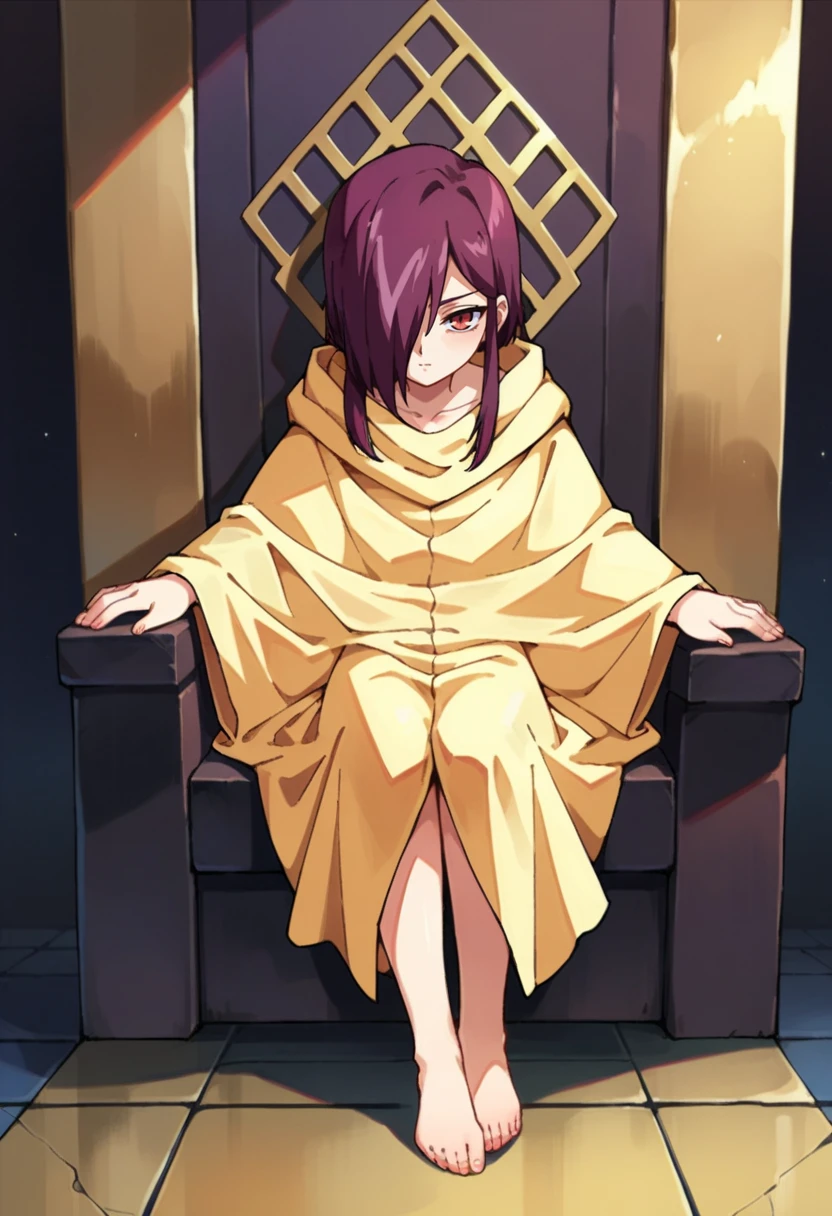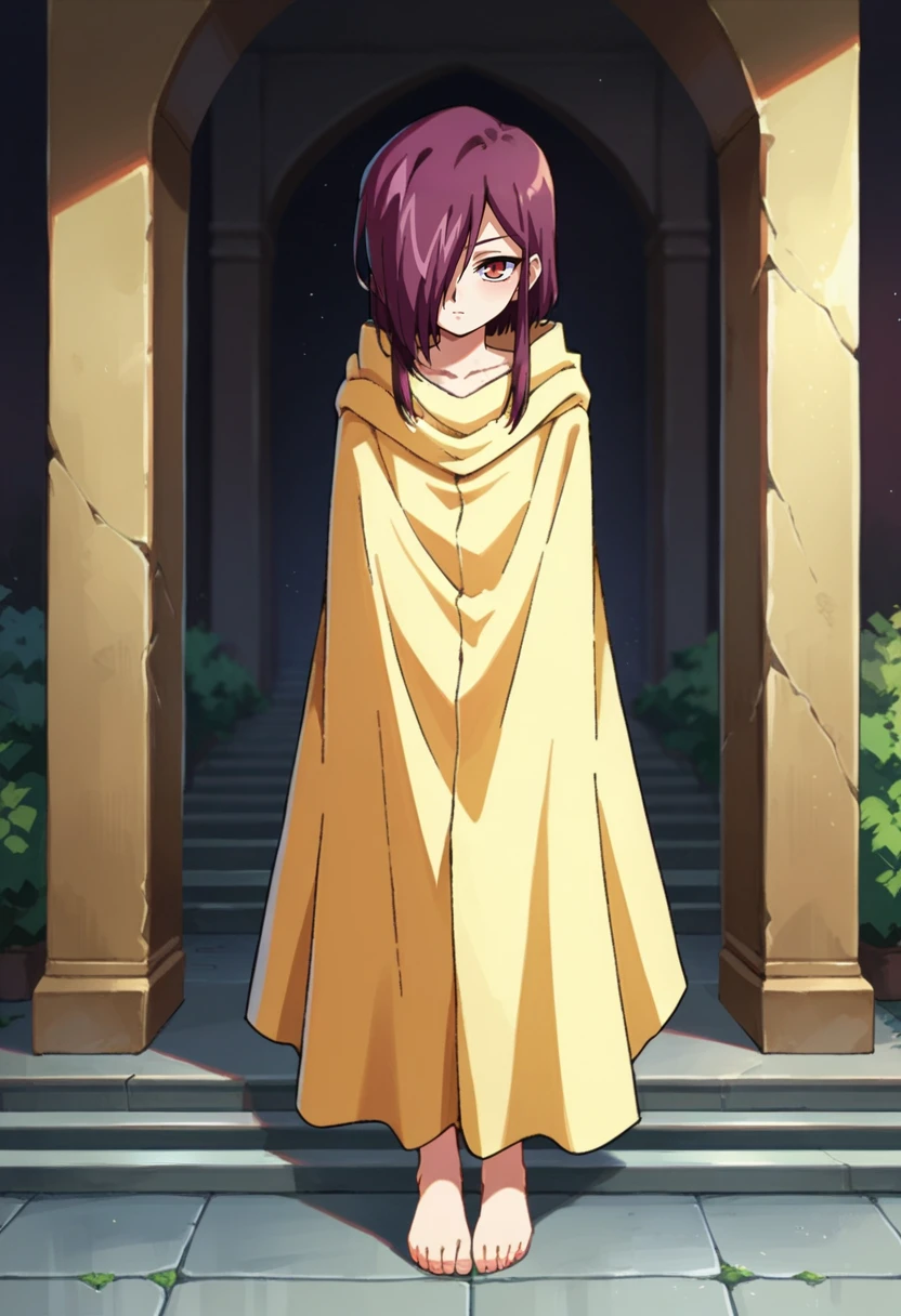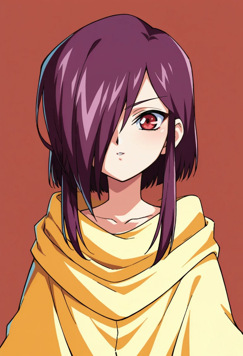 abel,1girl,solo,red eyes,purple hair,hair over one eye,sidelocks,cloak,
