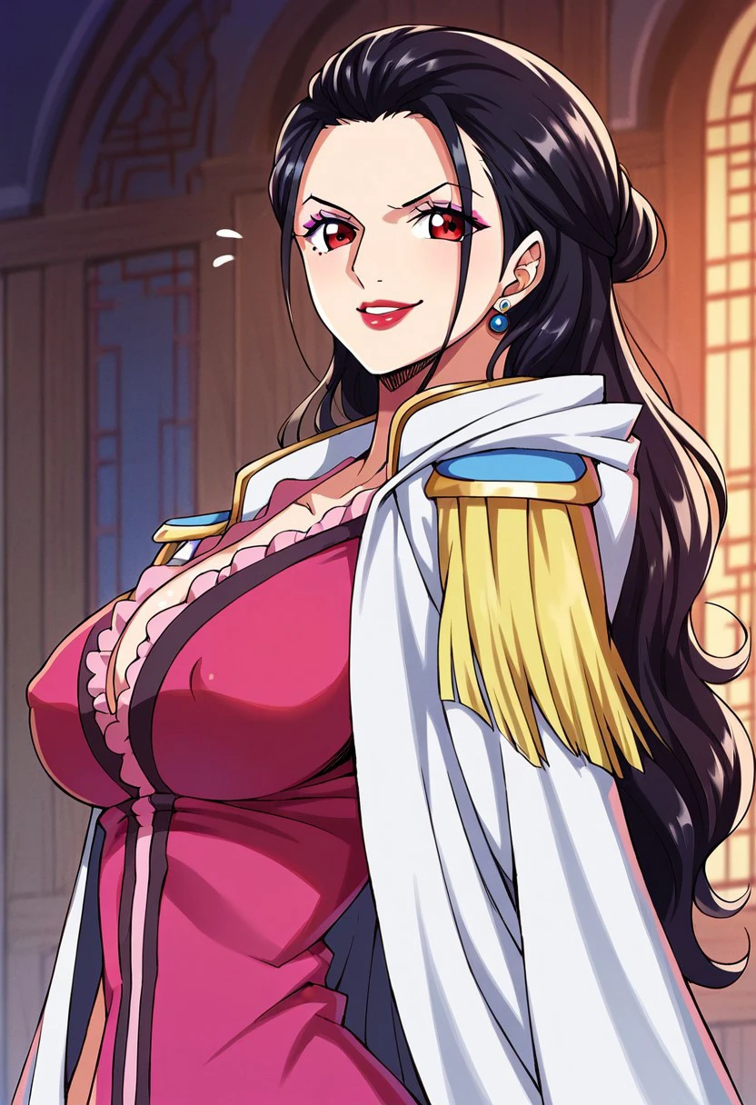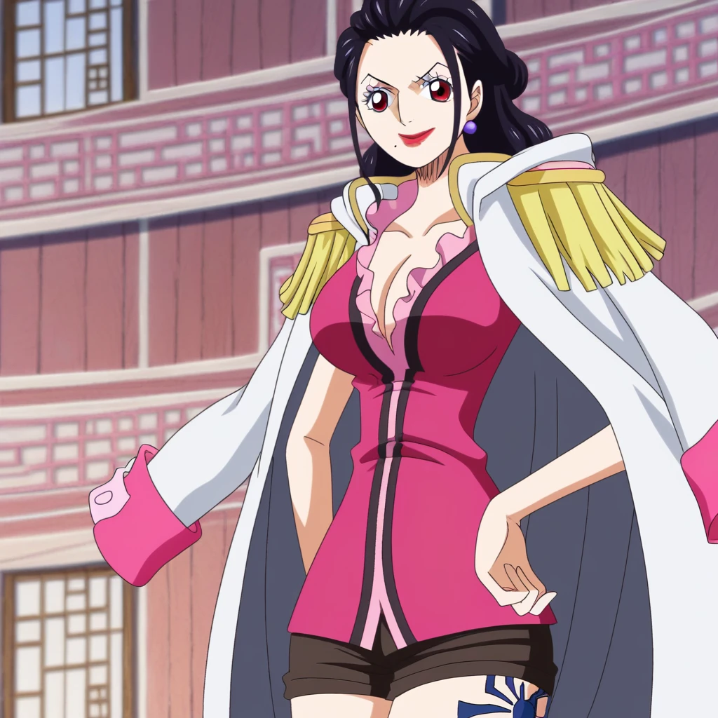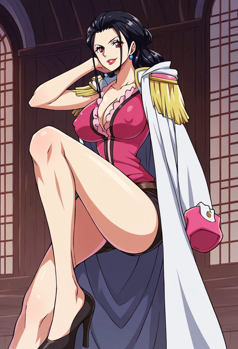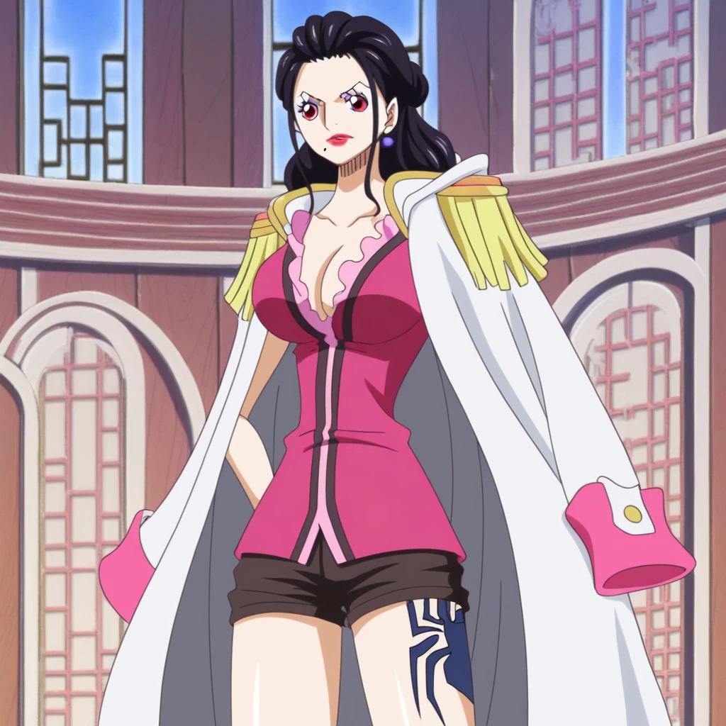 GionMomousagiOP, 1girl, solo, tall woman, slender woman, black hair, long hair, curly hair, red eyes, lips, red lipstick, mole, earrings, makeup, eyeshadow, cleavage, large breast, white coat, coat on shoulders, pink epaulettes, pink cuffs, hood down, short-sleeved pink shirt, frilled collar, open neckline, dark brown shorts, black heels, black spider tattoo, tattoo on left thigh, collarbone, belt,