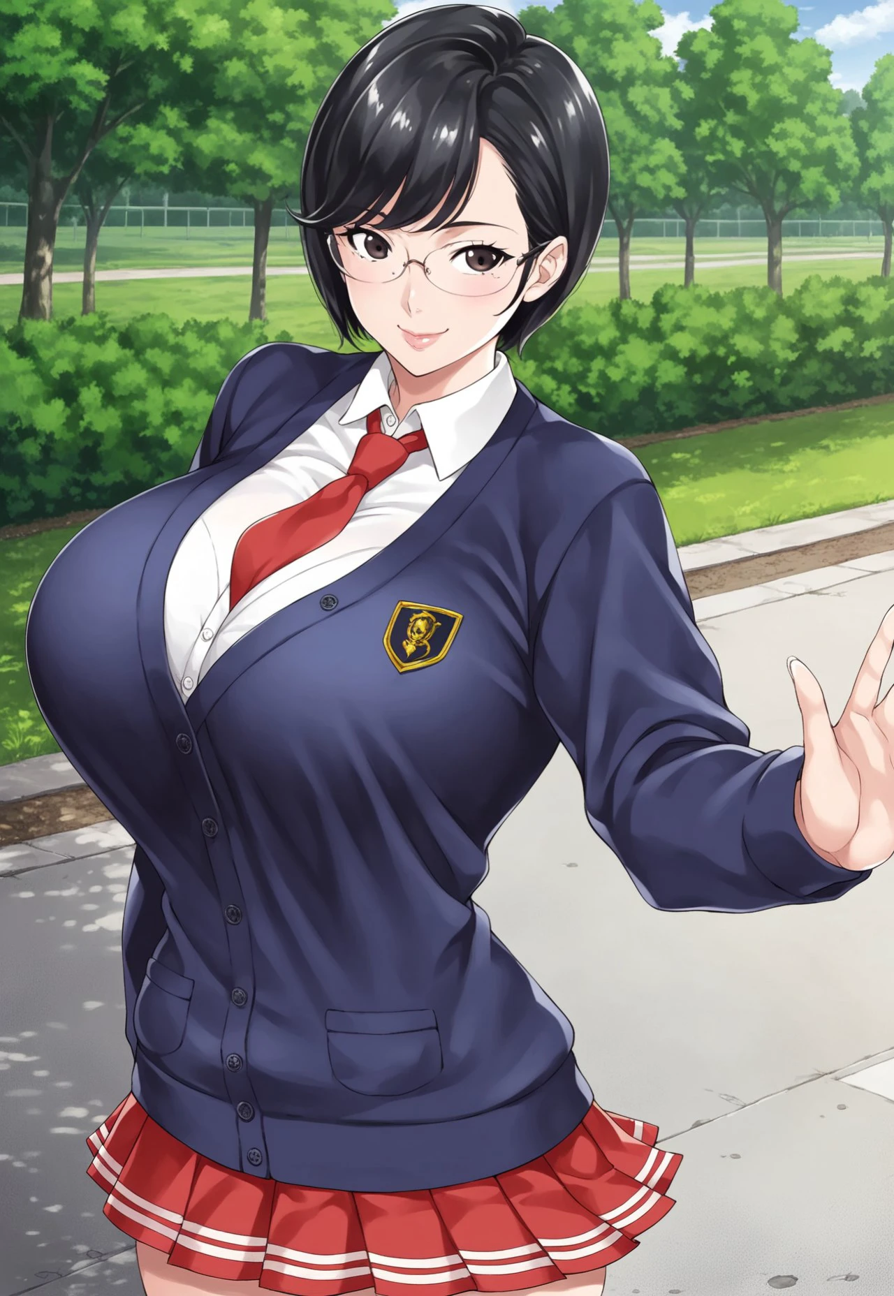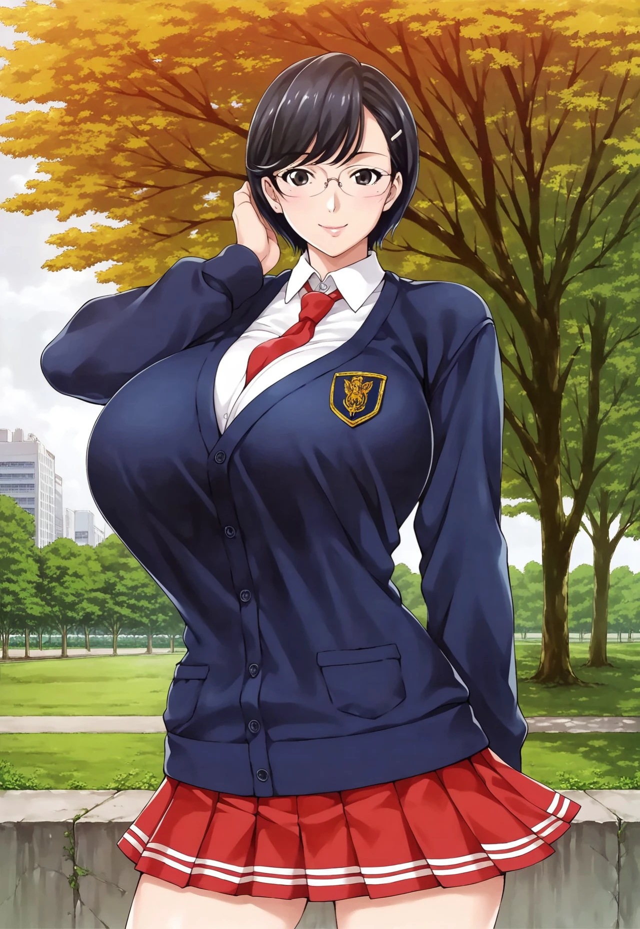 Tags: Izumi Sato, black hair, short bob hairstyle, side-swept bangs, glasses, black eyes, huge breasts
