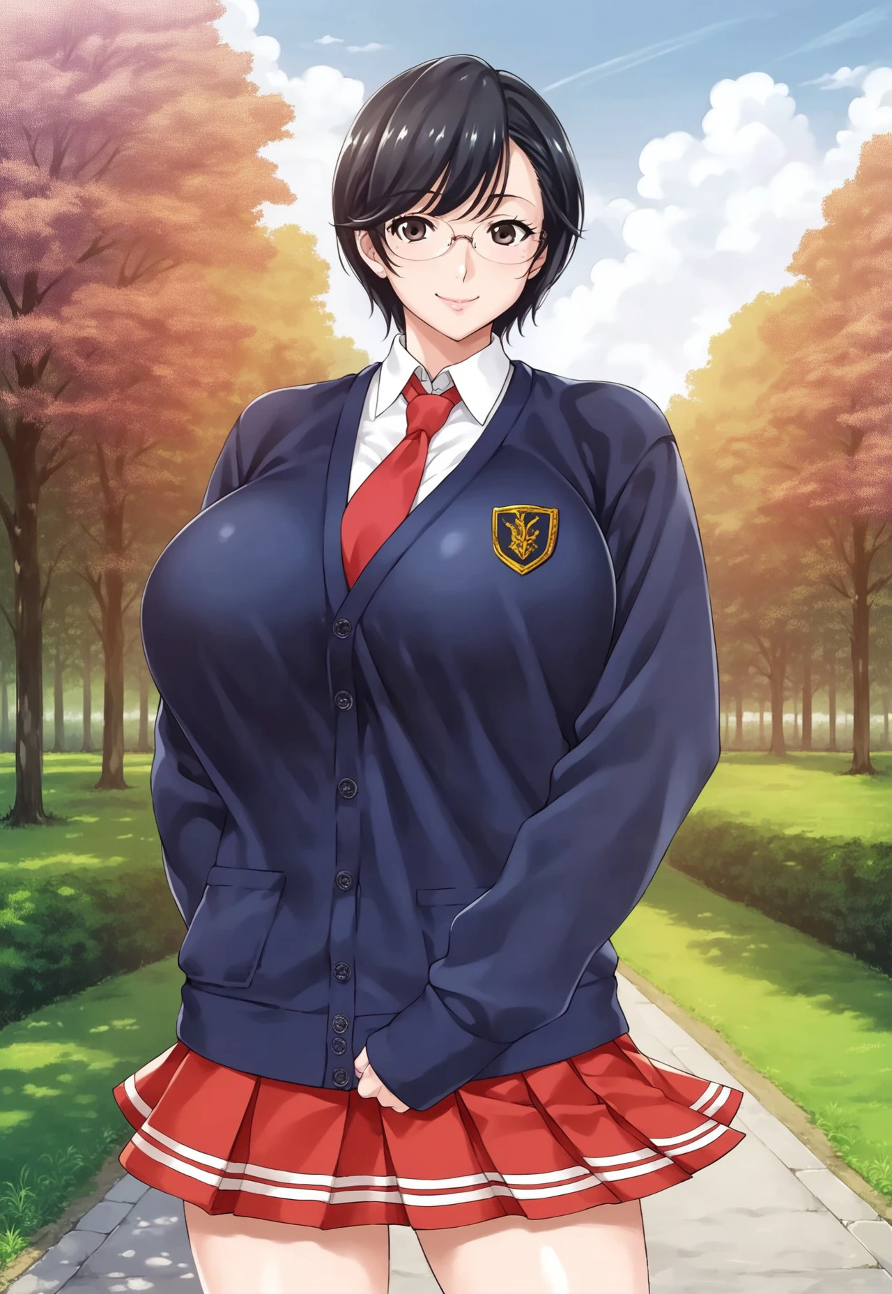 Outfit: Navy blue cardigan, white collared shirt, red tie, red pleated skirt, white knee-high socks