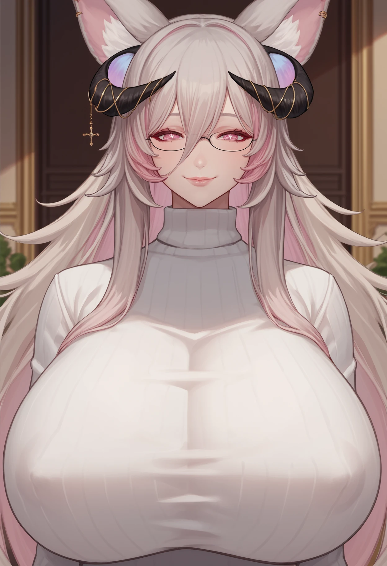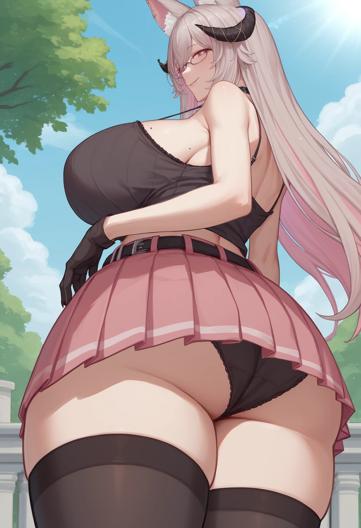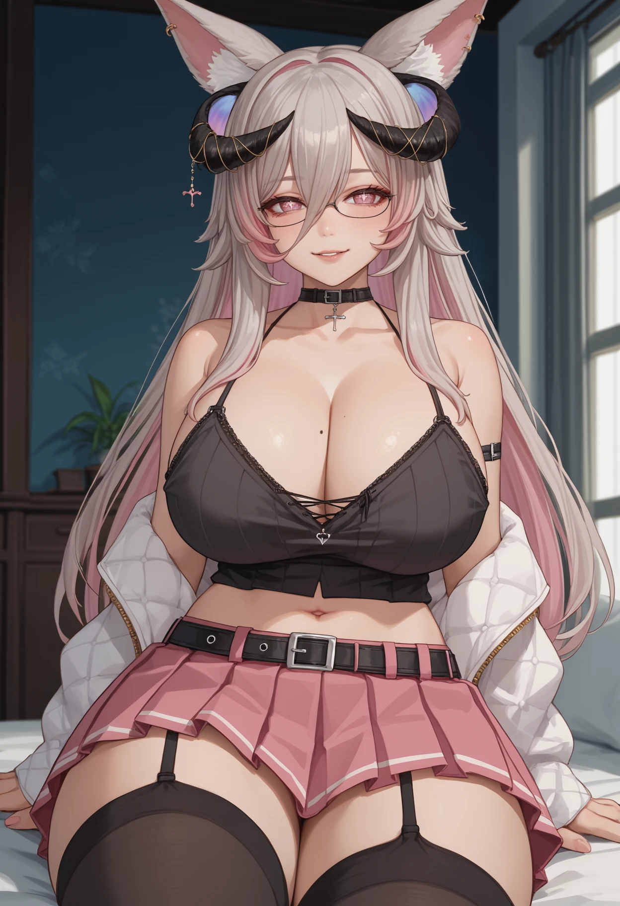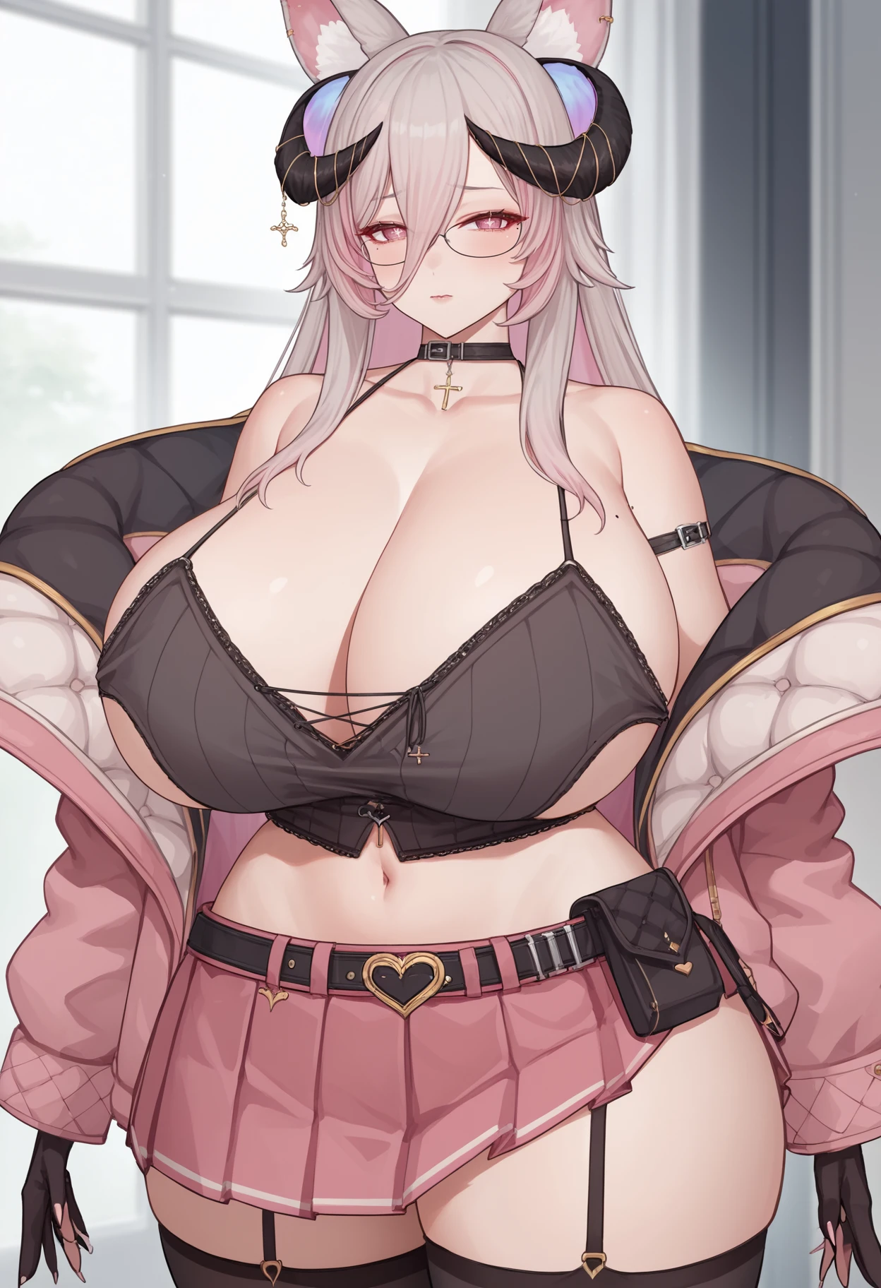 fra, pink eyes, symbol-shaped pupils, grey hair, colored inner hair, pink hair, long hair, horns, wolf ears, animal ear fluff, jewelry, glasses, choker, black camisole, cleavage, huge breasts, mole on breast, navel, midriff, pink jacket, off shoulder, pink skirt, pleated skirt, belt, black thighhighs, garter straps, thick thighs, wide hips, black gloves
