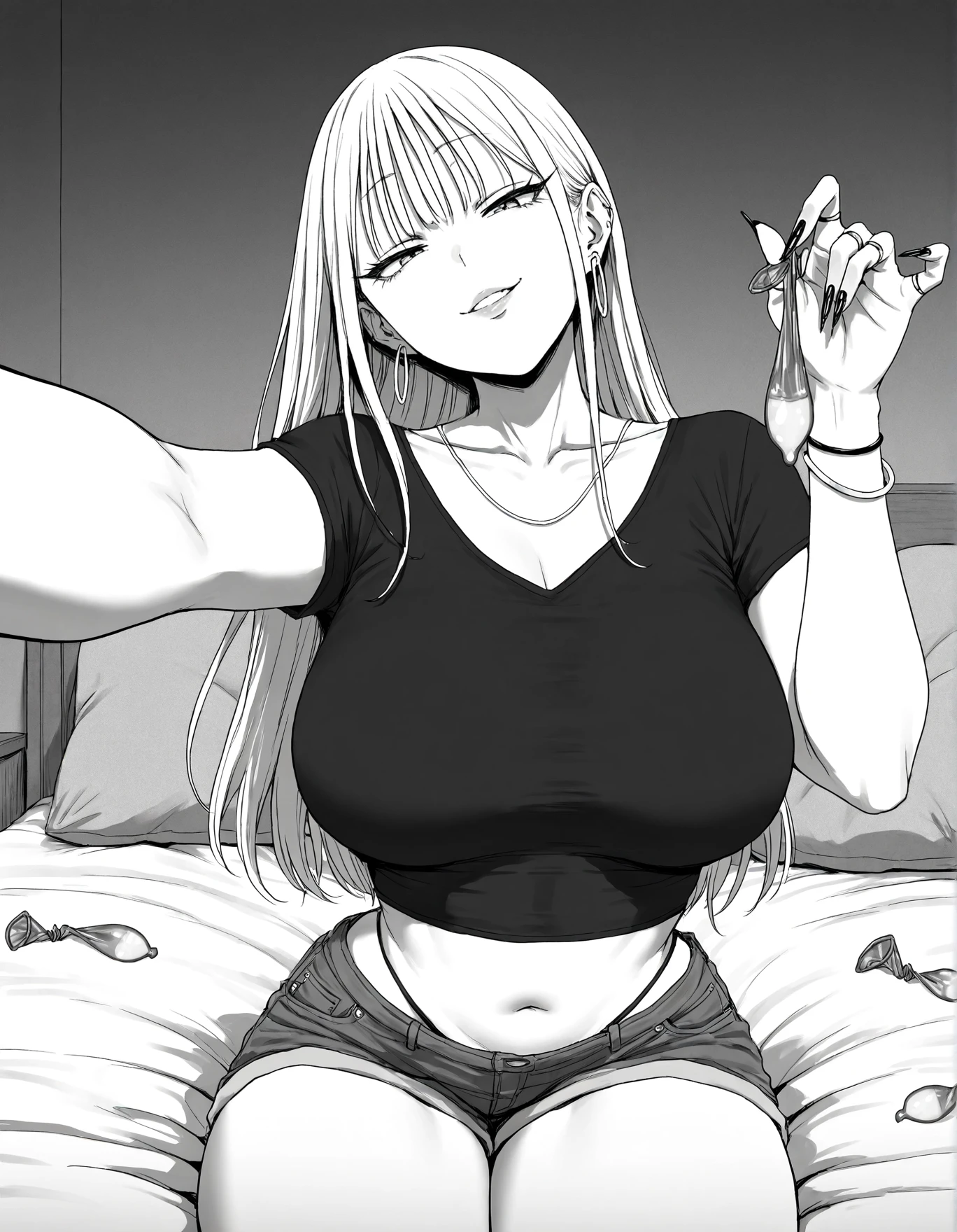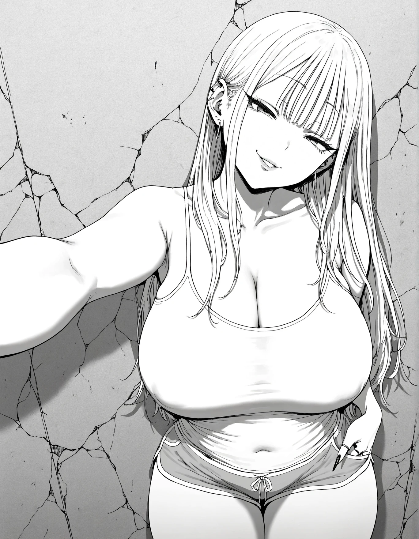 misaki, blonde hair, long hair, eyelashes, bangs, white tank top, dolphin shorts, cleavage, fingers rings,
