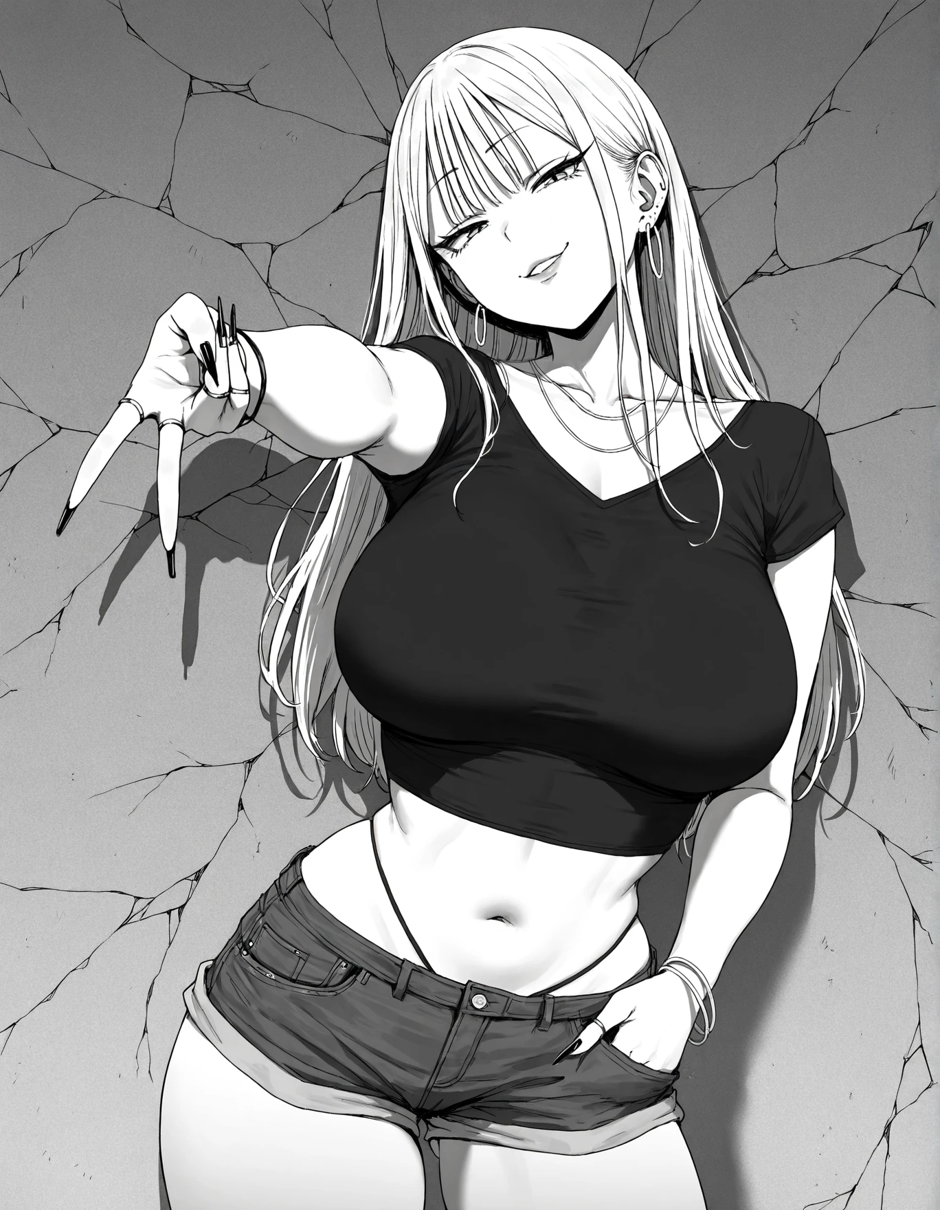 misaki, blonde hair, long hair, bangs, green eyes, eyeslashes, crop top, black crop top, short sleeves, denim shorts, short shorts, necklace, earrings, navel, fingers rings, bracelets,
