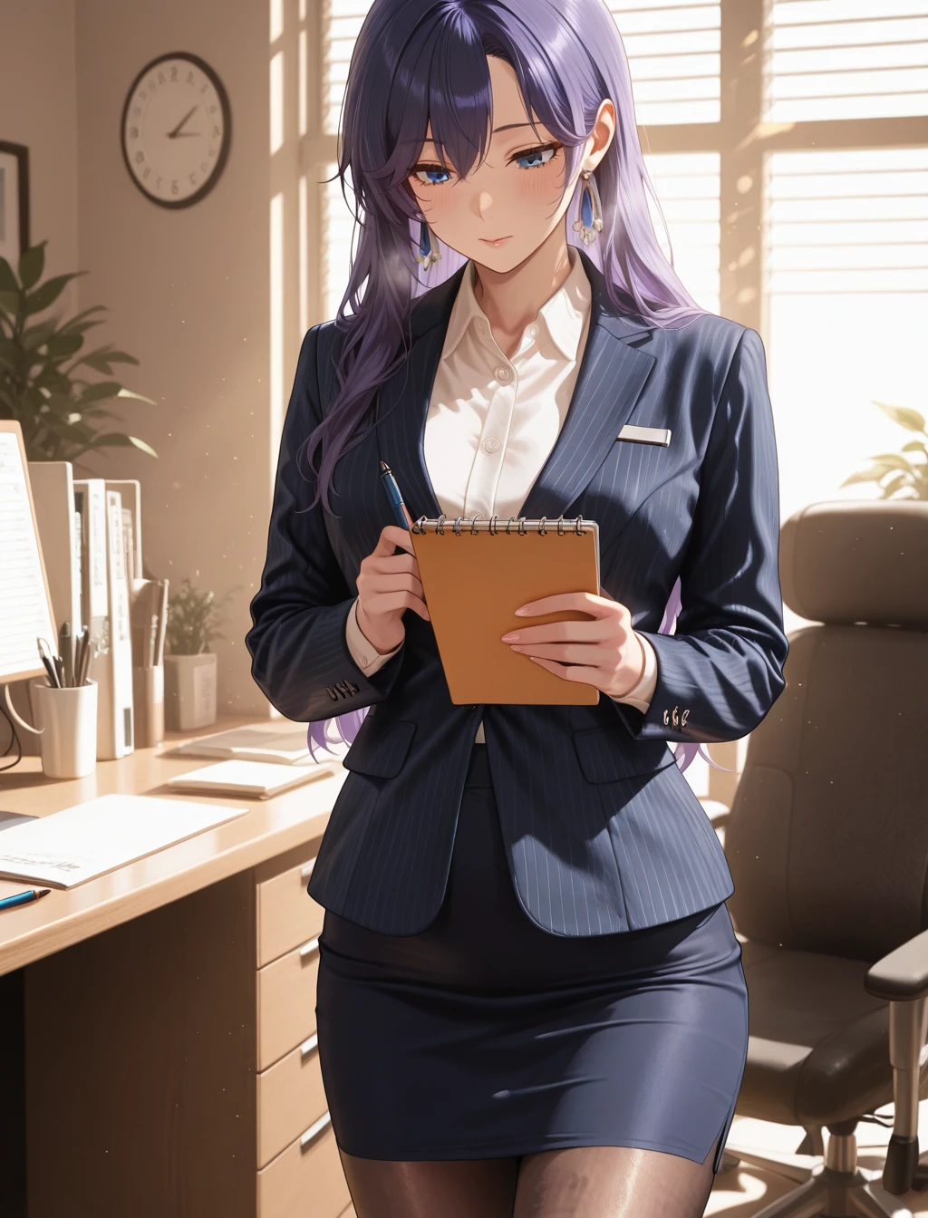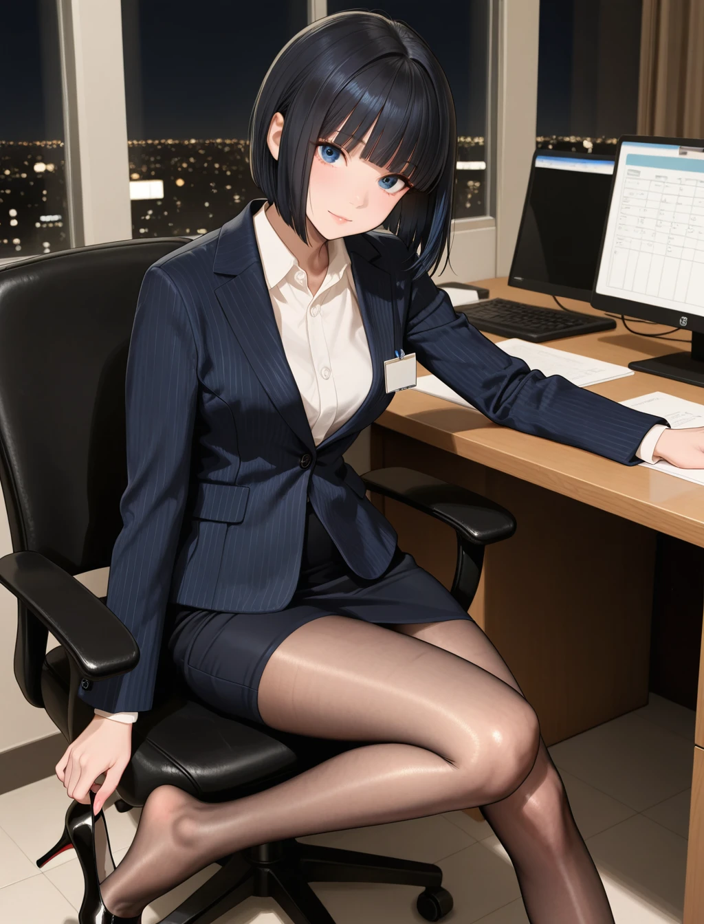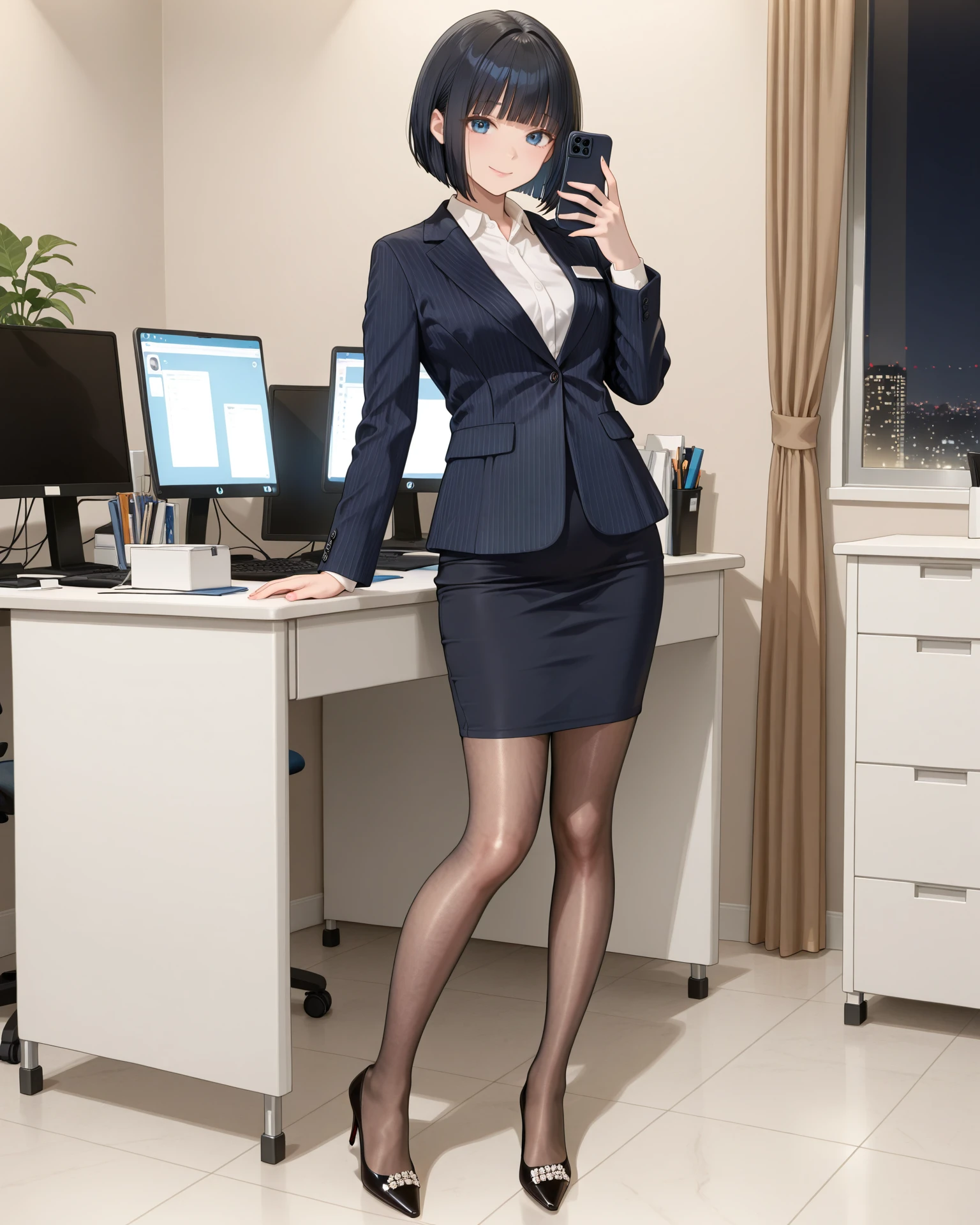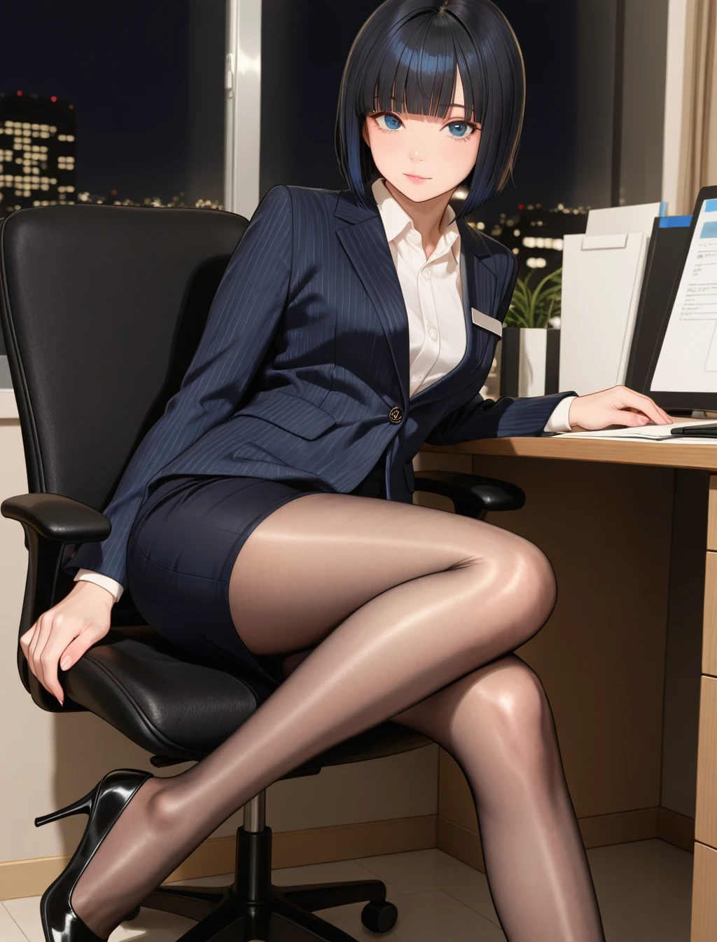 office lady suit,dark blue pinstripe jacket,white collared shirt,long sleeves,dark blue pencil skirt,