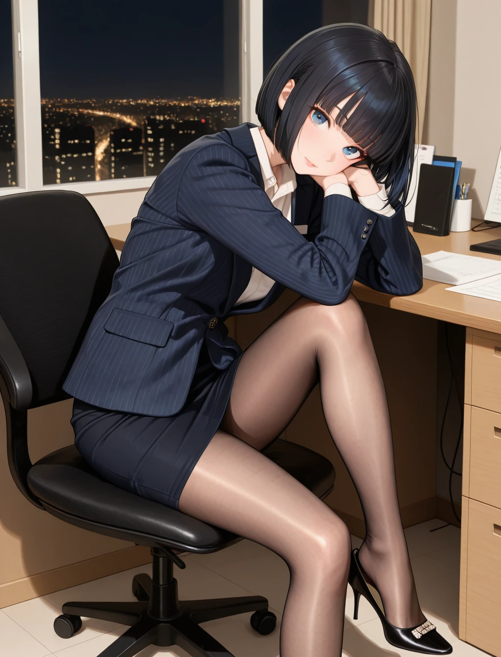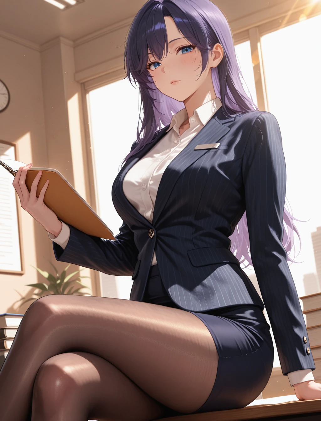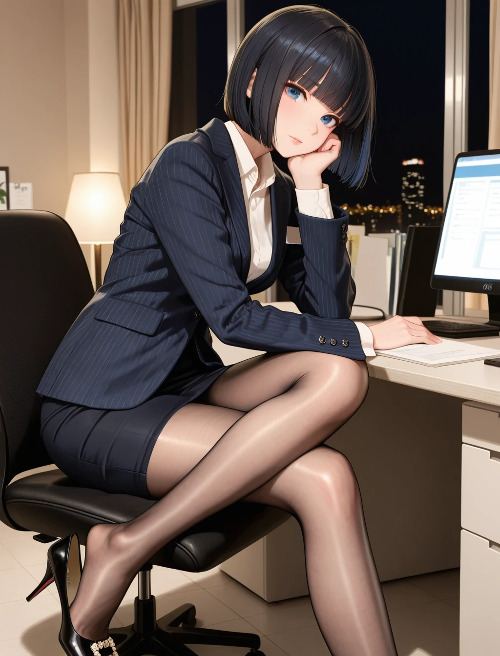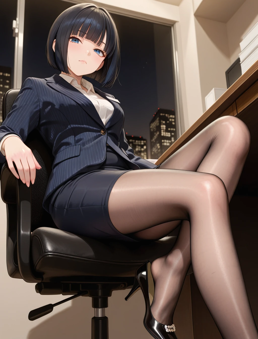 office lady suit,dark blue pinstripe jacket,white collared shirt,long sleeves,dark blue pencil skirt,