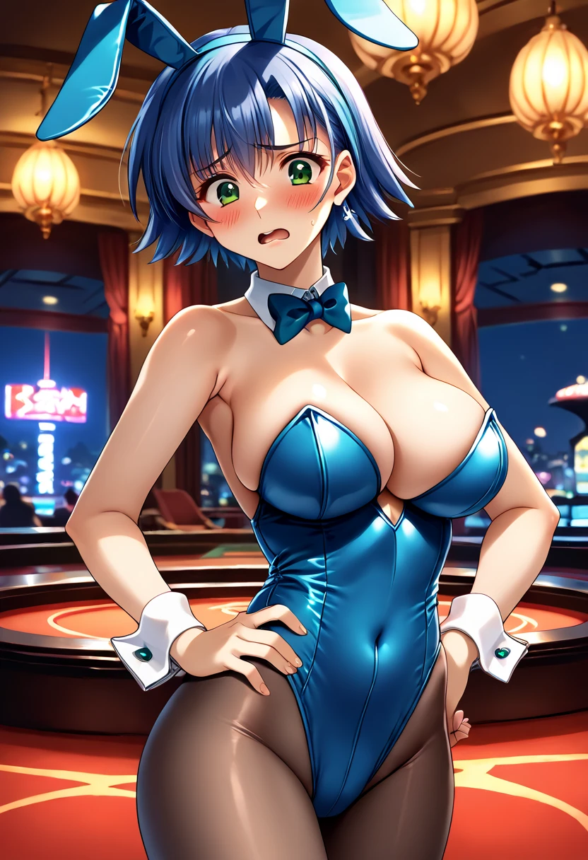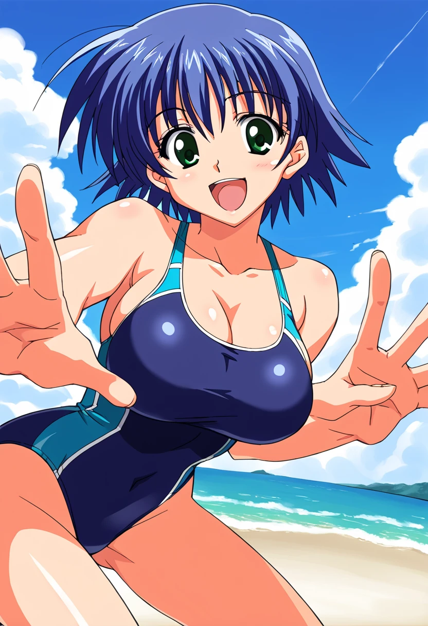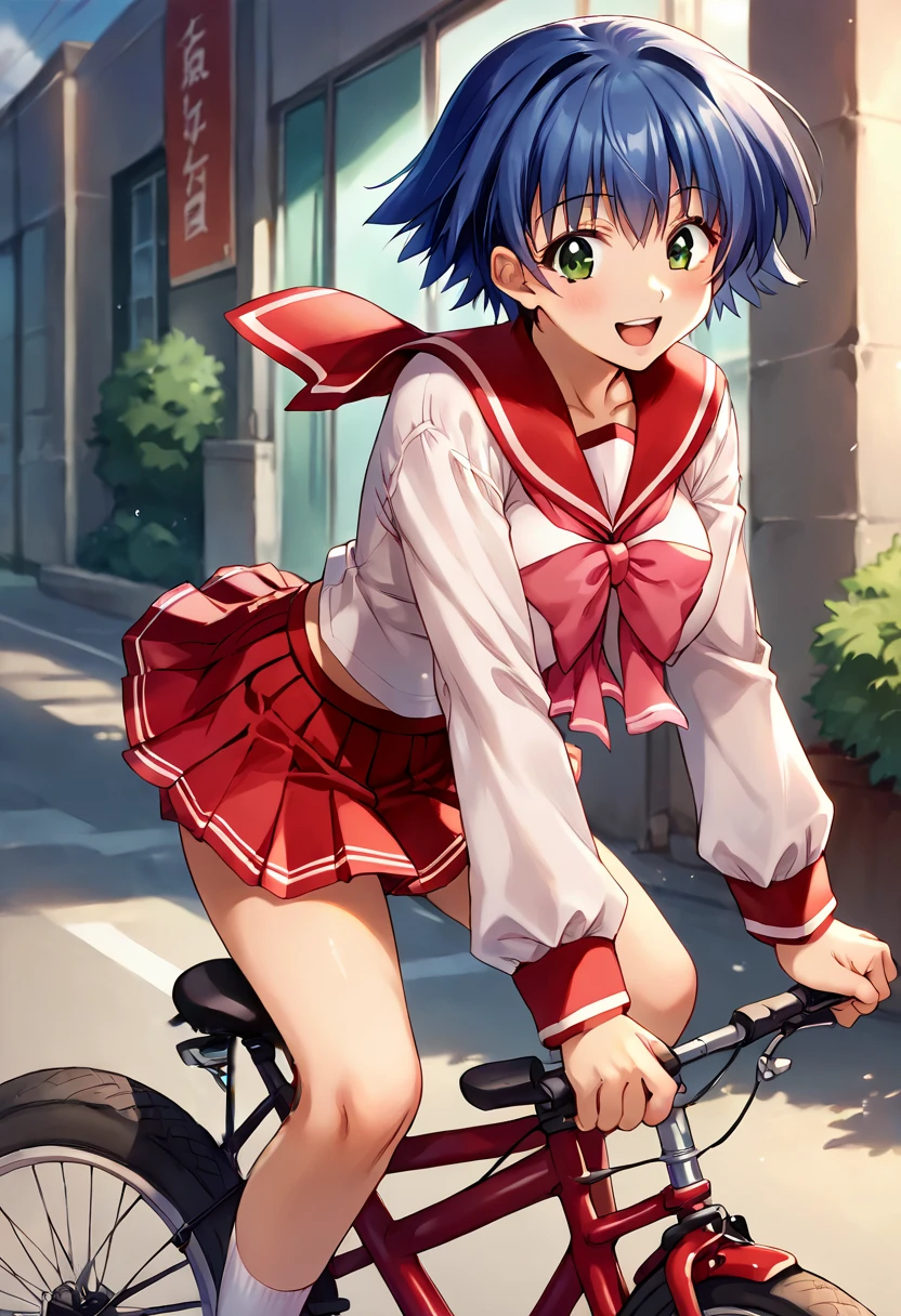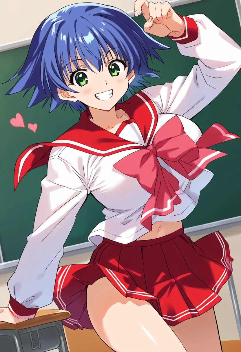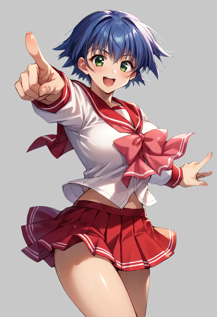 school uniform, serafuku, red sailor collar, pink bowtie, long sleeves, red skirt, mini skirt, large breasts, blue hair, bangs, short hair, dark green eyes