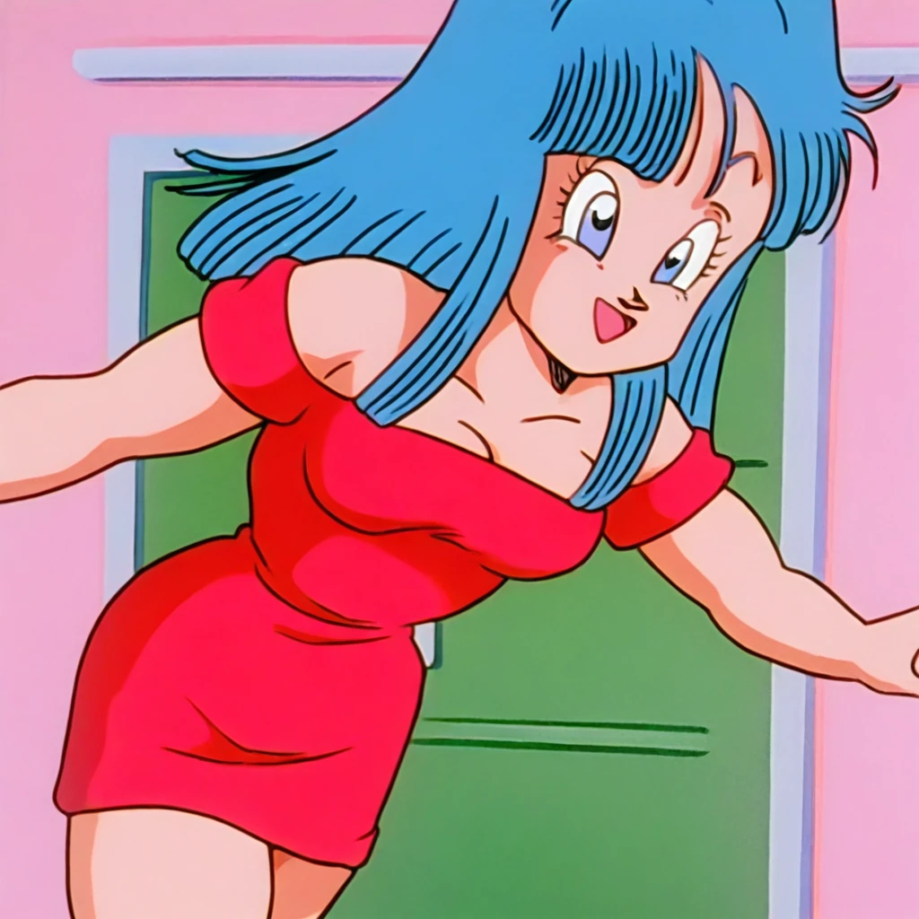 maron dbz anime style, retro artstyle, blue hair, long hair, straight hair, sidelocks, blue eyes, eyelashes, medium breasts,