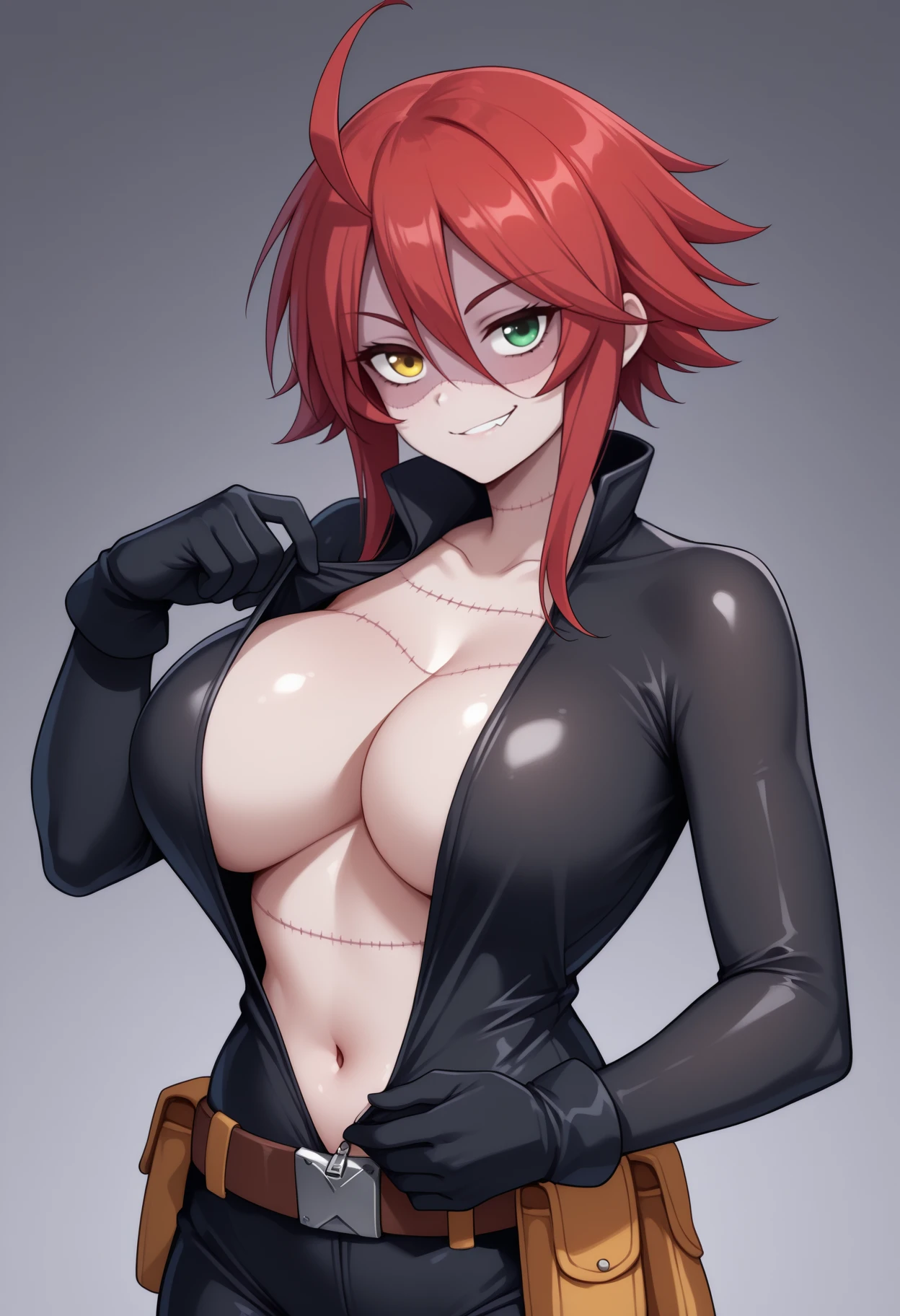 Trigger + Appearance: mmzombina, zombie, stitches, patchwork skin, sharp teeth, red hair, ahoge, heterochromia, yellow eyes, green eyes