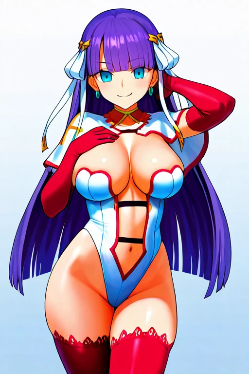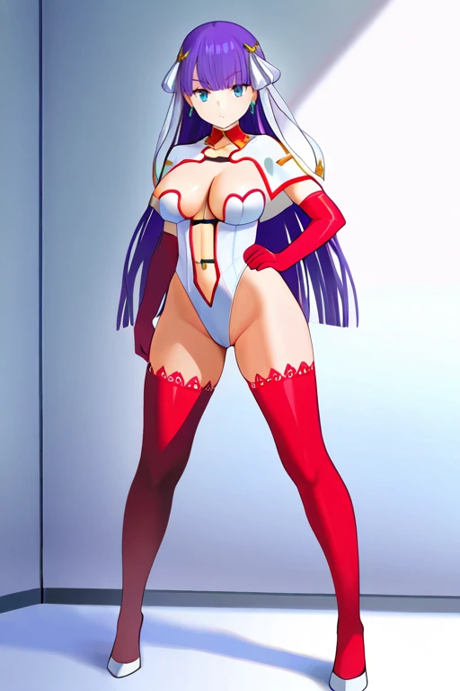 large breasts, marthardef, red Neck collar, white capelet, cleavage, highleg leotard, white leotard, center opening, navel, elbow gloves, red gloves, thighhighs, red thighhighs,