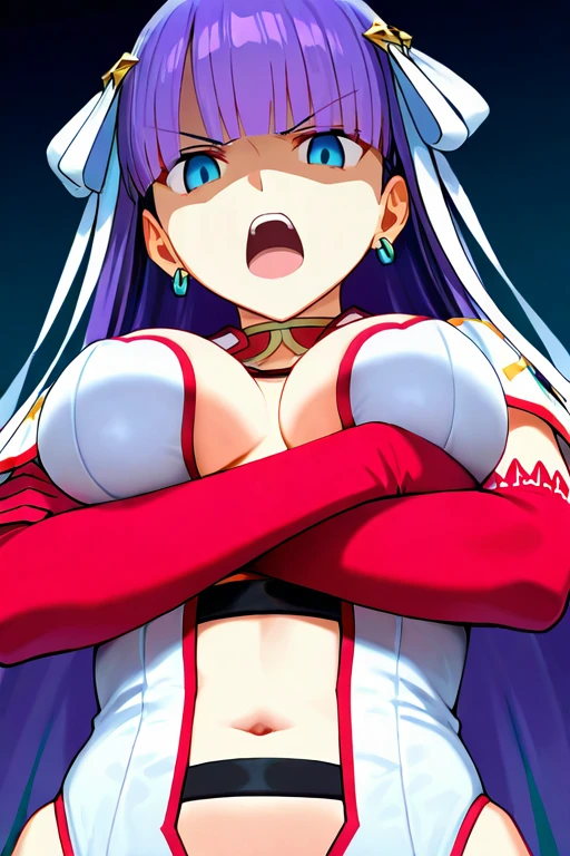 1girl, solo, rider_martha_(fate), long hair, purple hair, jewelry, hair ribbon, blunt bangs, blue eyes, earrings,