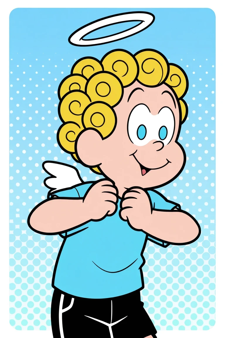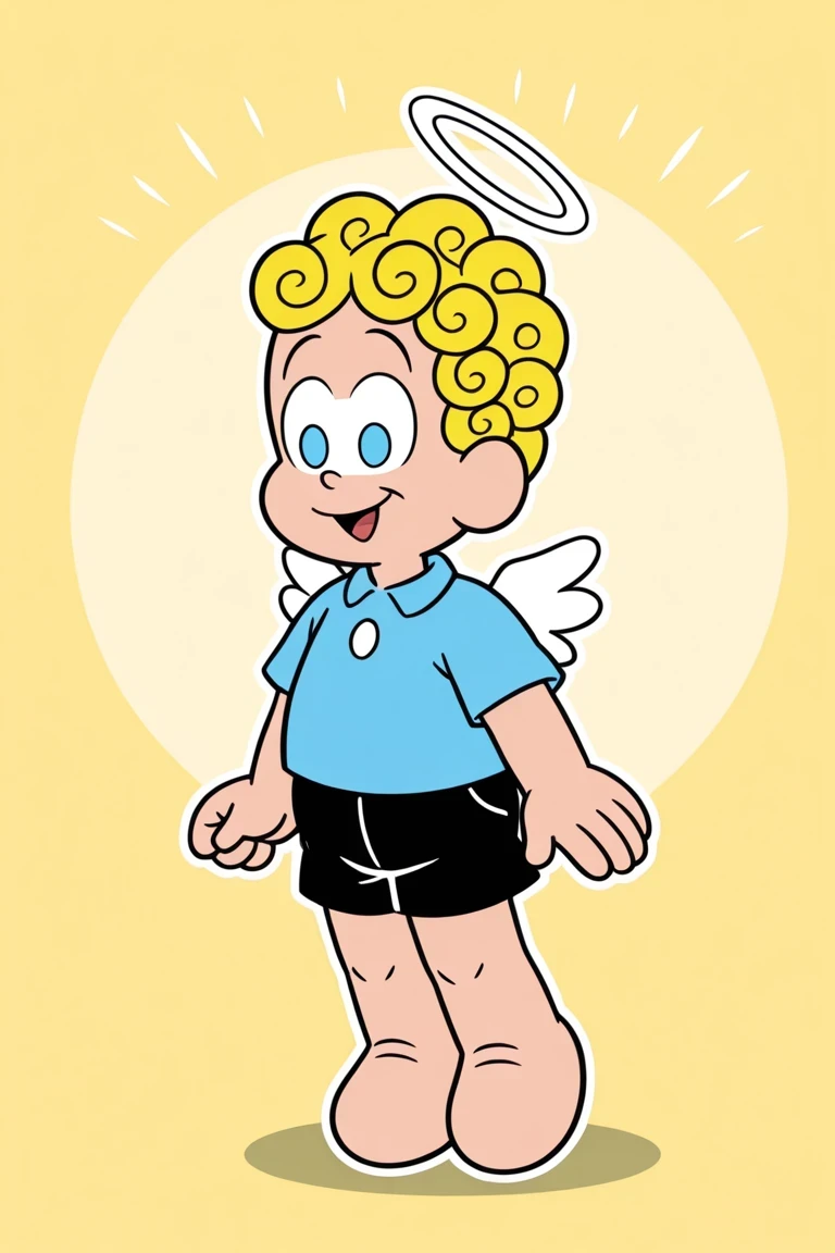 AnjinhoTDM, 1boy, white halo above head, curly golden-yellow hair, light blue eyes, big cartoonish eyes, oval shaped eyes, light-blue shirt, Small white wings, short, chibi