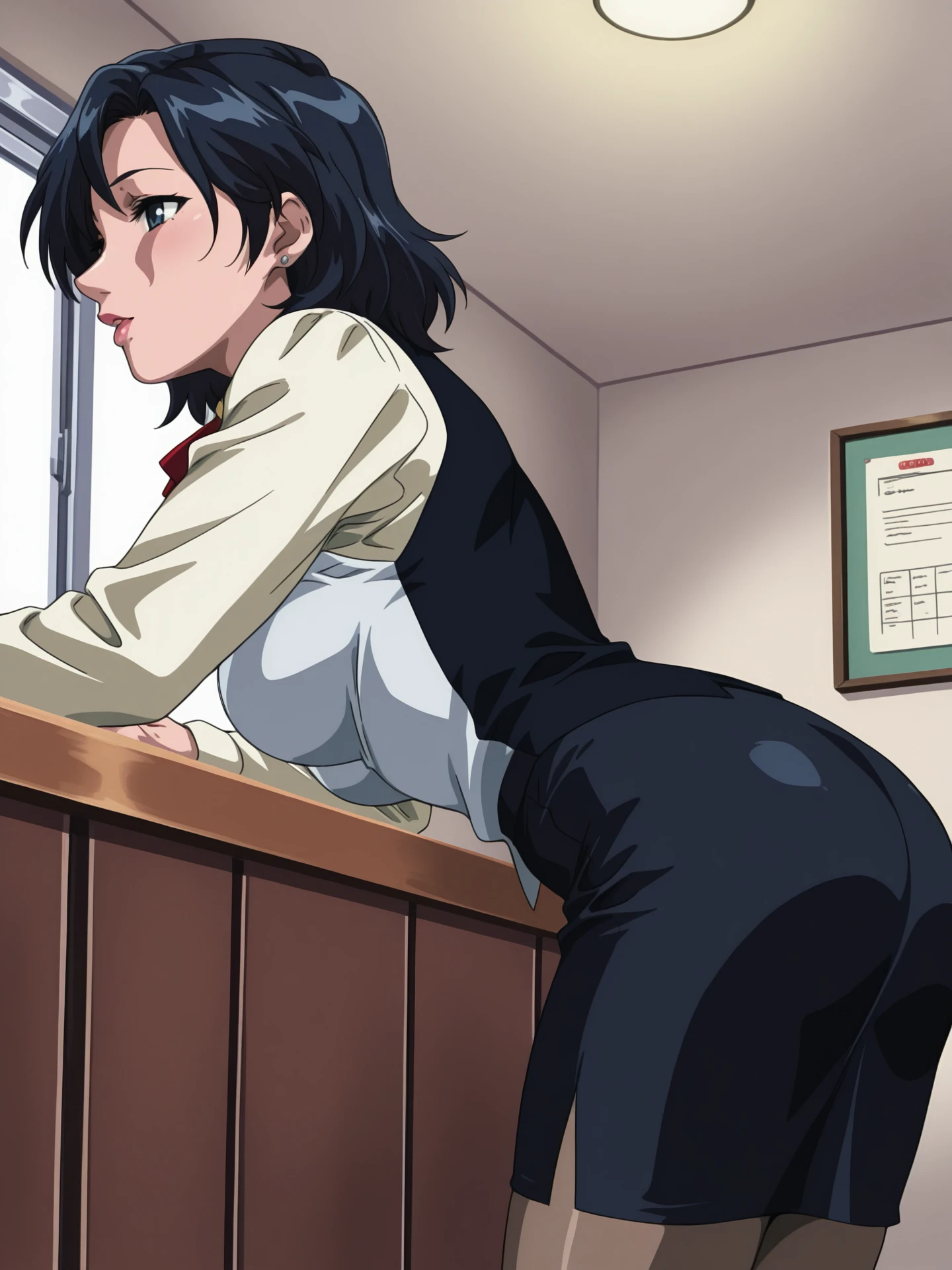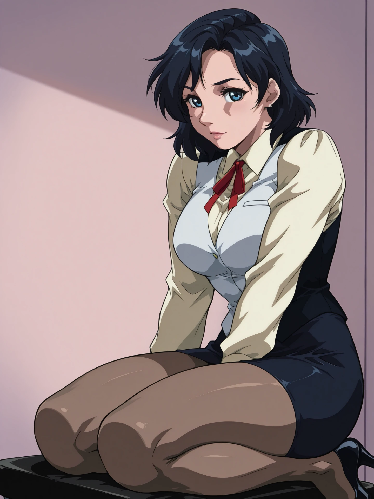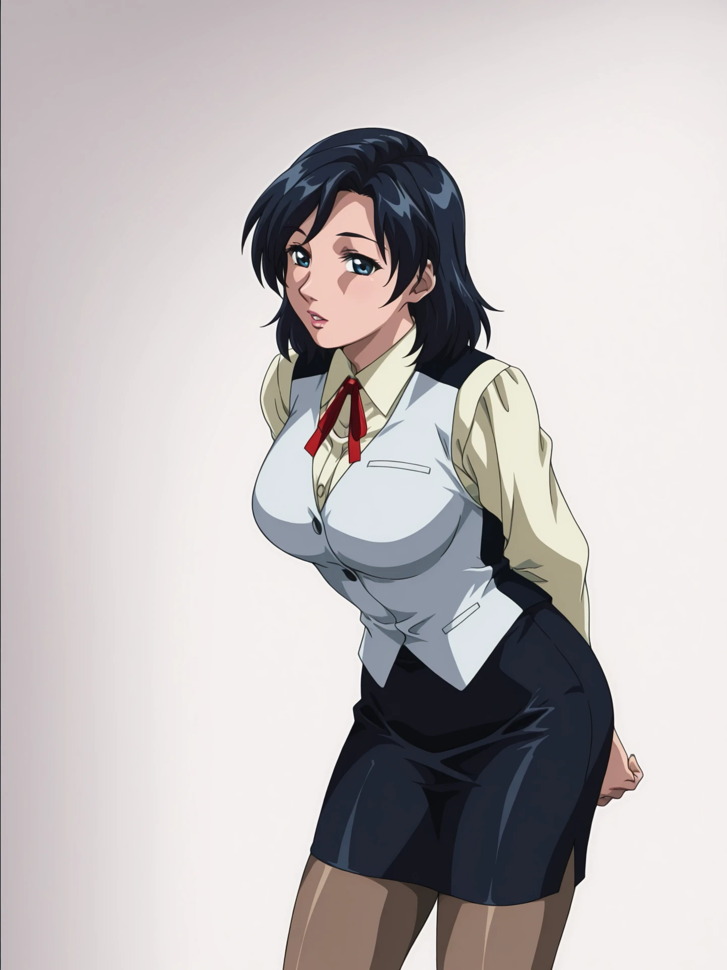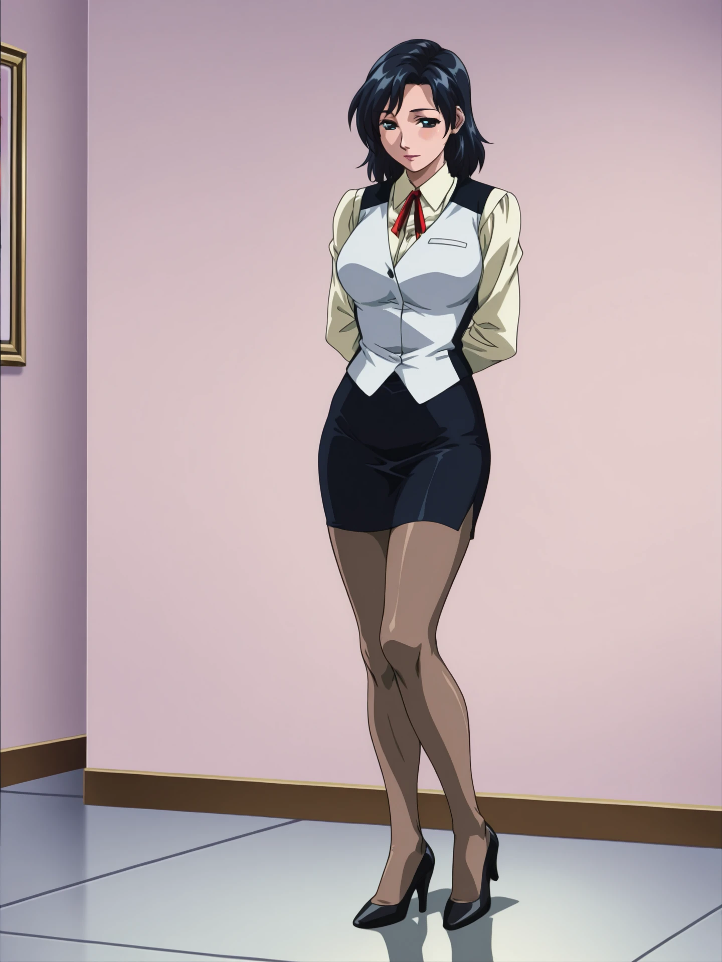 Yellow collared shirt, Bank waistcoat, red neck ribbon, blue pencil skirt, pantyhose, highheels