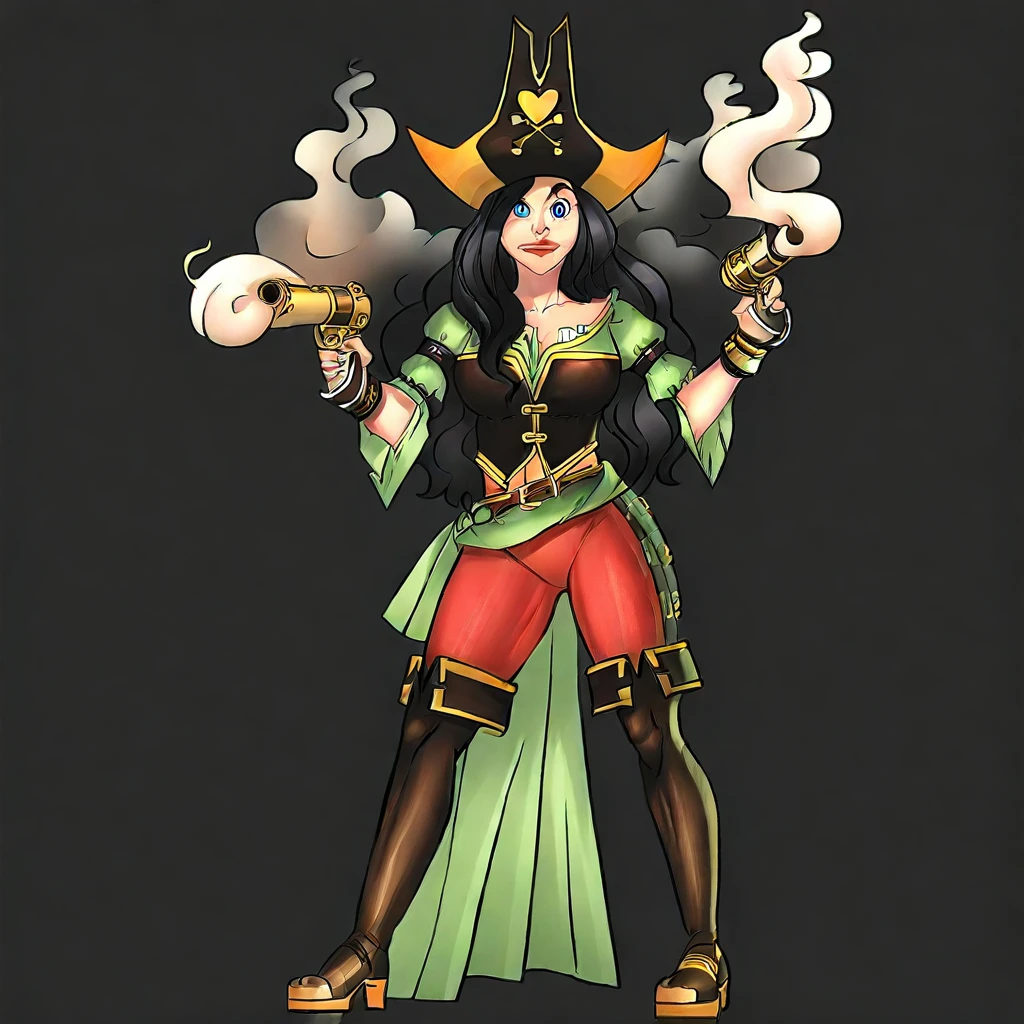 1girl, samantha, black hair, blue eyes, orage pirate hat, brown details on pirate hat, pirate clothes, brown details on pirate clothes, green details on pirate clothes, yellow details on pirate clothes, red pants, brown belt,yellow details on belt, brown boots, yellow details on boots, brown bracelet,