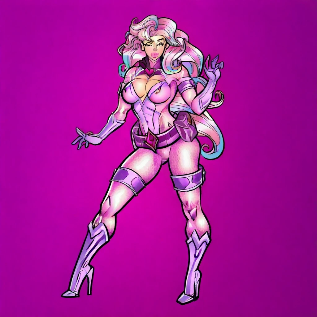 1girl, joenna, pink eyebrown, blue eyes, pink lips, multi colored hair, pink hair, gray details on hair, purple details on hair, pink bodysuit, clevage, purple details on bodysuit, purple belt, heart on belt, purple gloves, purple high heels,