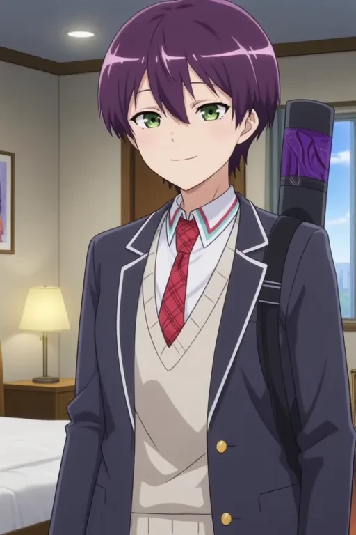Trigger Word:Kenmochi Toya, anime-style boy. The image features a character with short, dark purple hair styled in a casual manner. The character has green eyes and is wearing a school uniform consisting of a white shirt, a red tie, and a dark blazer with gold buttons.The character is also carrying a black backpack with a purple design.