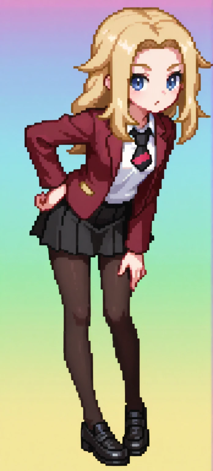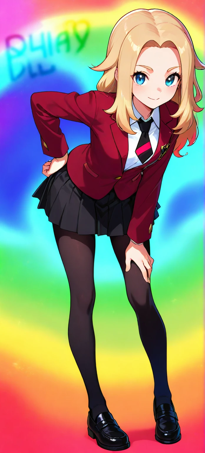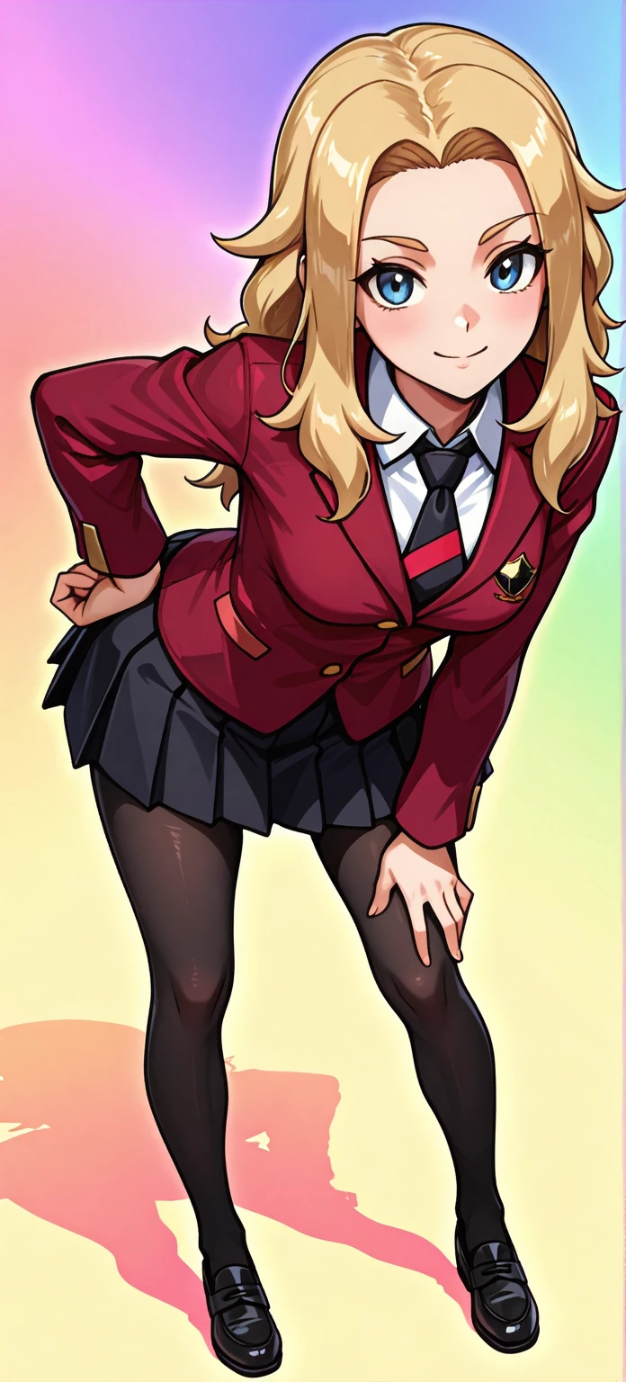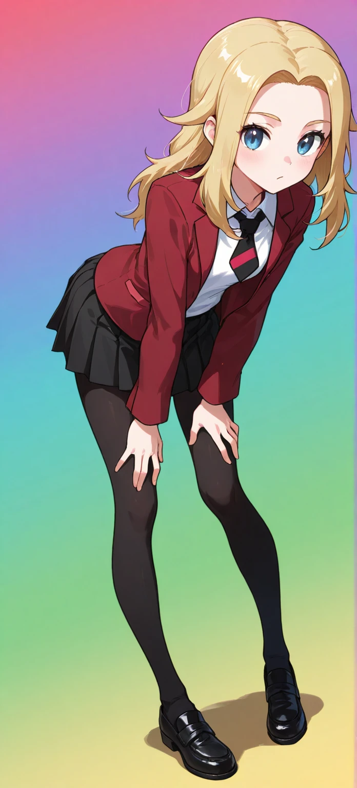 collared shirt, white shirt, blazer, red jacket, , long sleeves, emblem, black necktie, short necktie, striped necktie, single stripe, black skirt, miniskirt, pleated skirt, black pantyhose, loafers, black footwear